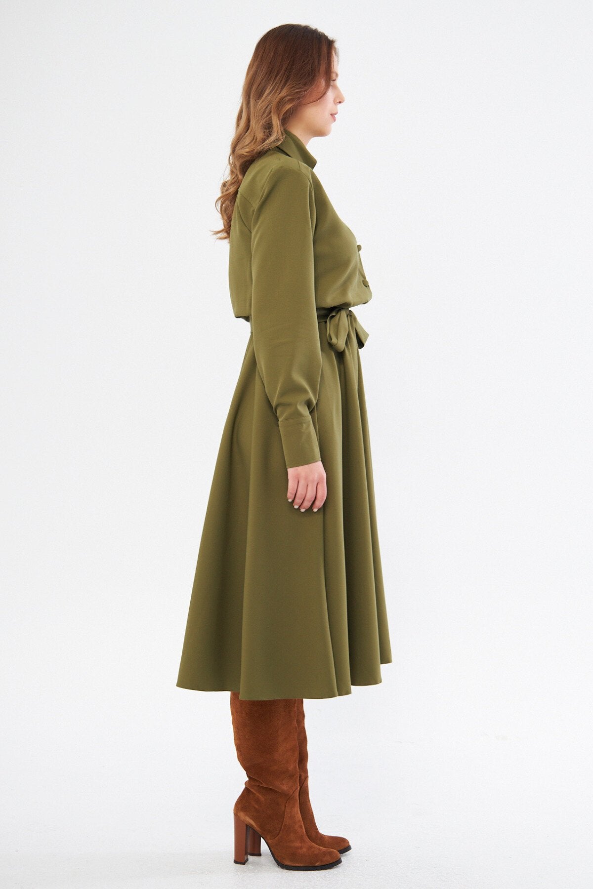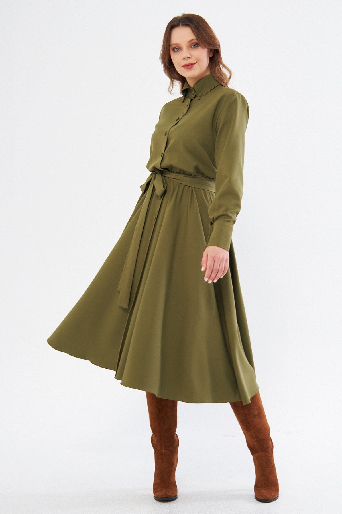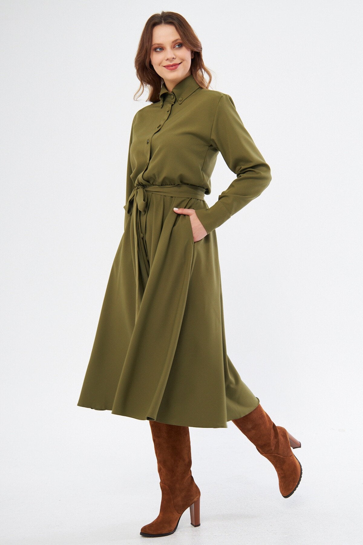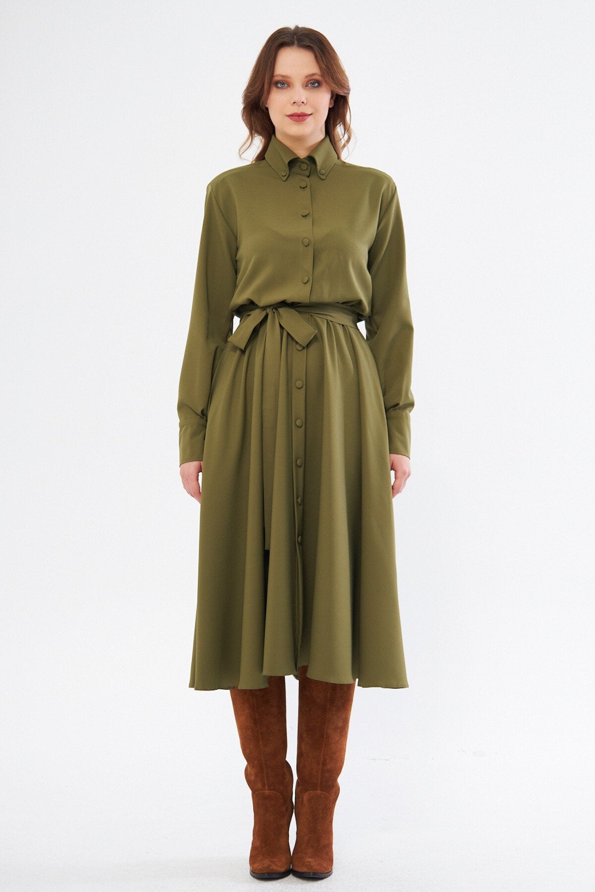This midi long sleeve shirt dress captures a sophisticated blend of classic tailoring and modern femininity. The rich khaki hue provides a versatile neutral base, while the structured collar and full-button front lend a polished look that transitions effortlessly from professional settings to social gatherings.