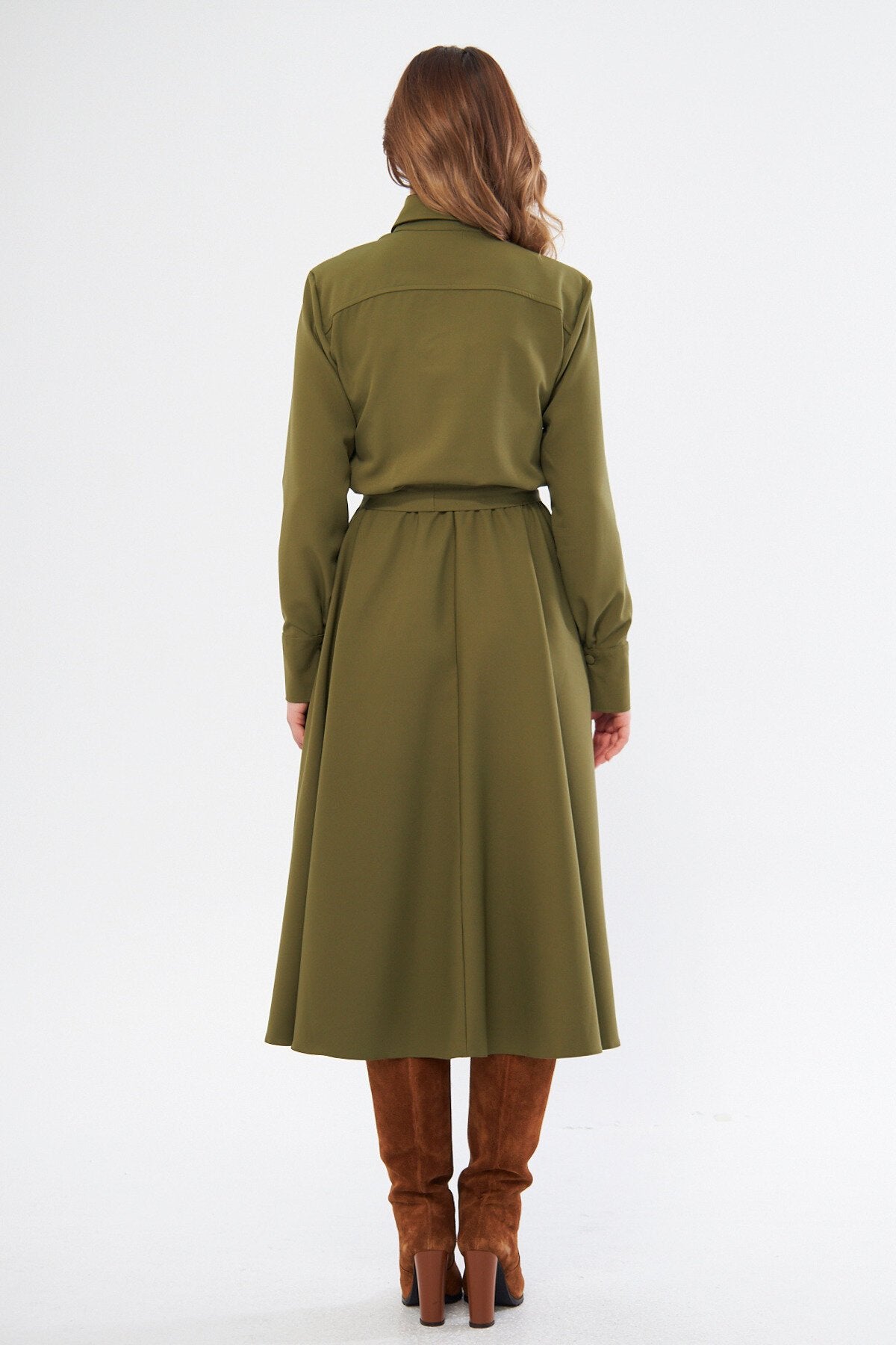 Designed for the modern woman who values both style and practicality, this khaki midi dress is a true wardrobe workhorse. Its understated elegance makes it an ideal choice for a variety of settings, allowing you to feel confident and perfectly put-together wherever your day takes you.