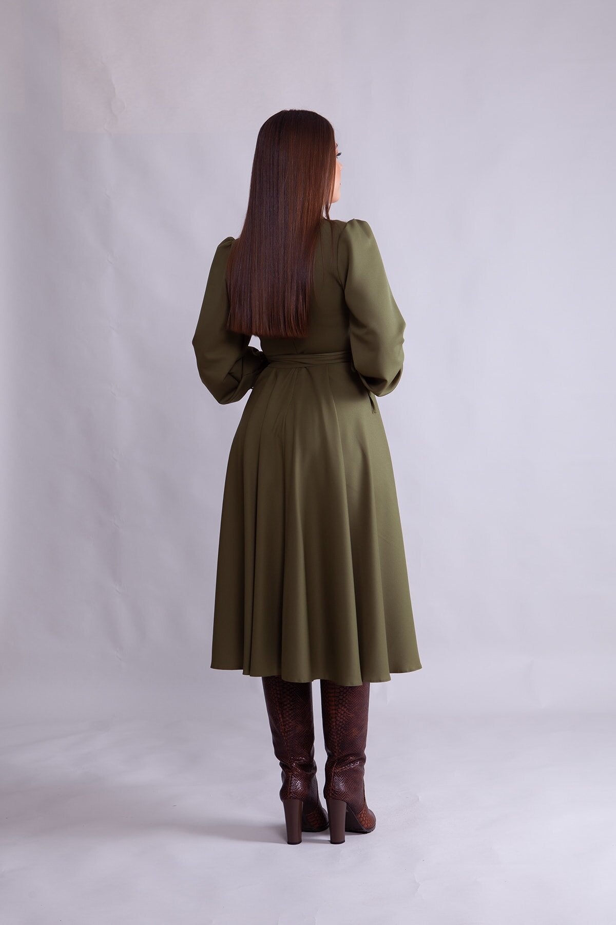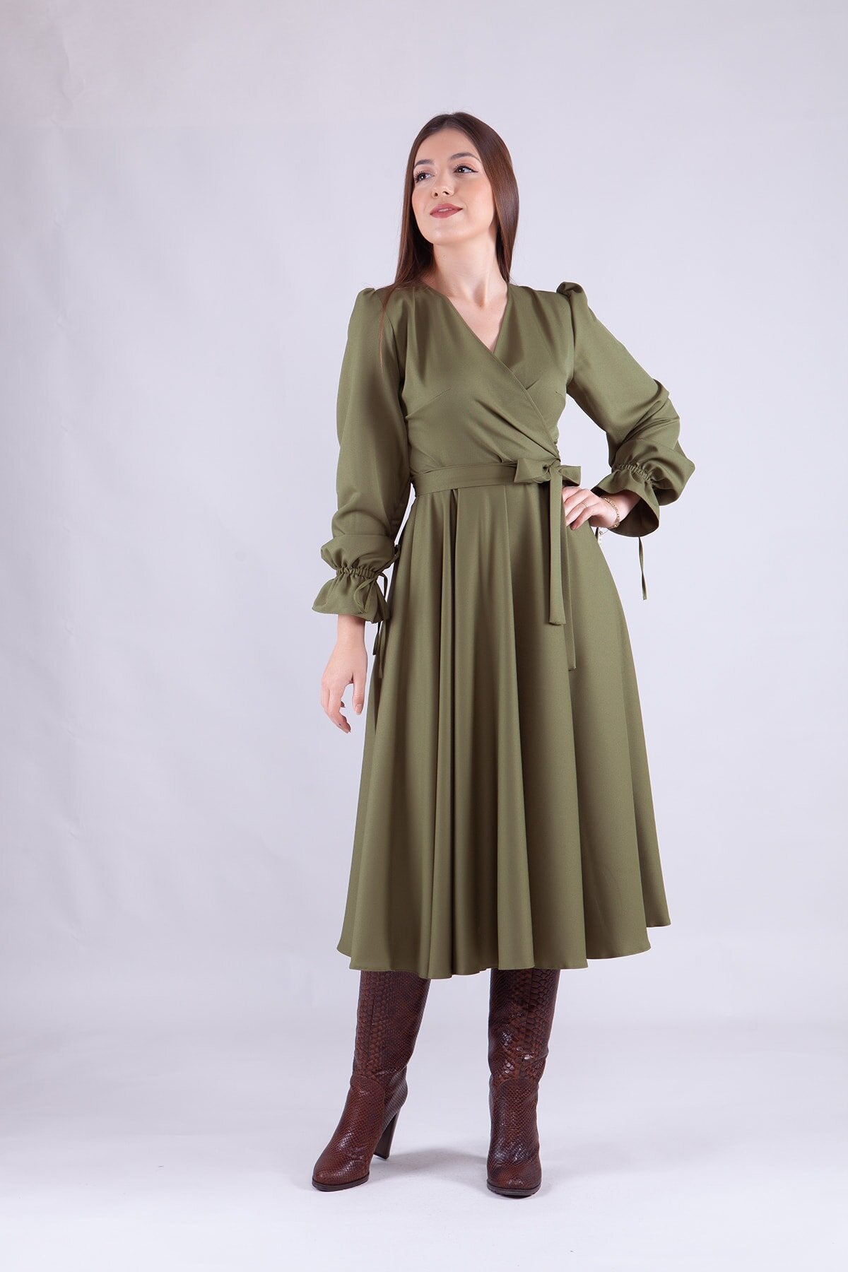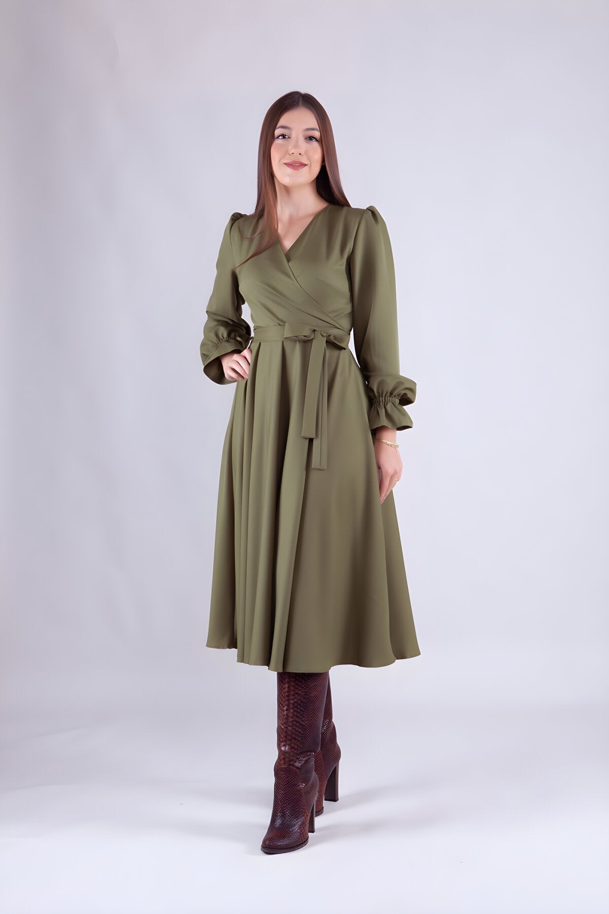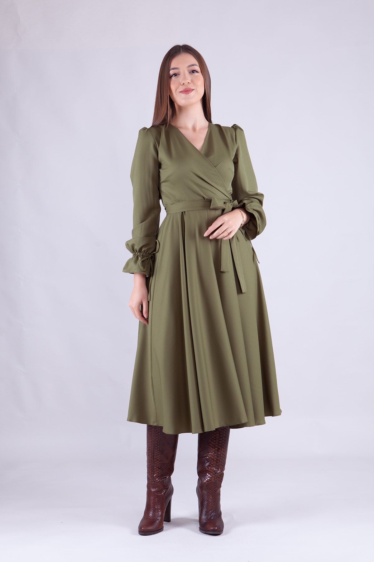 Midi Long-Sleeve Wrap Neck Dress - Khaki