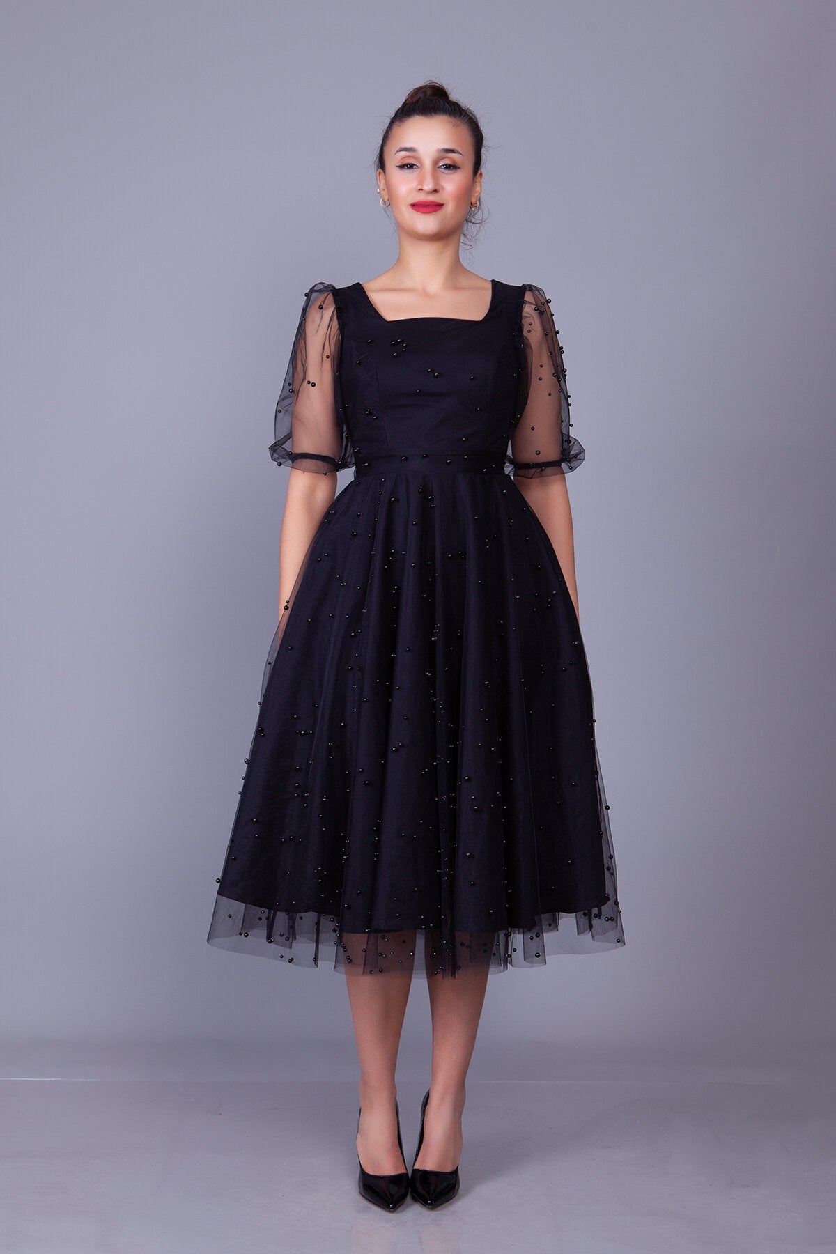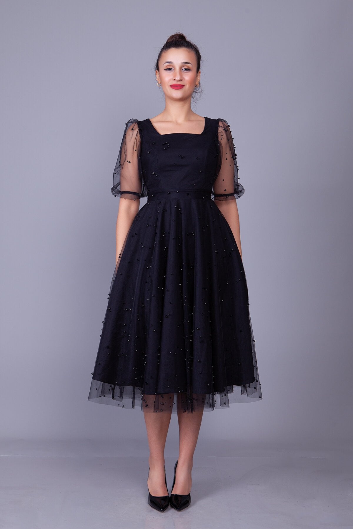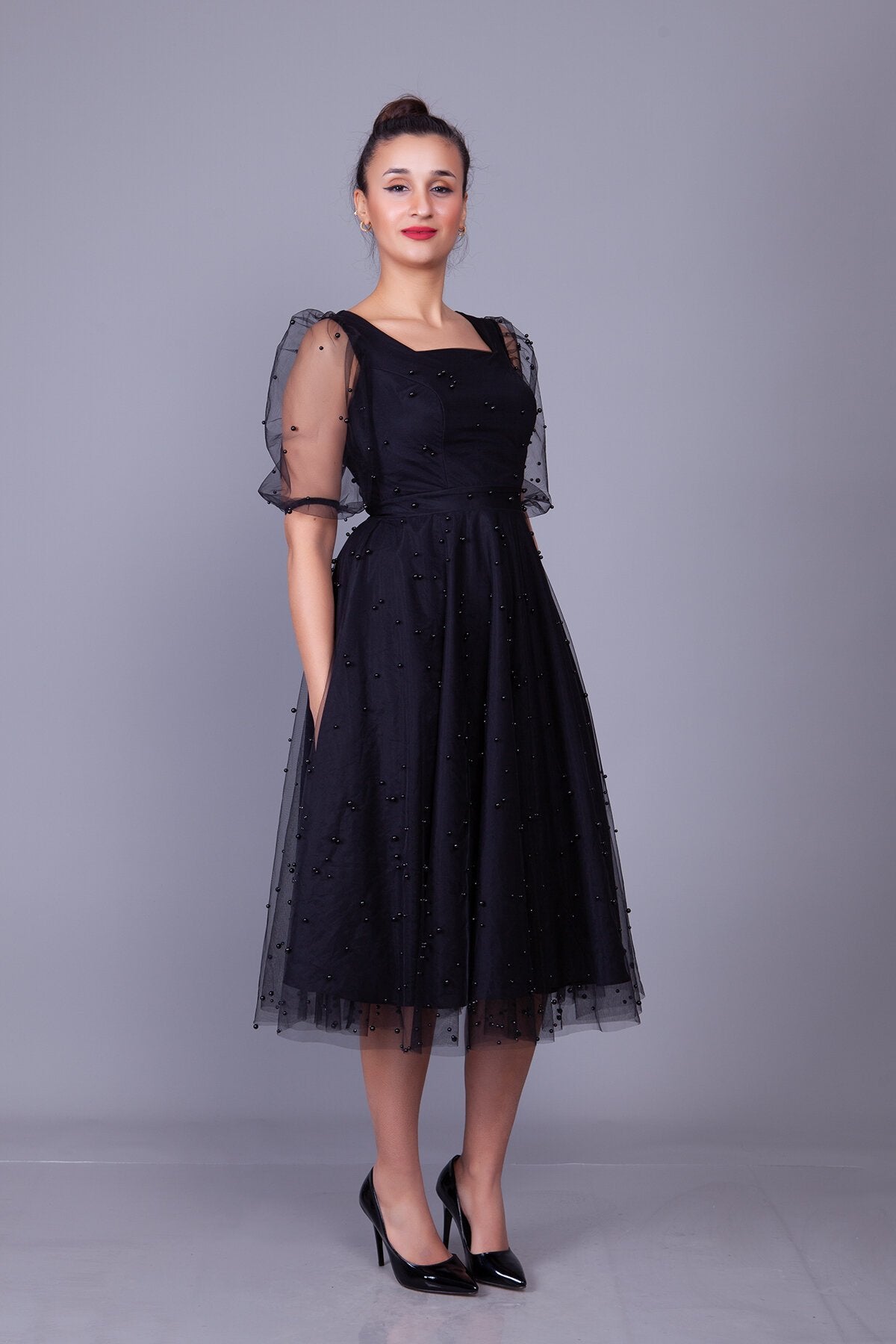 Midi Pearl Tulle Overlay Evening Dress - Black