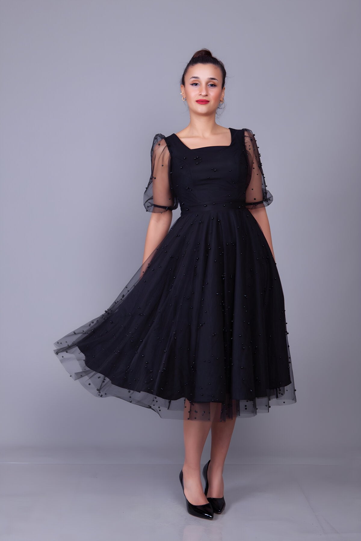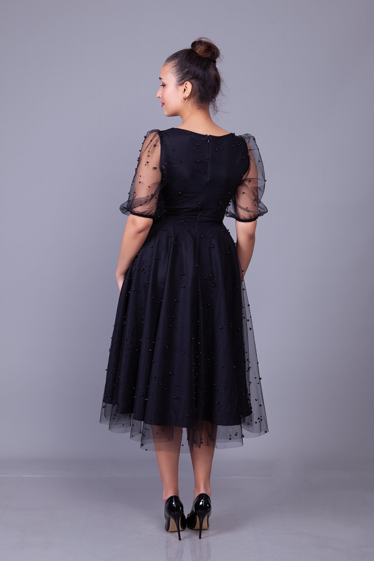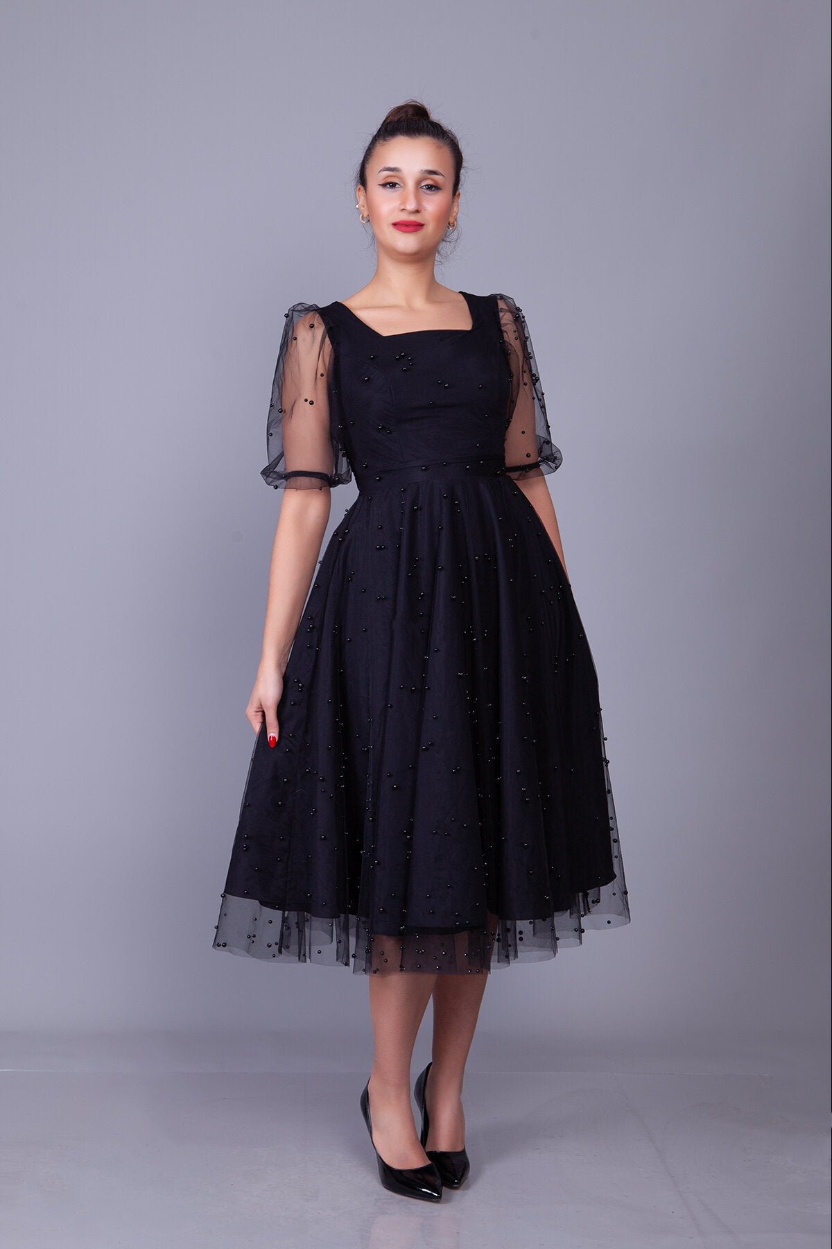 Midi Pearl Tulle Overlay Evening Dress - Black