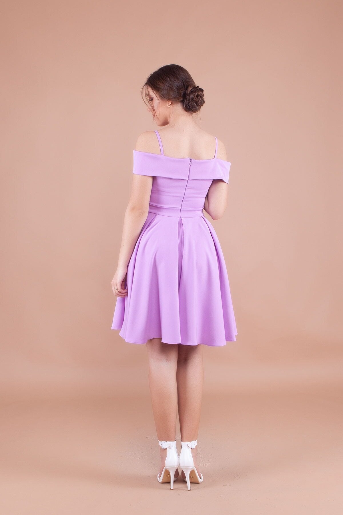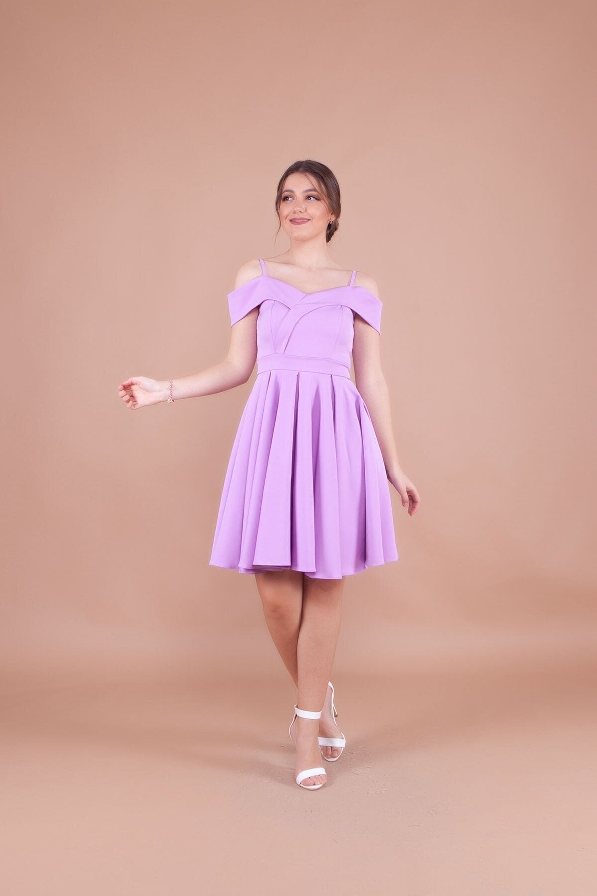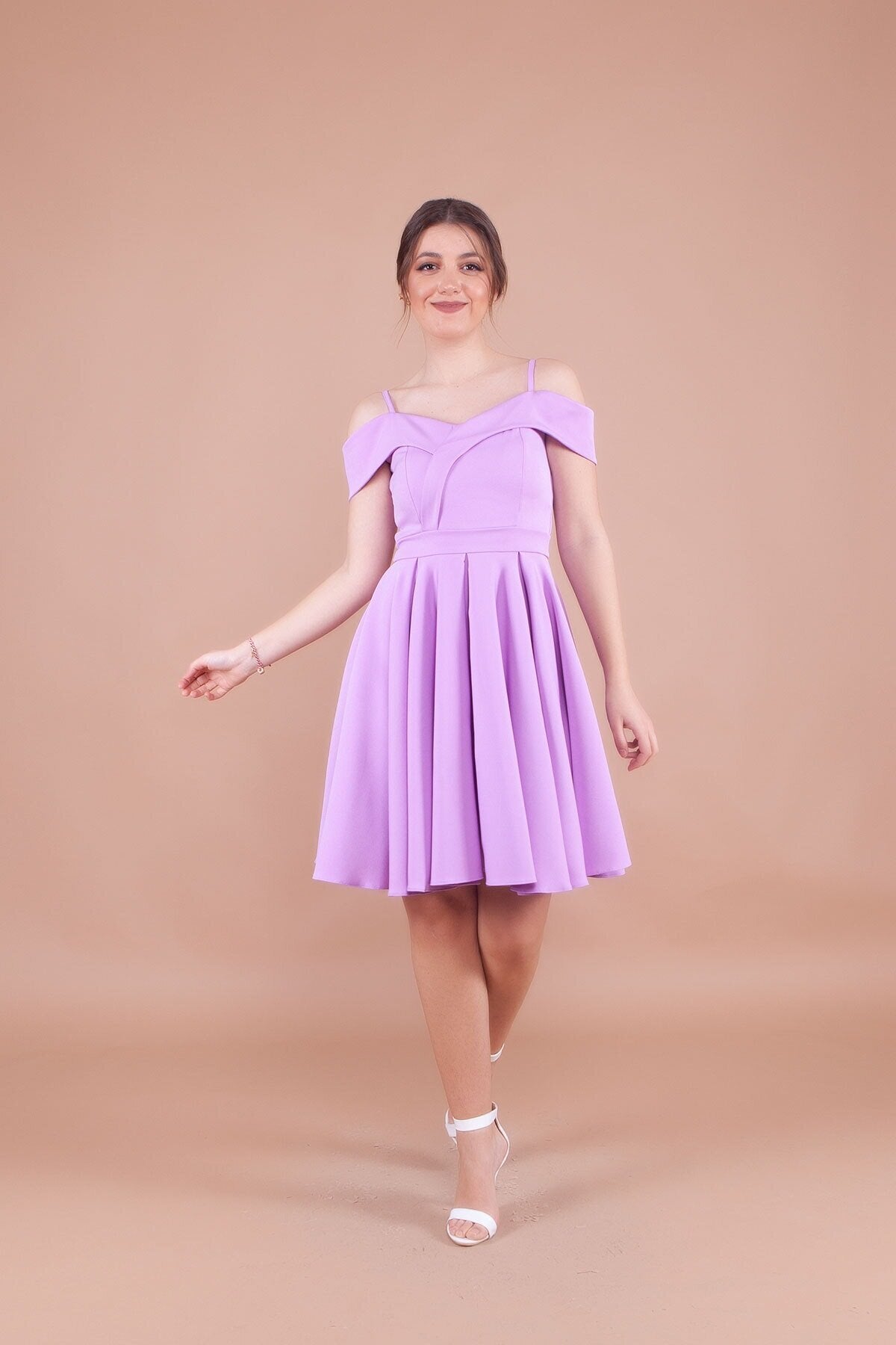 This lilac evening dress captures the essence of modern romance with its voluminous silhouette and delicate shoulder detailing. Designed to make a statement, it blends a structured bodice with a playful, flared skirt for a look that is both sophisticated and endlessly charming.