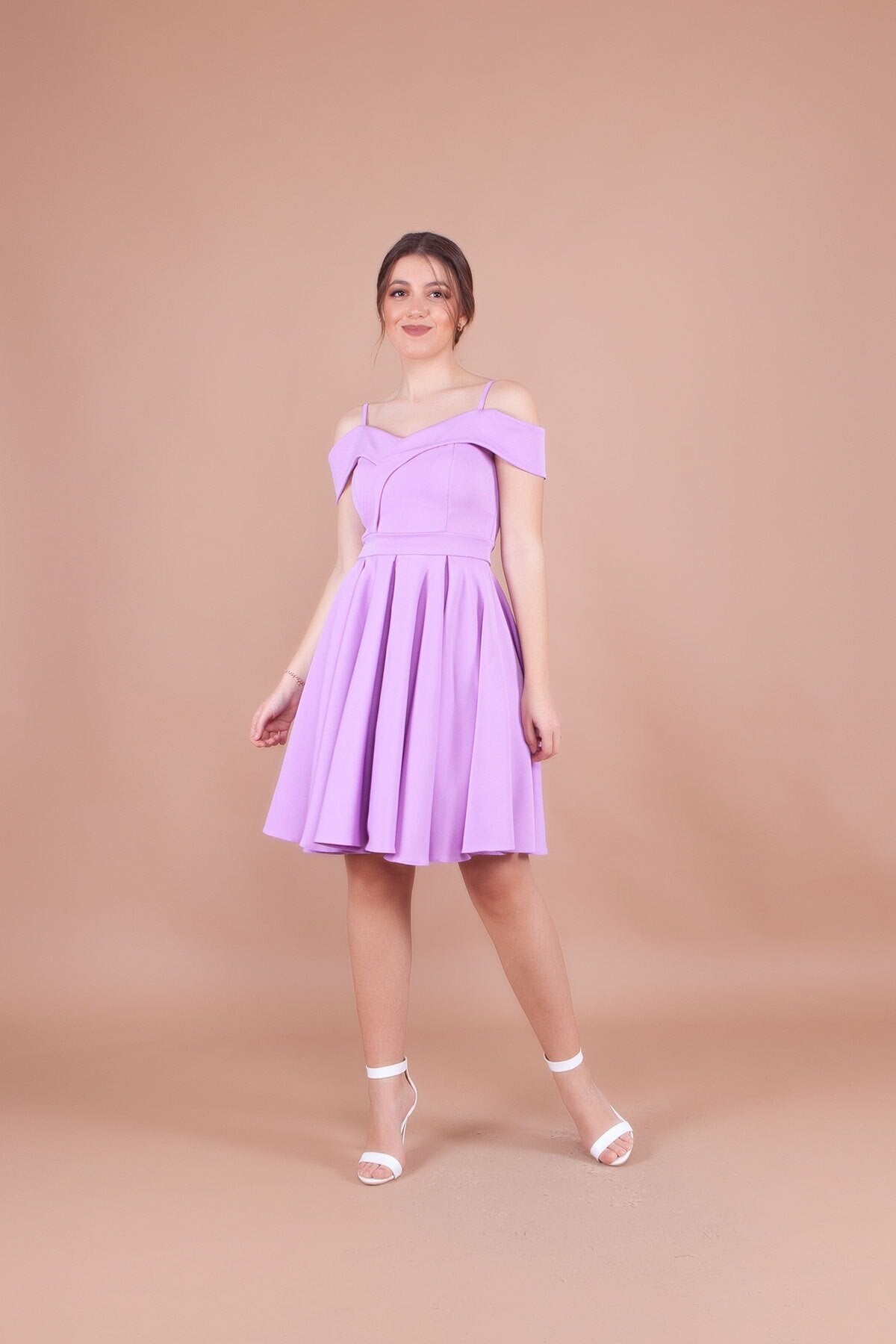 Midi Pleated Strappy Off-Shoulder Evening Dress - Lilac