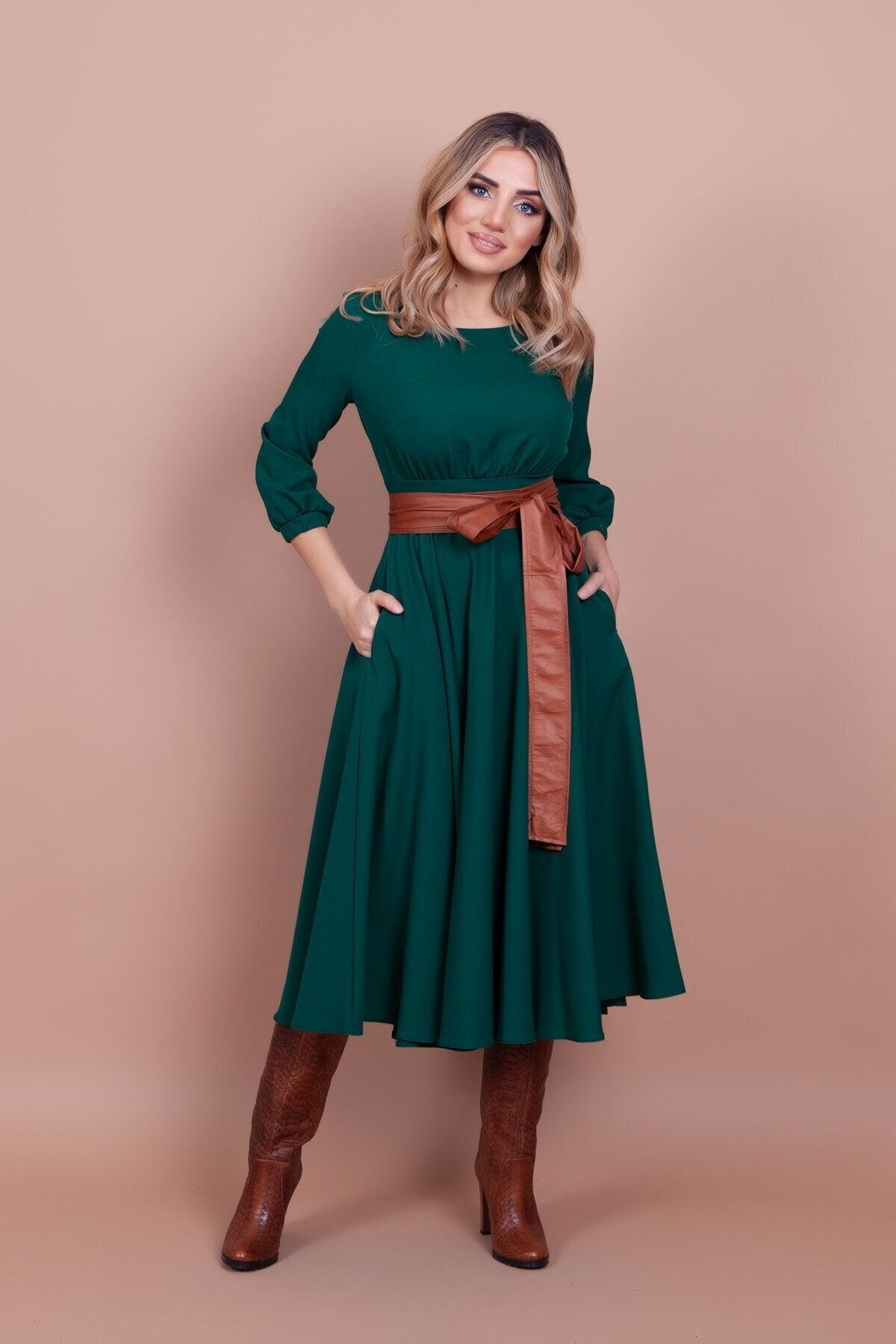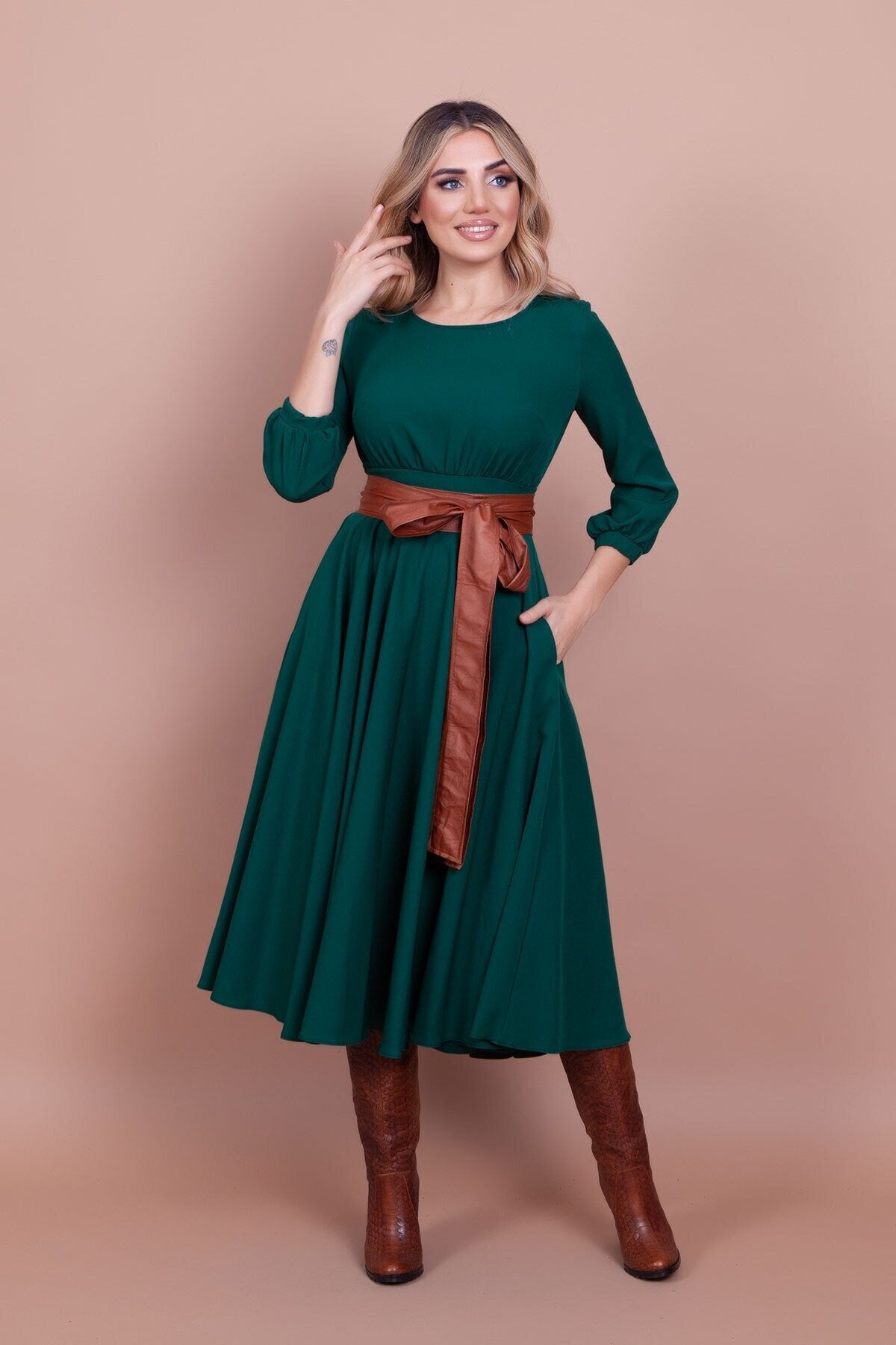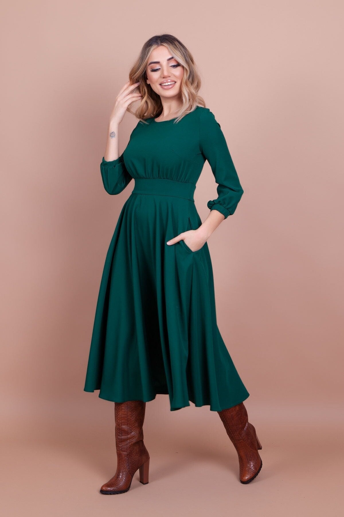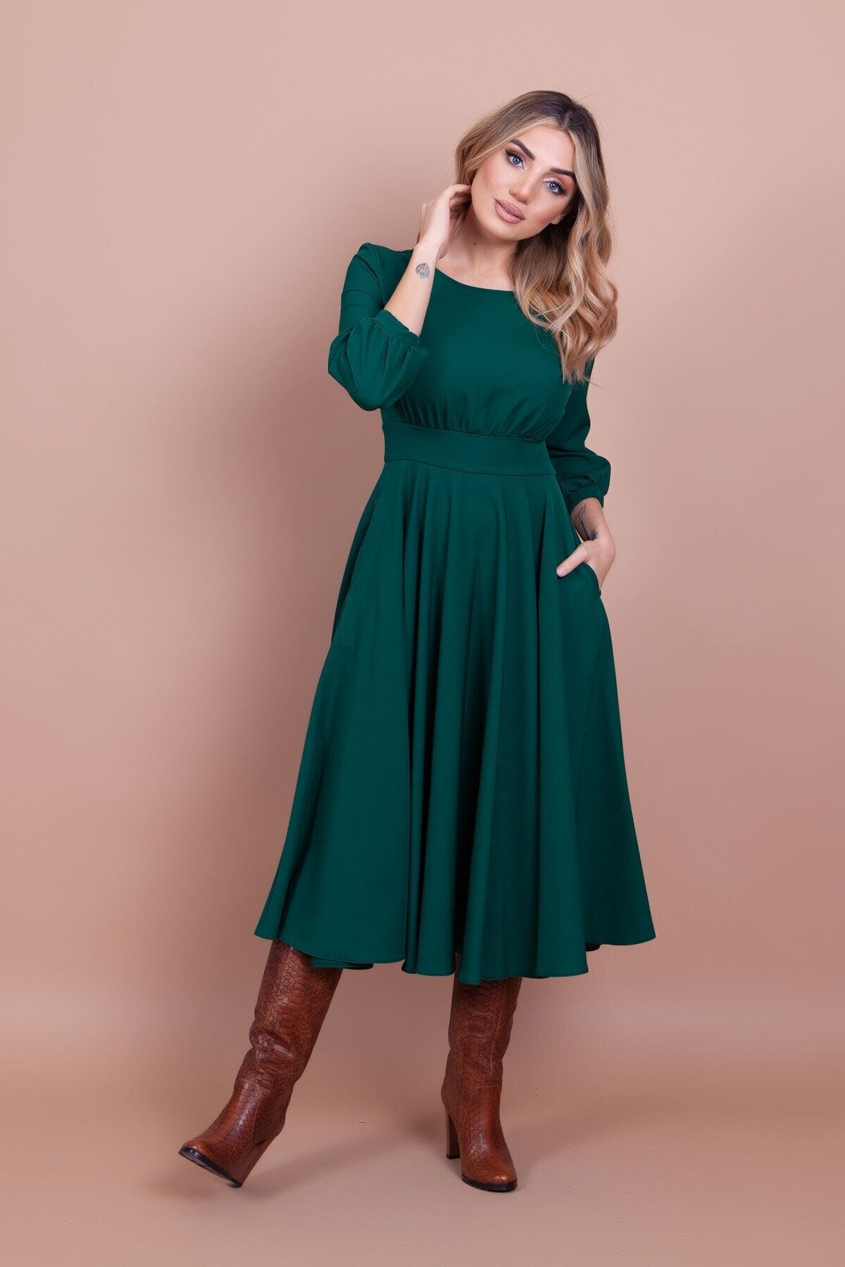 Midi Round-Neck Pocket-Detail Dress - Emerald
