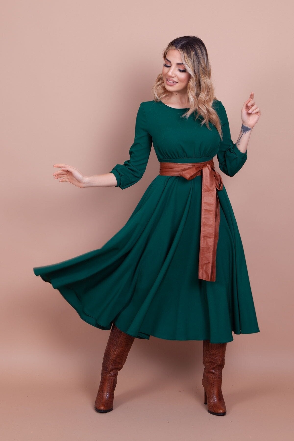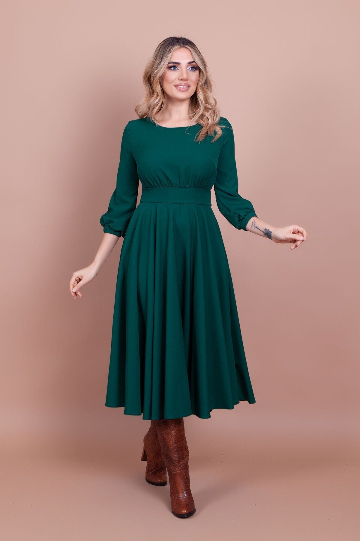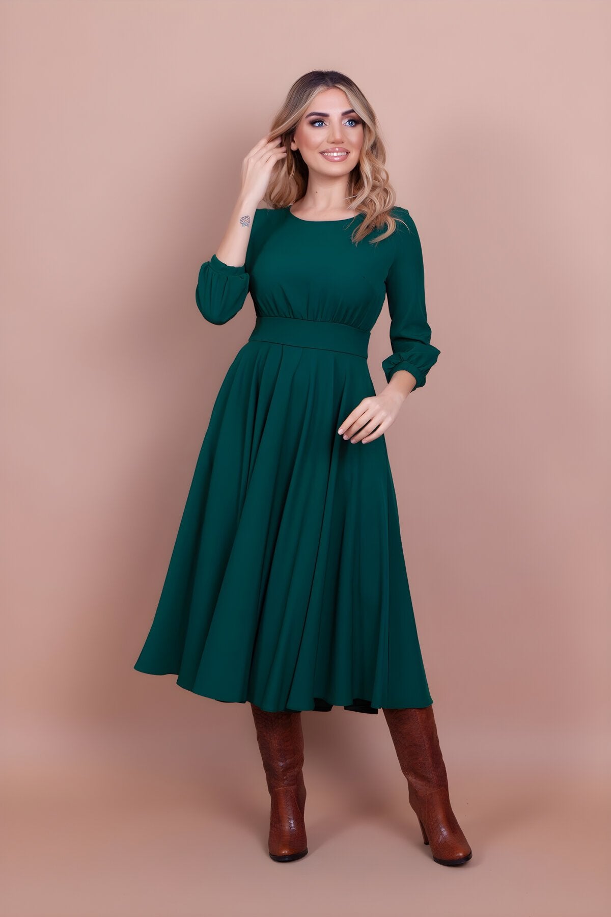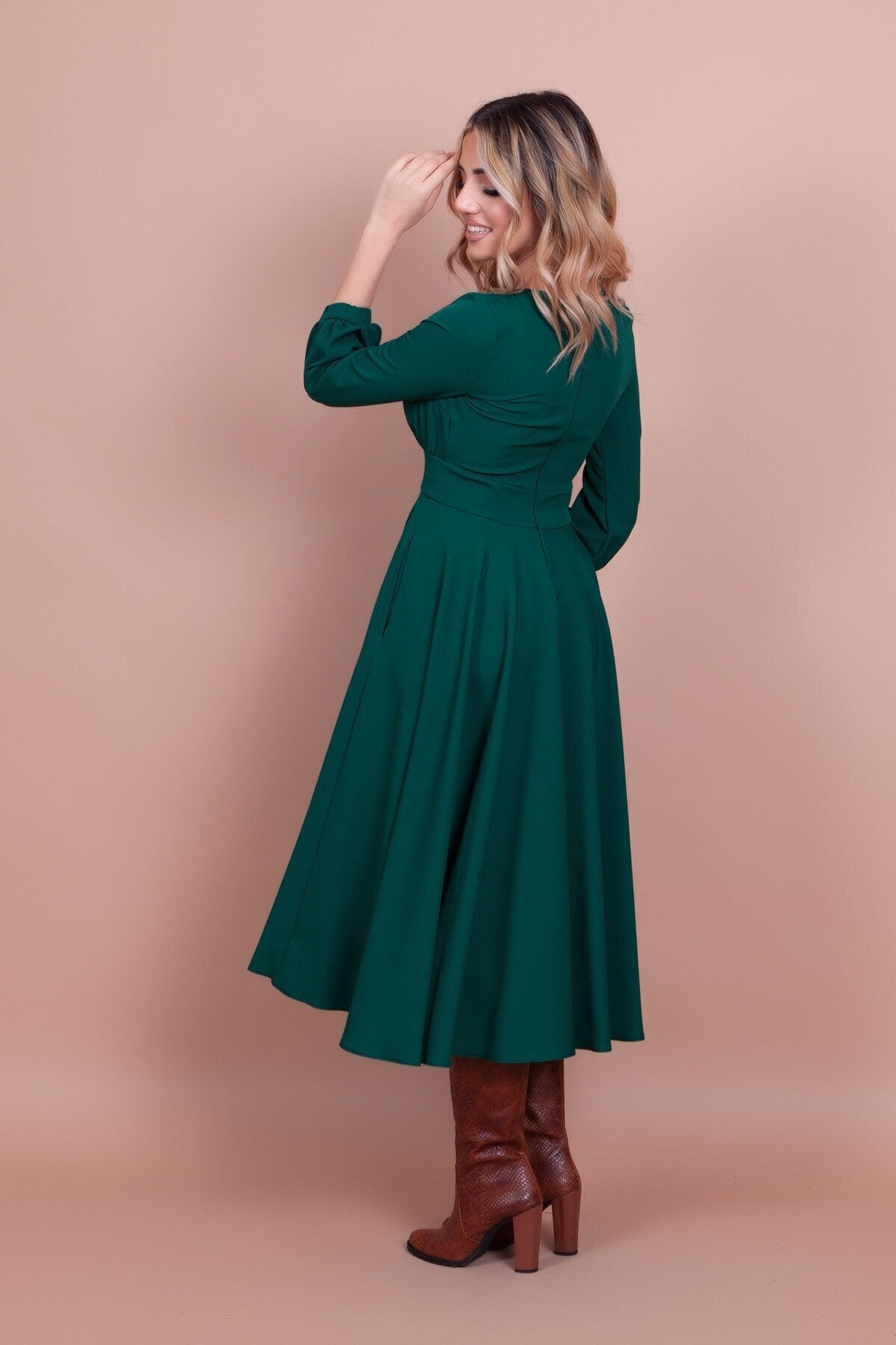 Midi Round-Neck Pocket-Detail Dress - Emerald