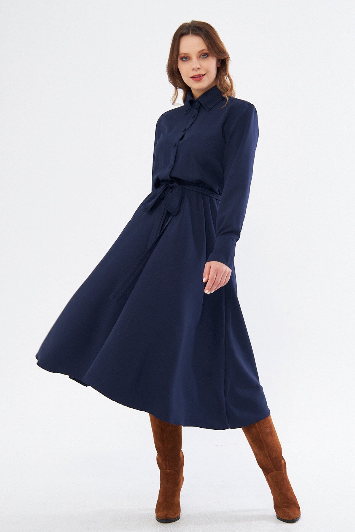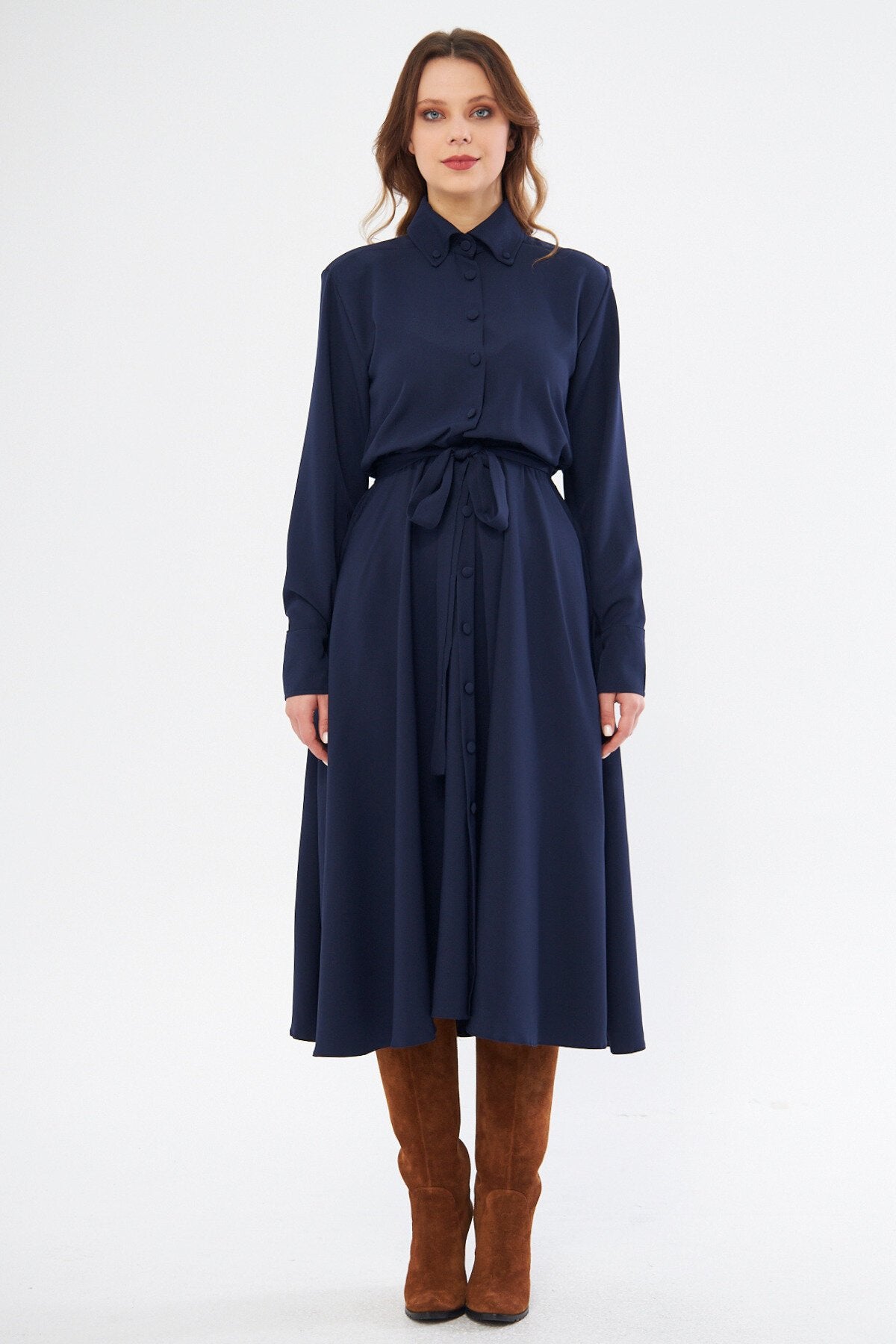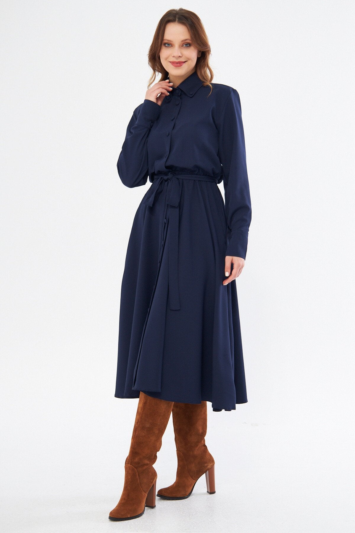 Midi Shirting Long Sleeve Belted Dress - Navy Blue
