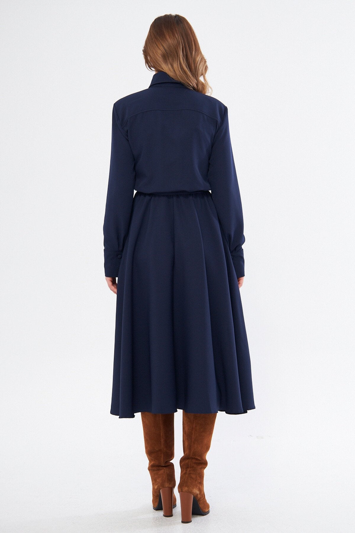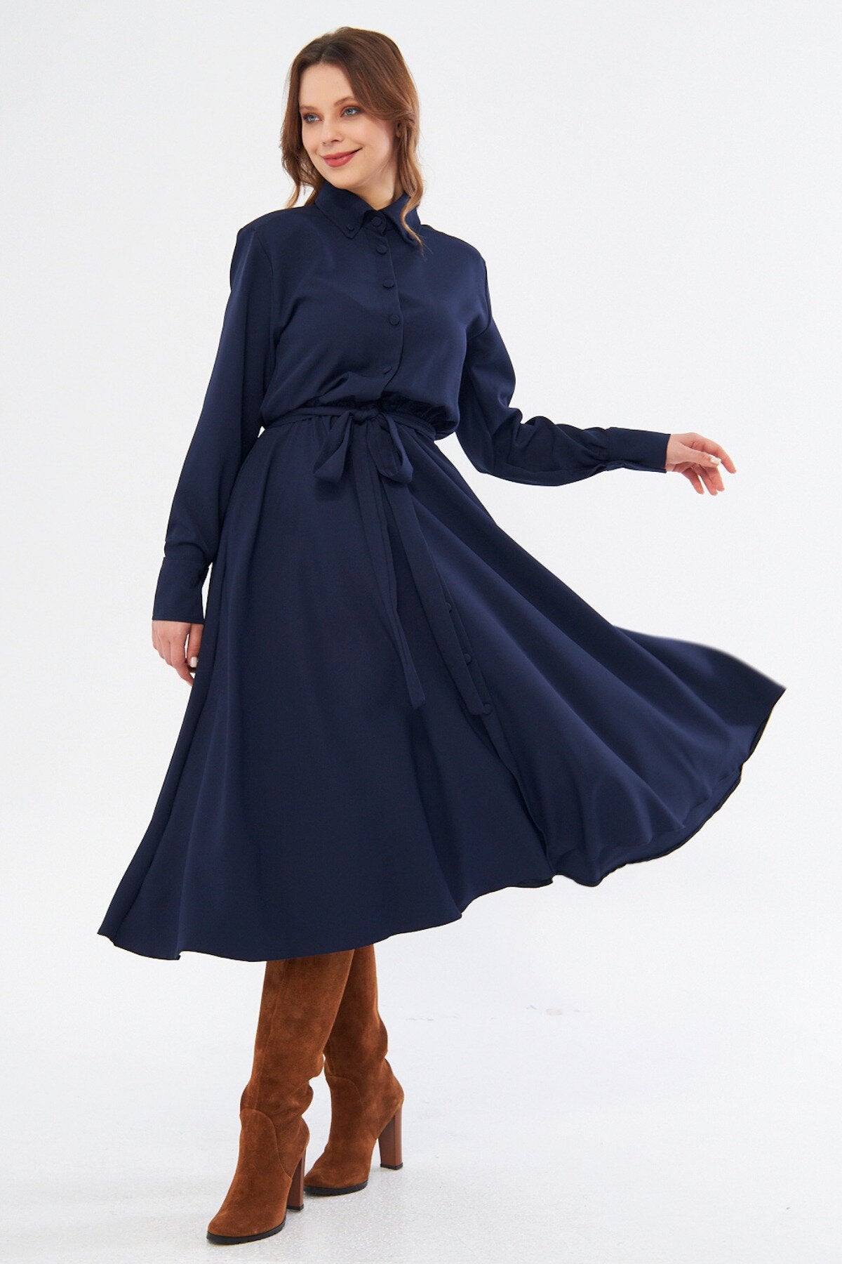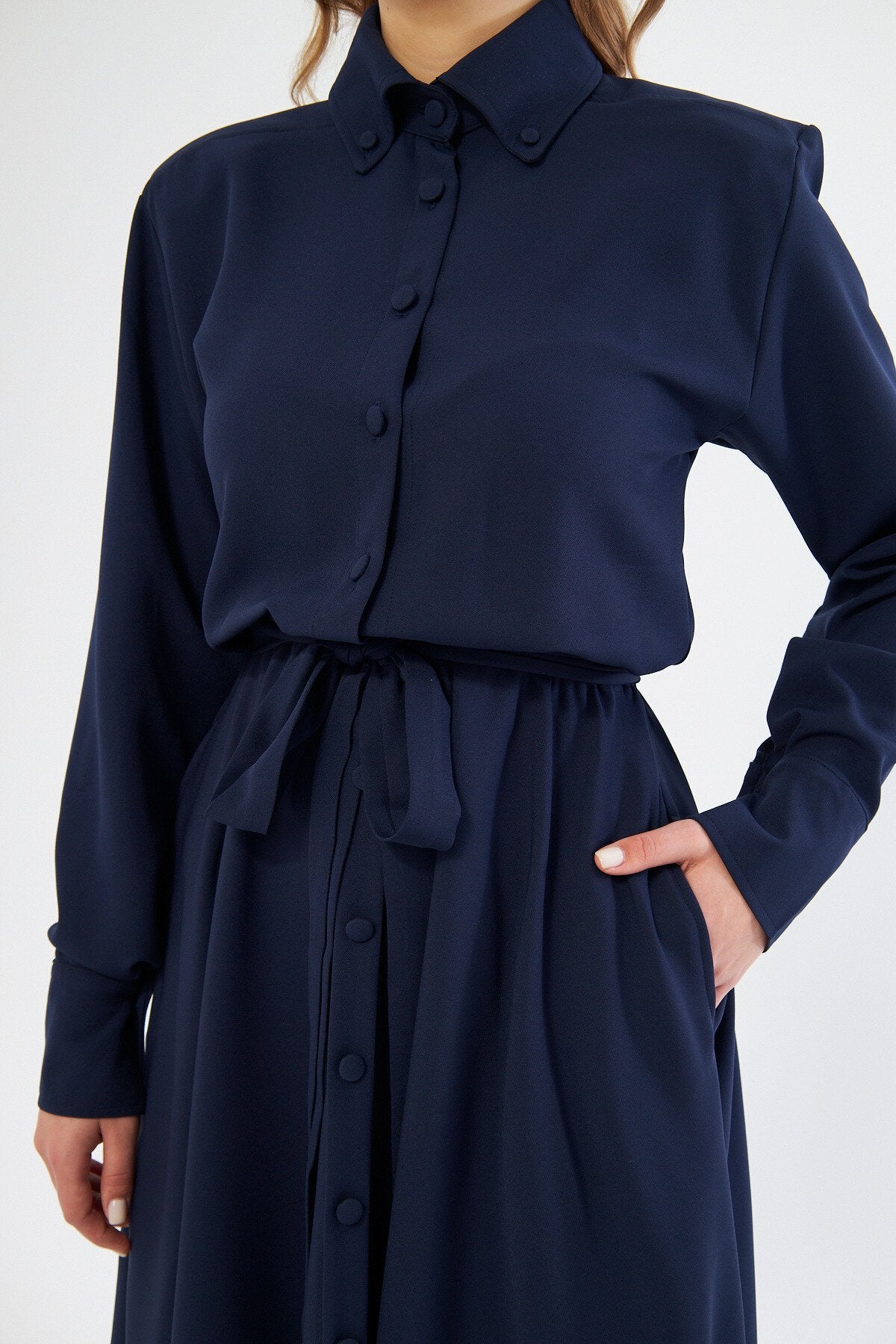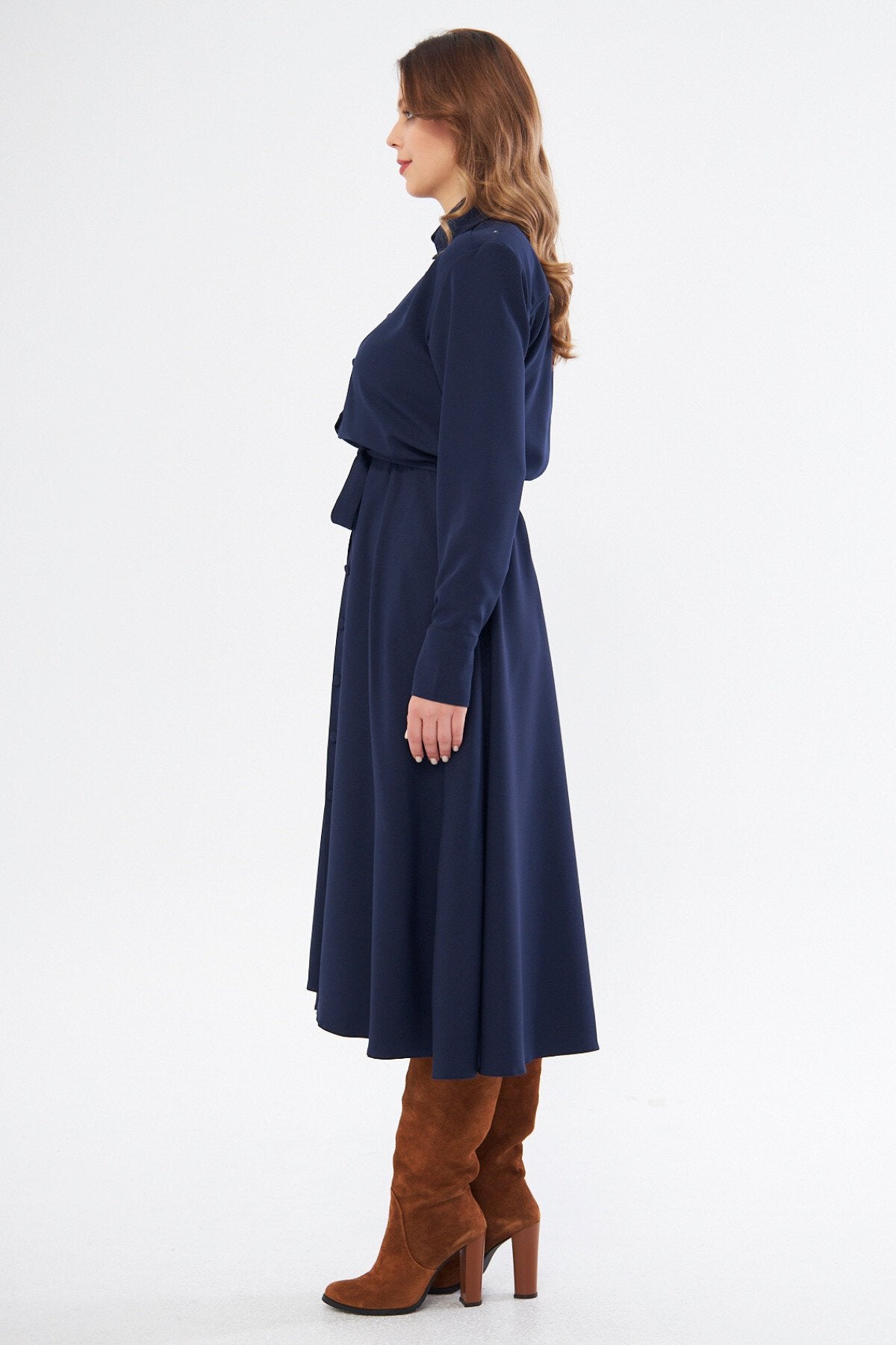 Midi Shirting Long Sleeve Belted Dress - Navy Blue