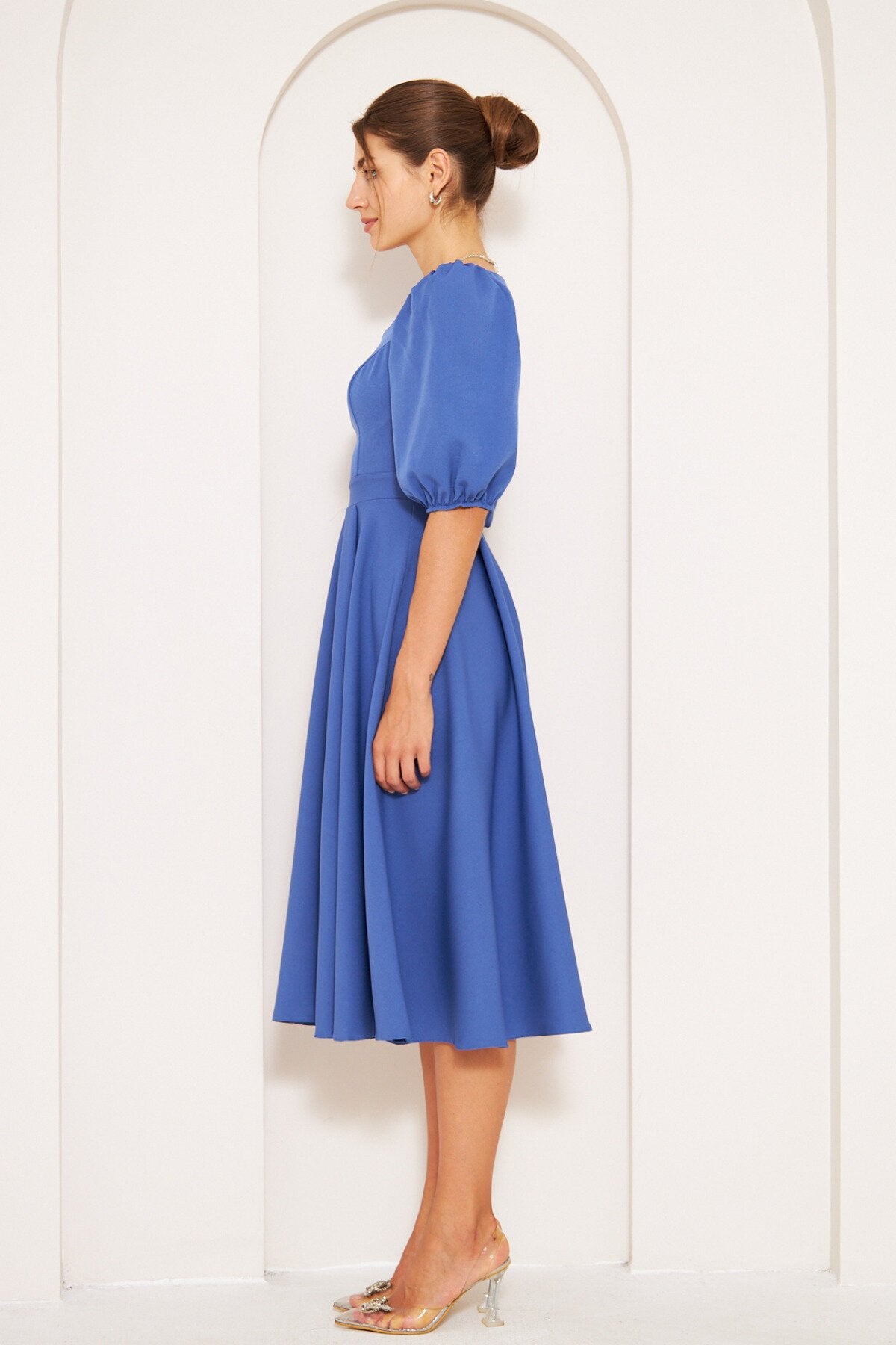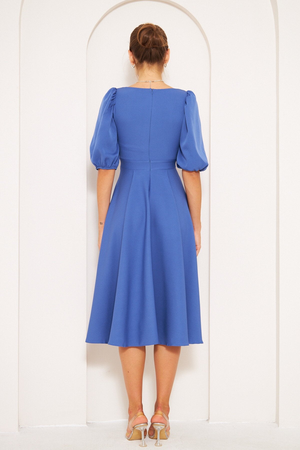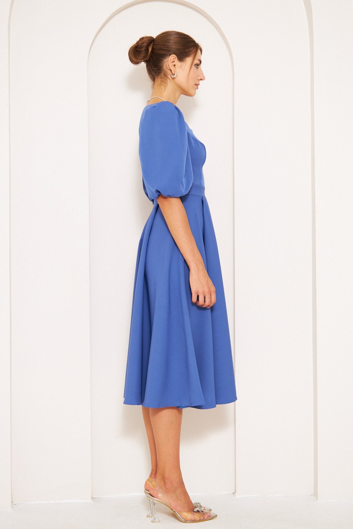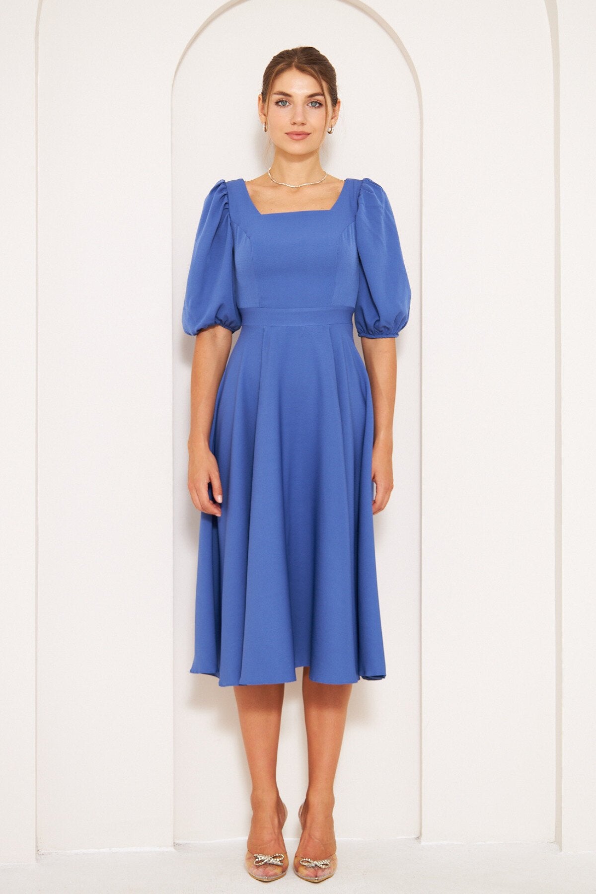 Fabric Type: Woven, Material: Woven, Sleeve Type: Balloon Sleeve, Pattern: Solid, Color: Blue, Fit: Regular, Neckline Type: Square Neck, Closure Type: Zipper Closure, Sleeve Length: Short, Product Detail: Zipper, Pocket: No Pockets, Collection: Prom/Bridesmaid, Thickness: Medium, Lining: Unlined, Length: Midi, Silhouette: A-line, Occasion: Wedding/Ceremony, Weave Type: Tulle, Additional Feature: No Additional Features, Print/Embroidery Technique: No Print, Belt/Sash: No Belt, Sustainability Detail: Yes, Package Contents: Single Item, Origin: TR, Box: No Box