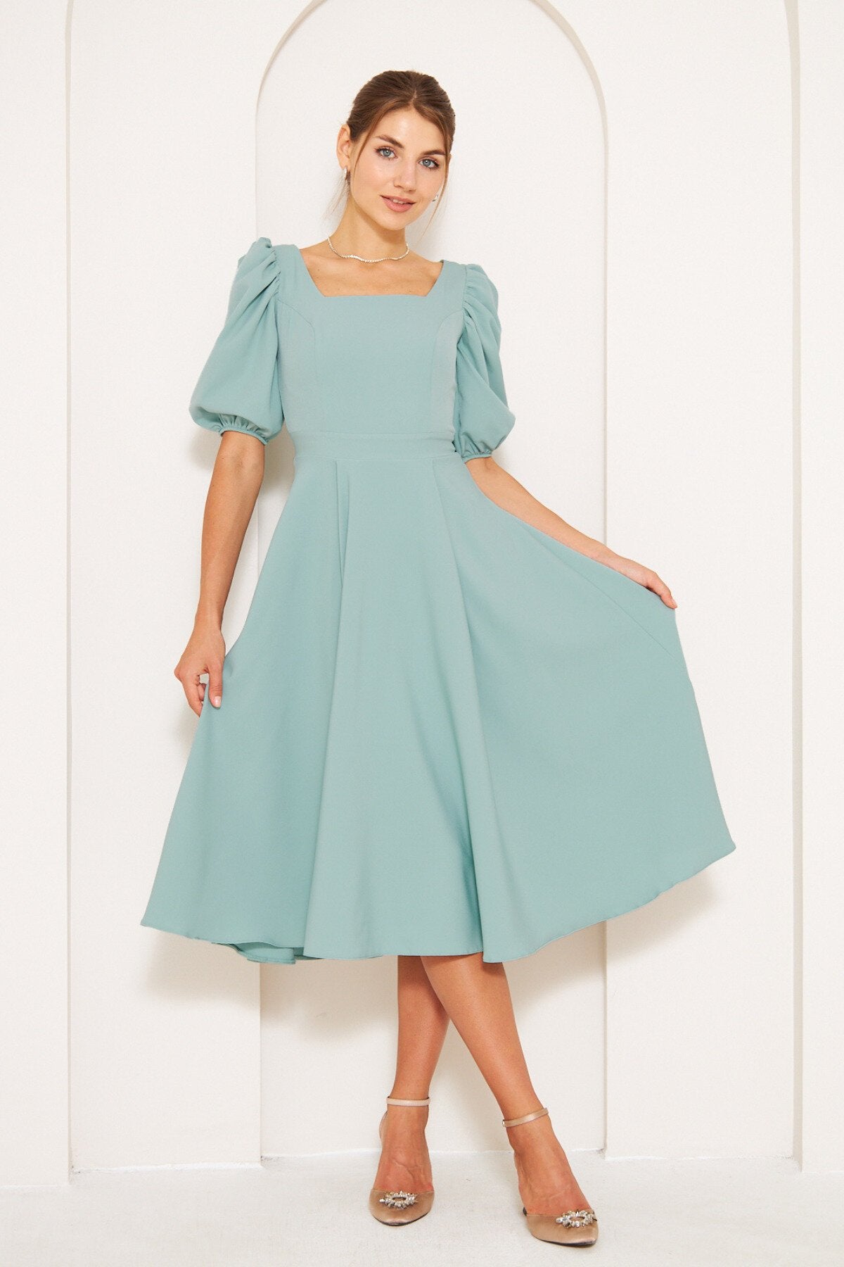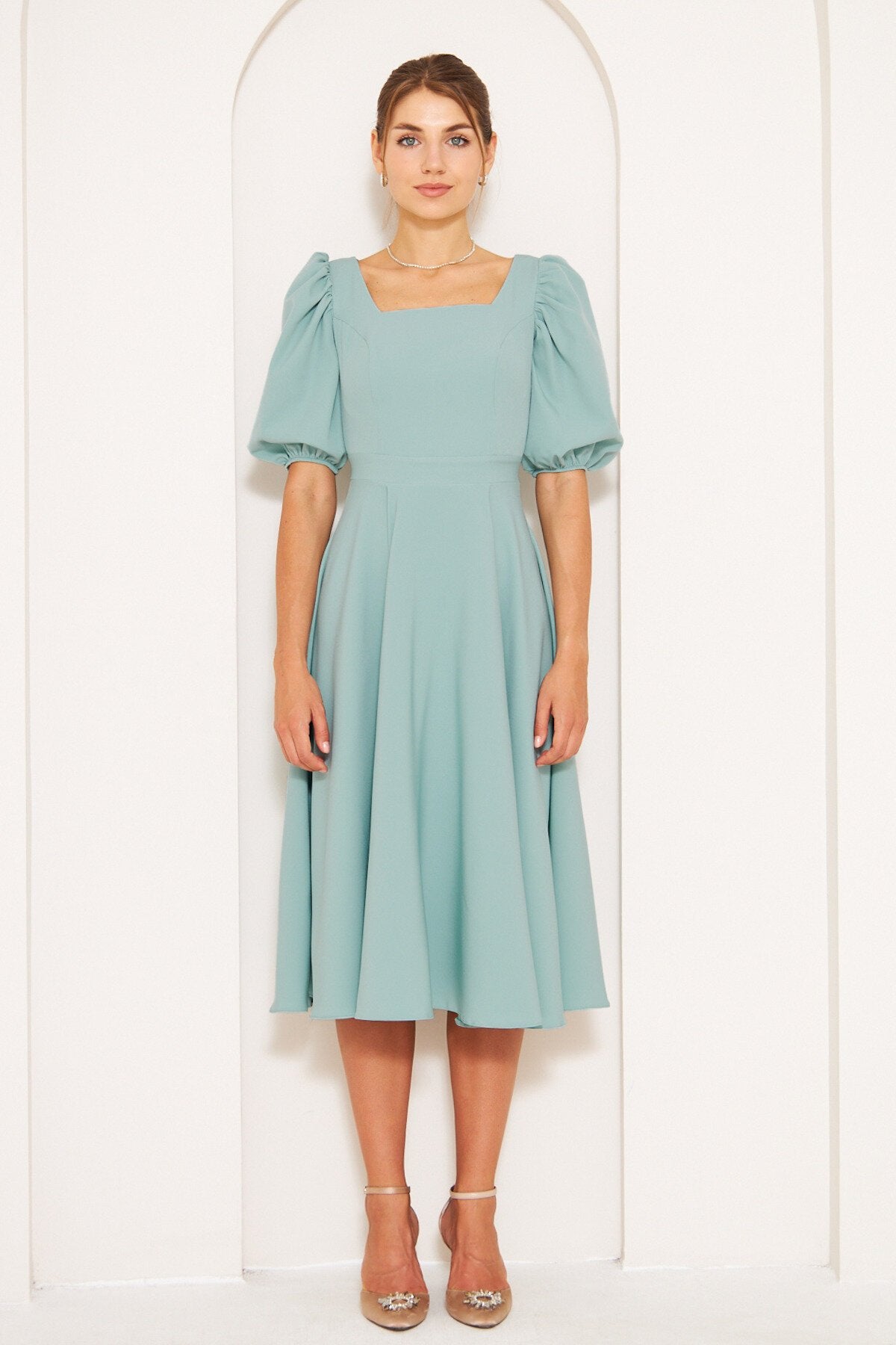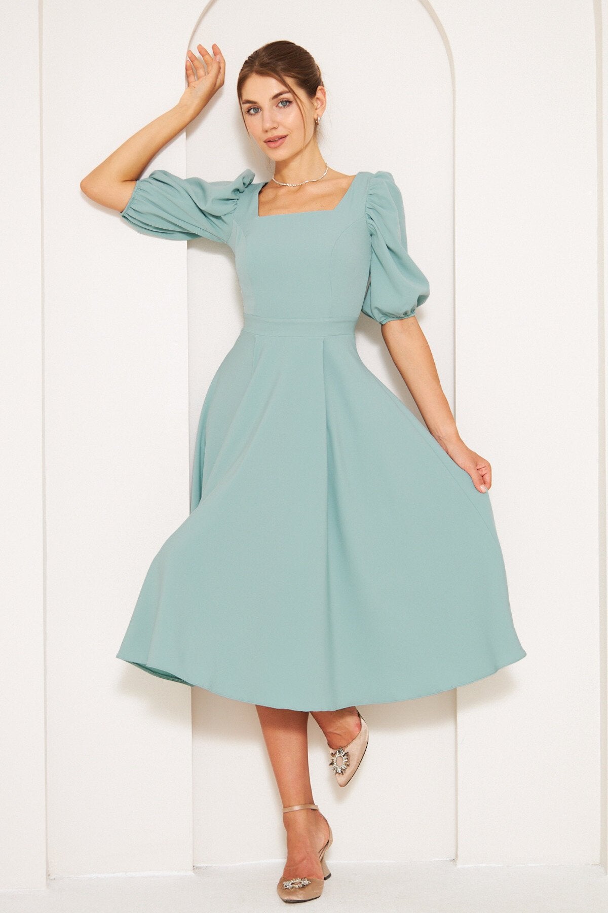 Midi Square Neck Balloon Sleeve Dress - Mint Green