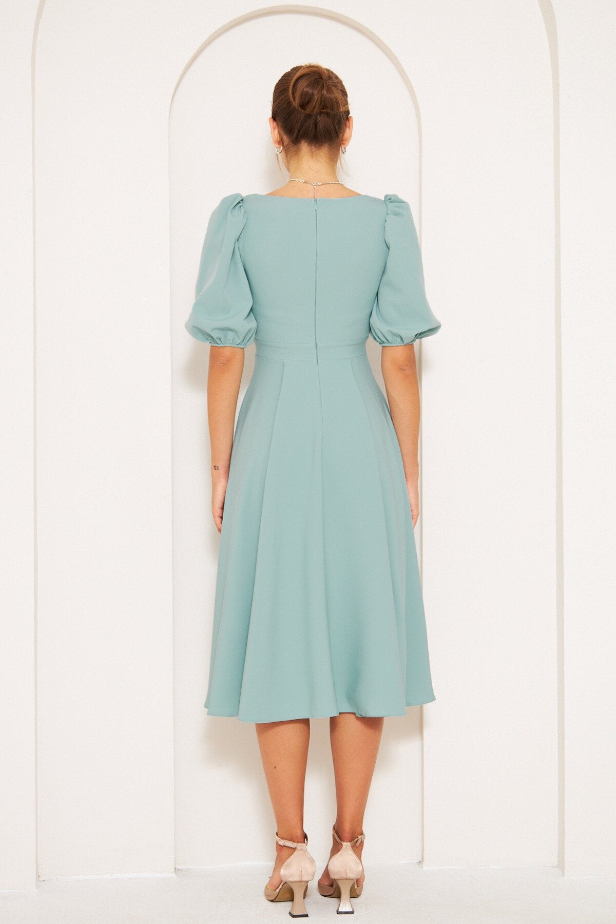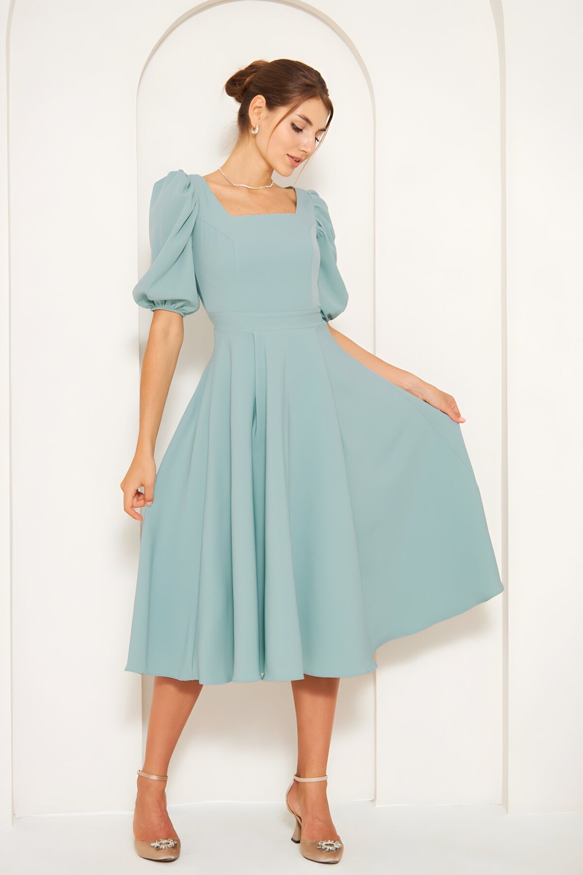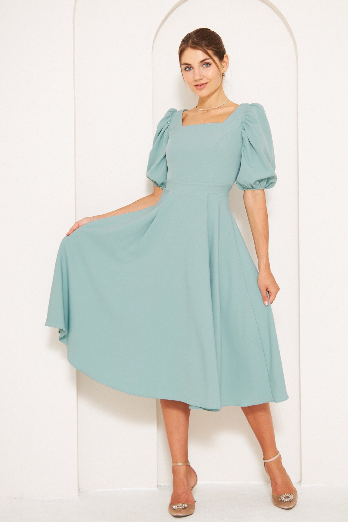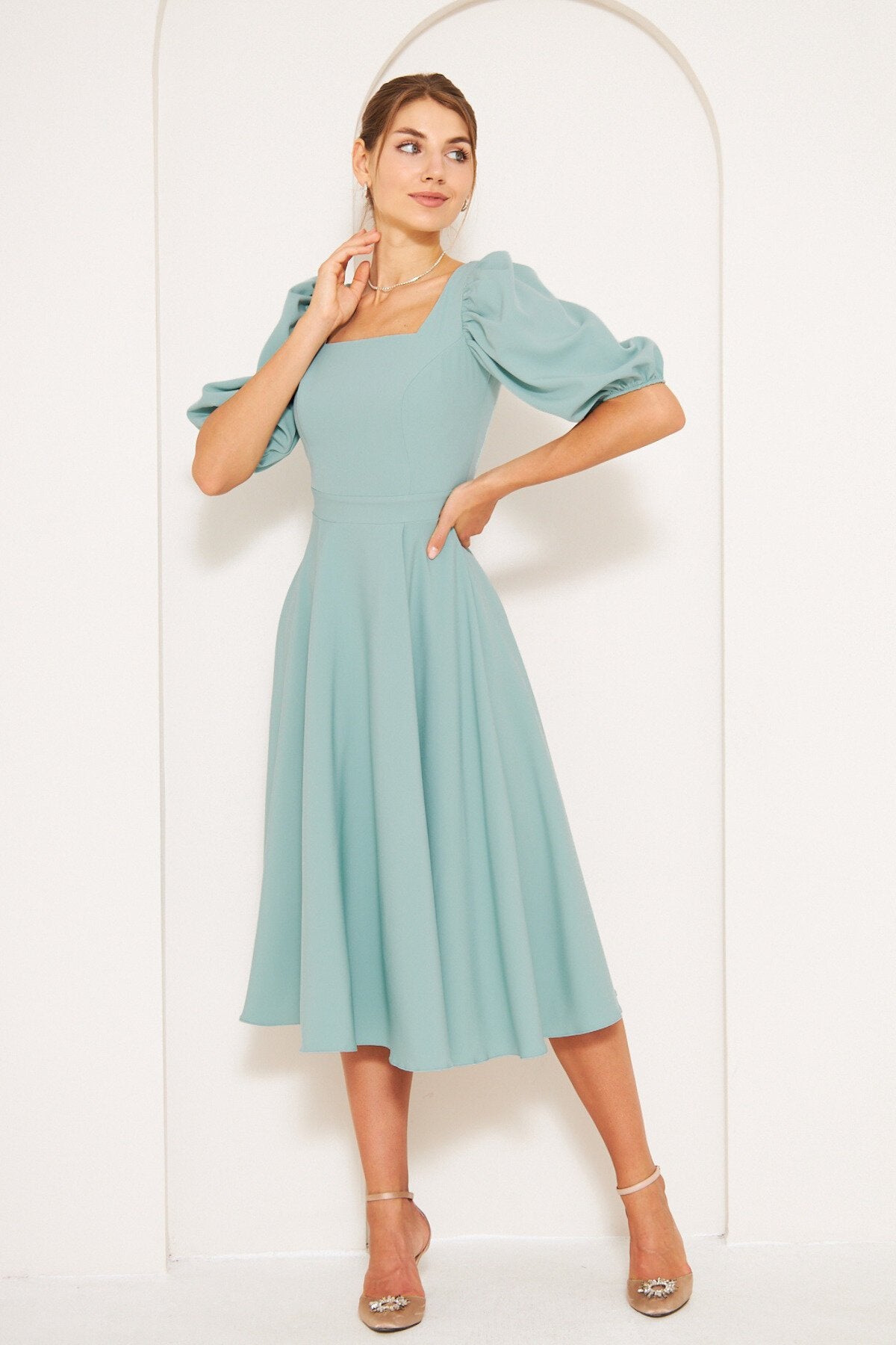 Midi Square Neck Balloon Sleeve Dress - Mint Green