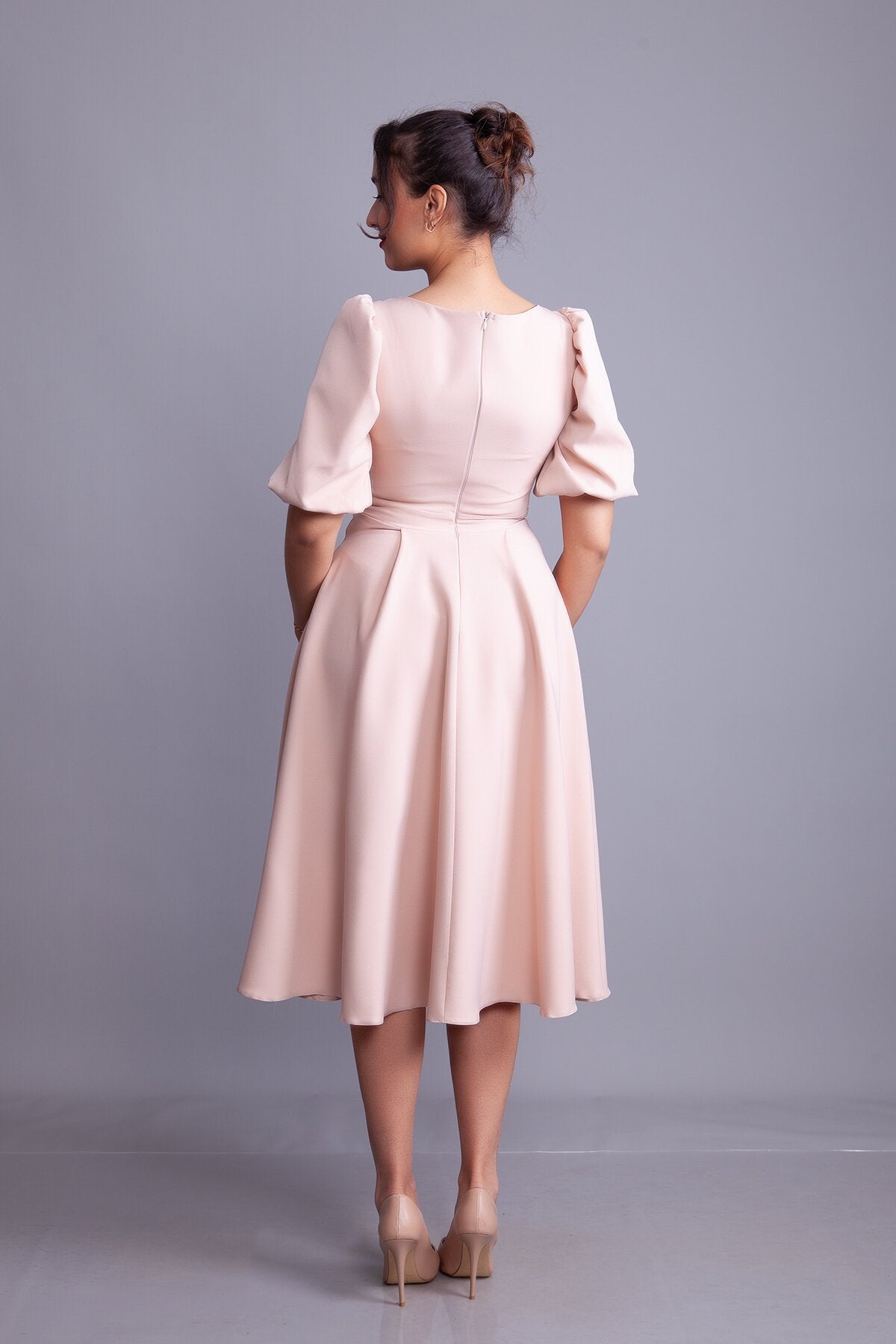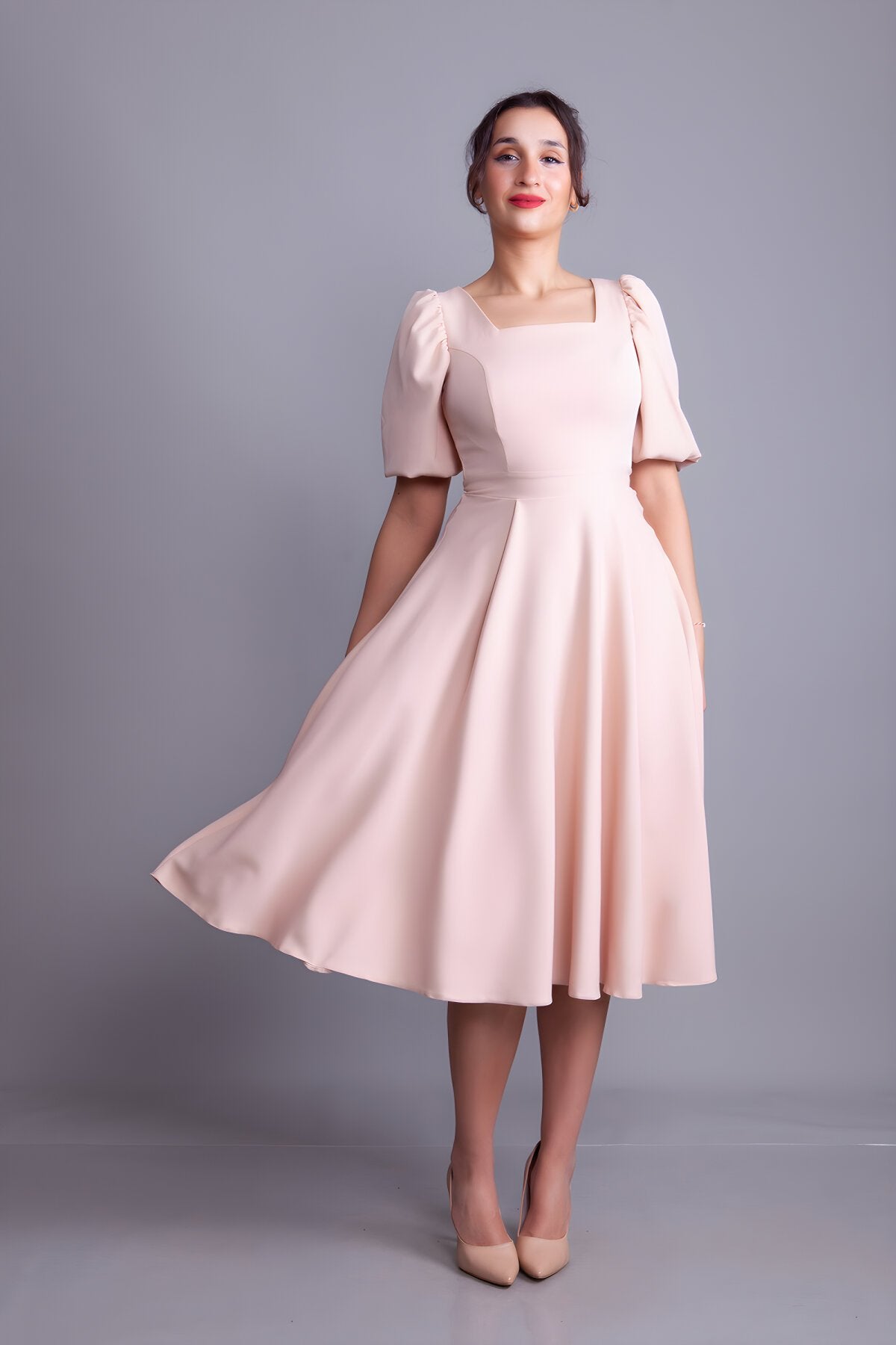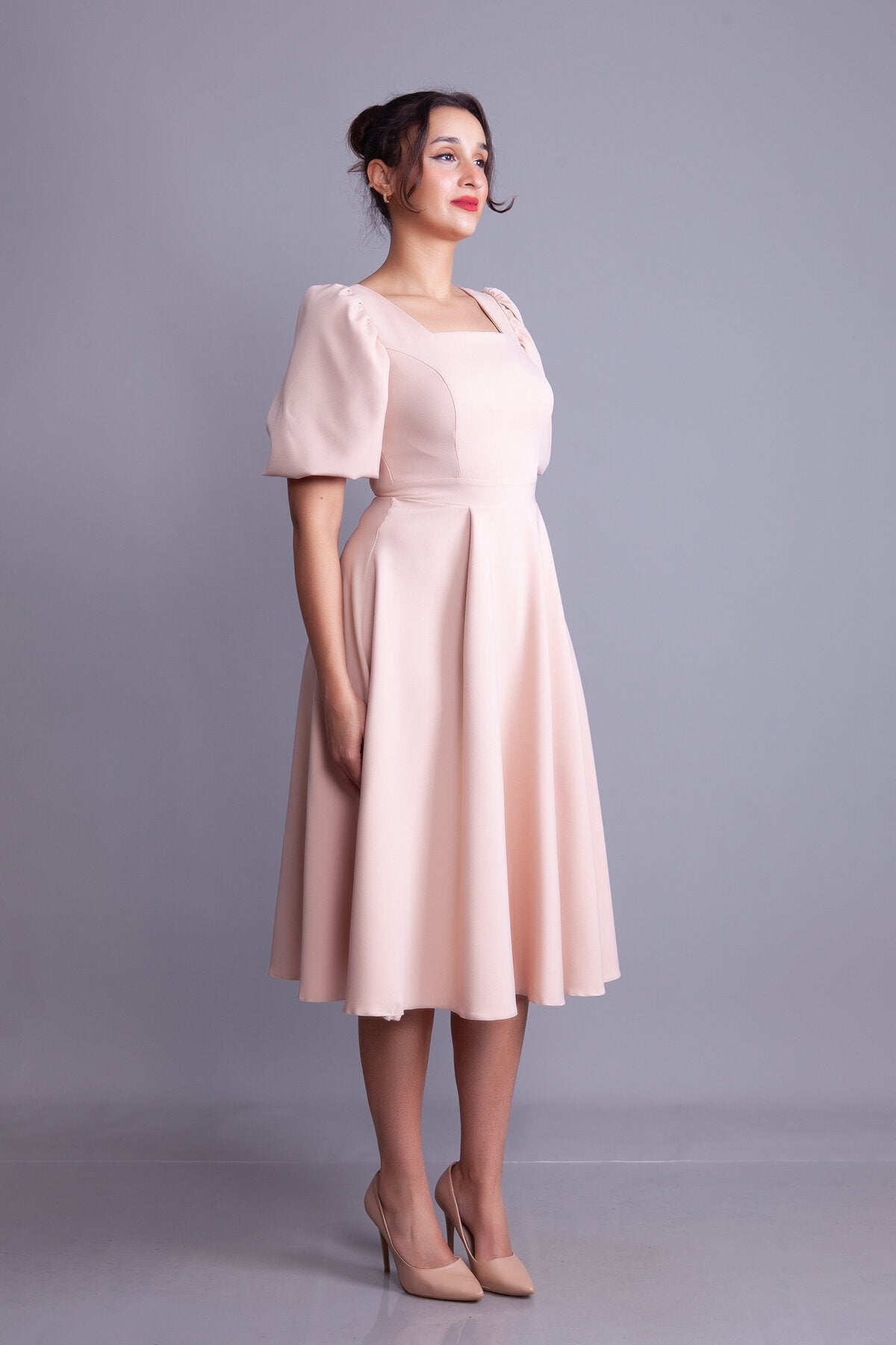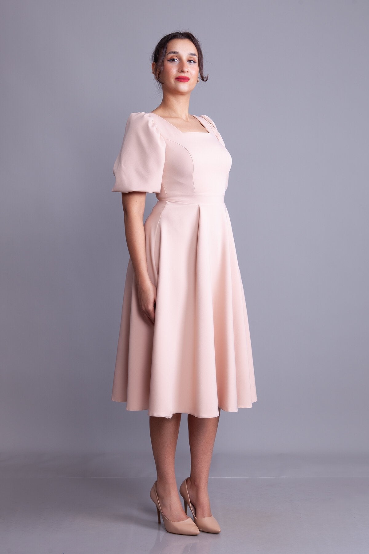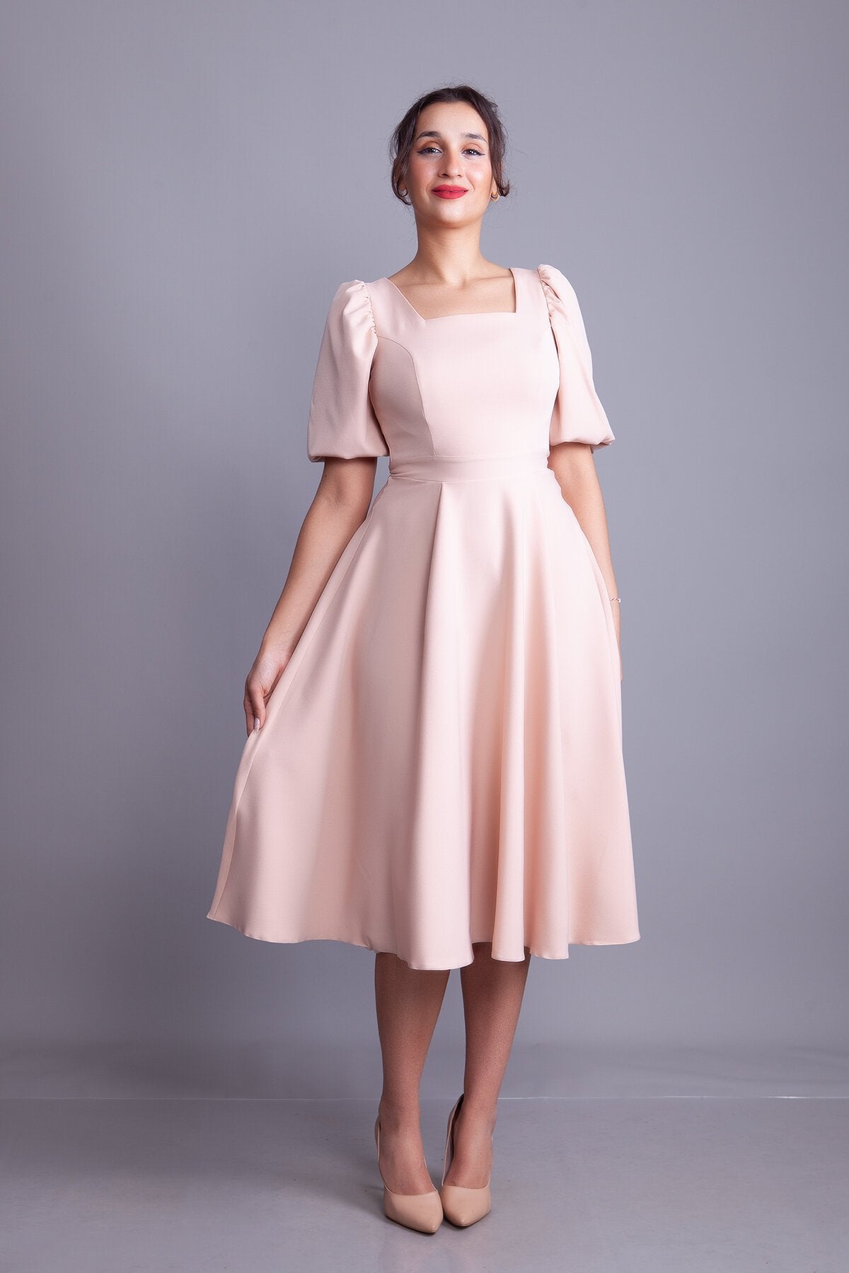 Midi Square-Neck Balloon-Sleeve Evening Dress - Cream