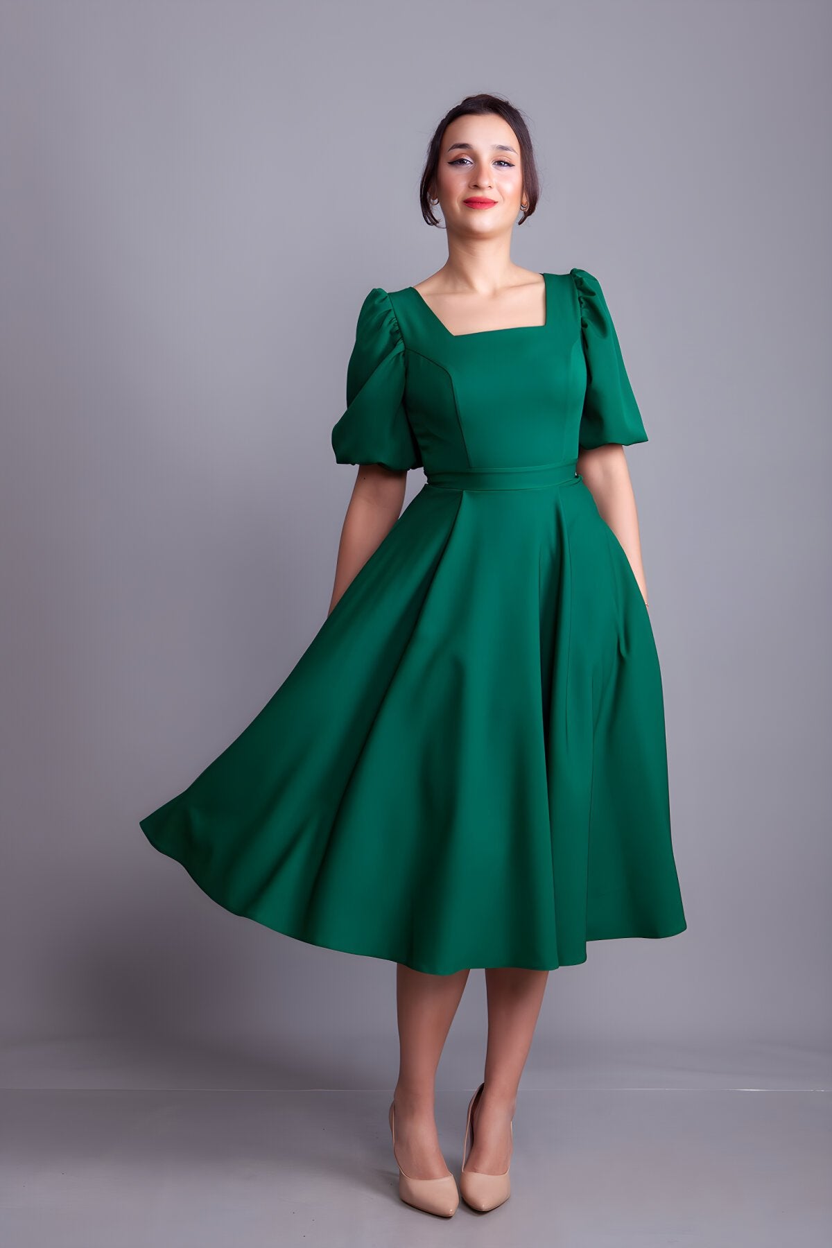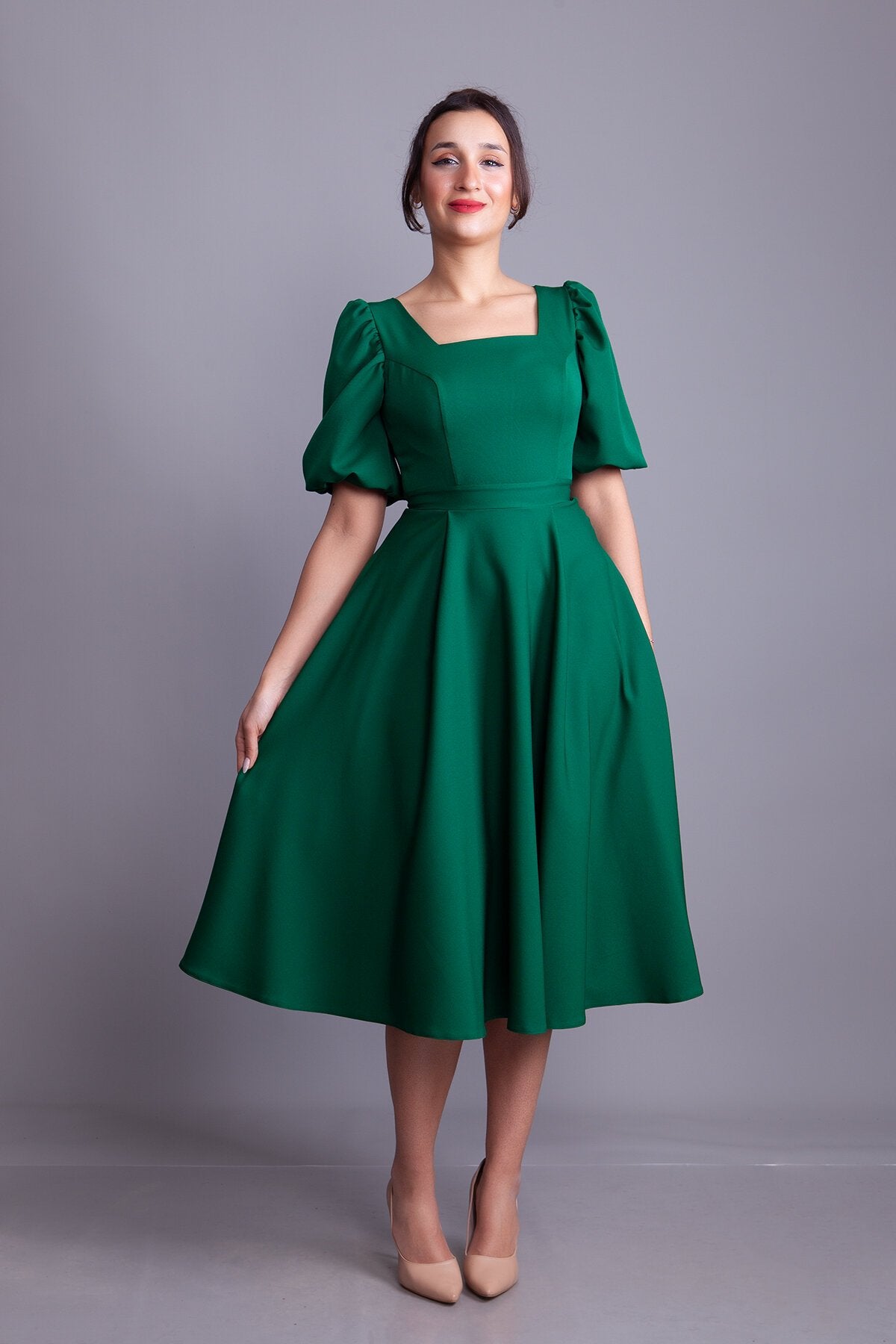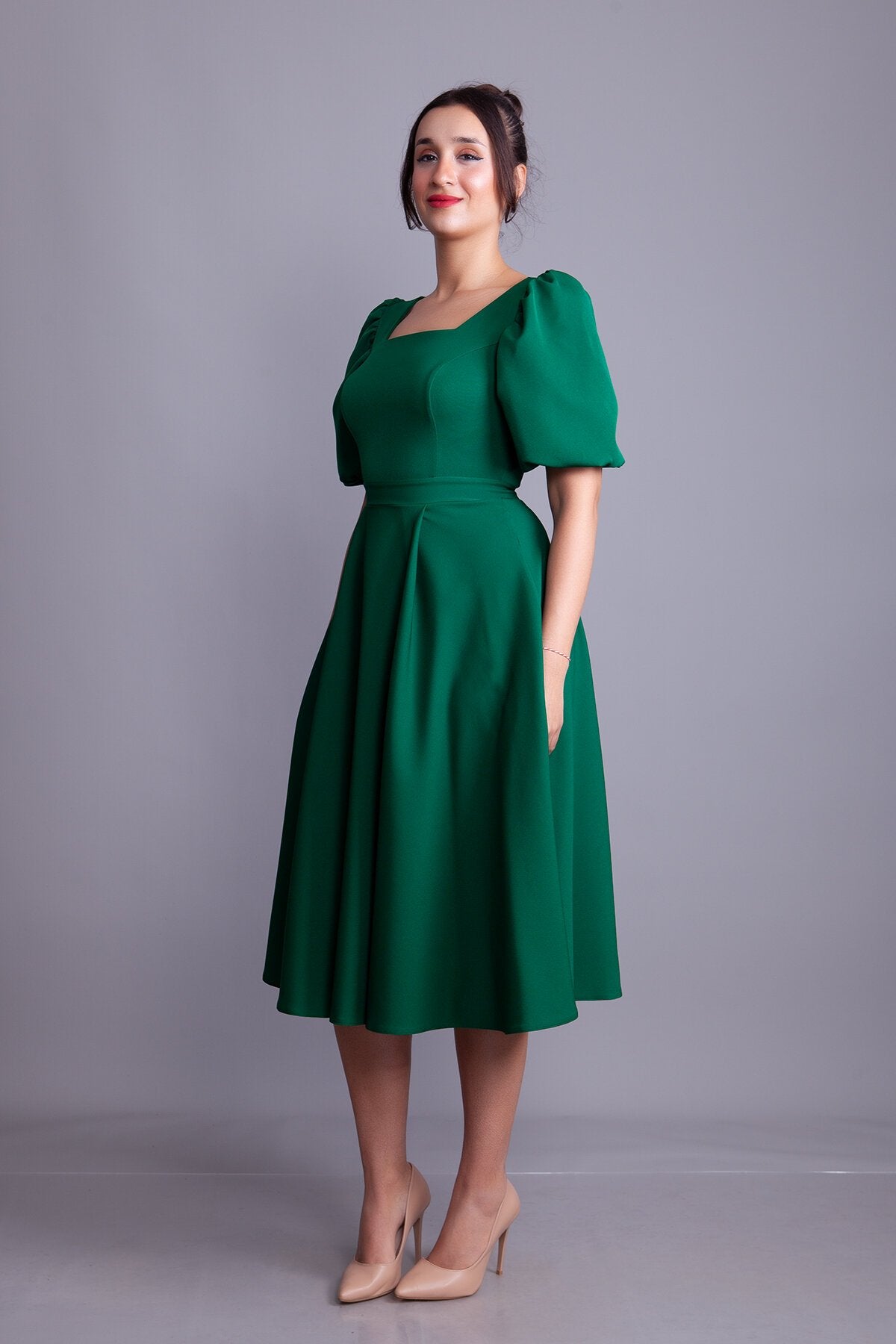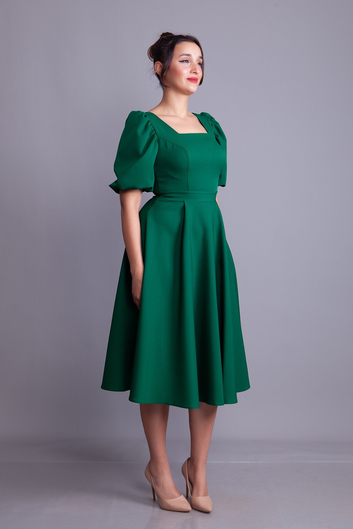 Midi Square Neck Balloon Sleeve Evening Dress - Emerald