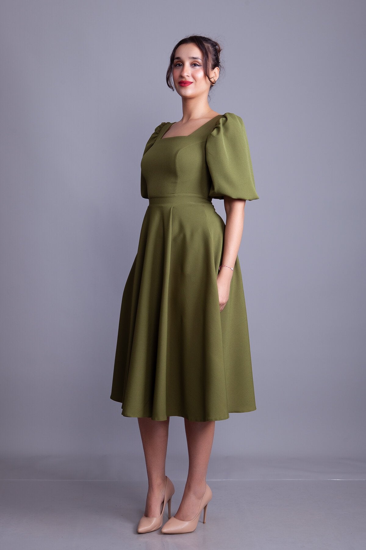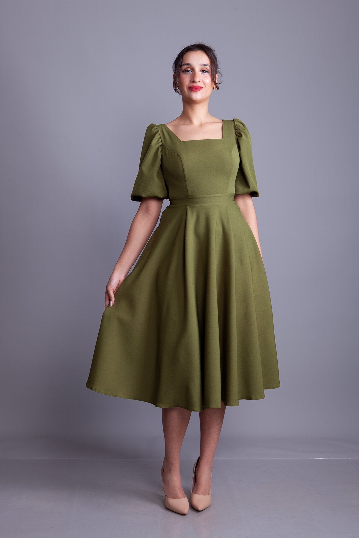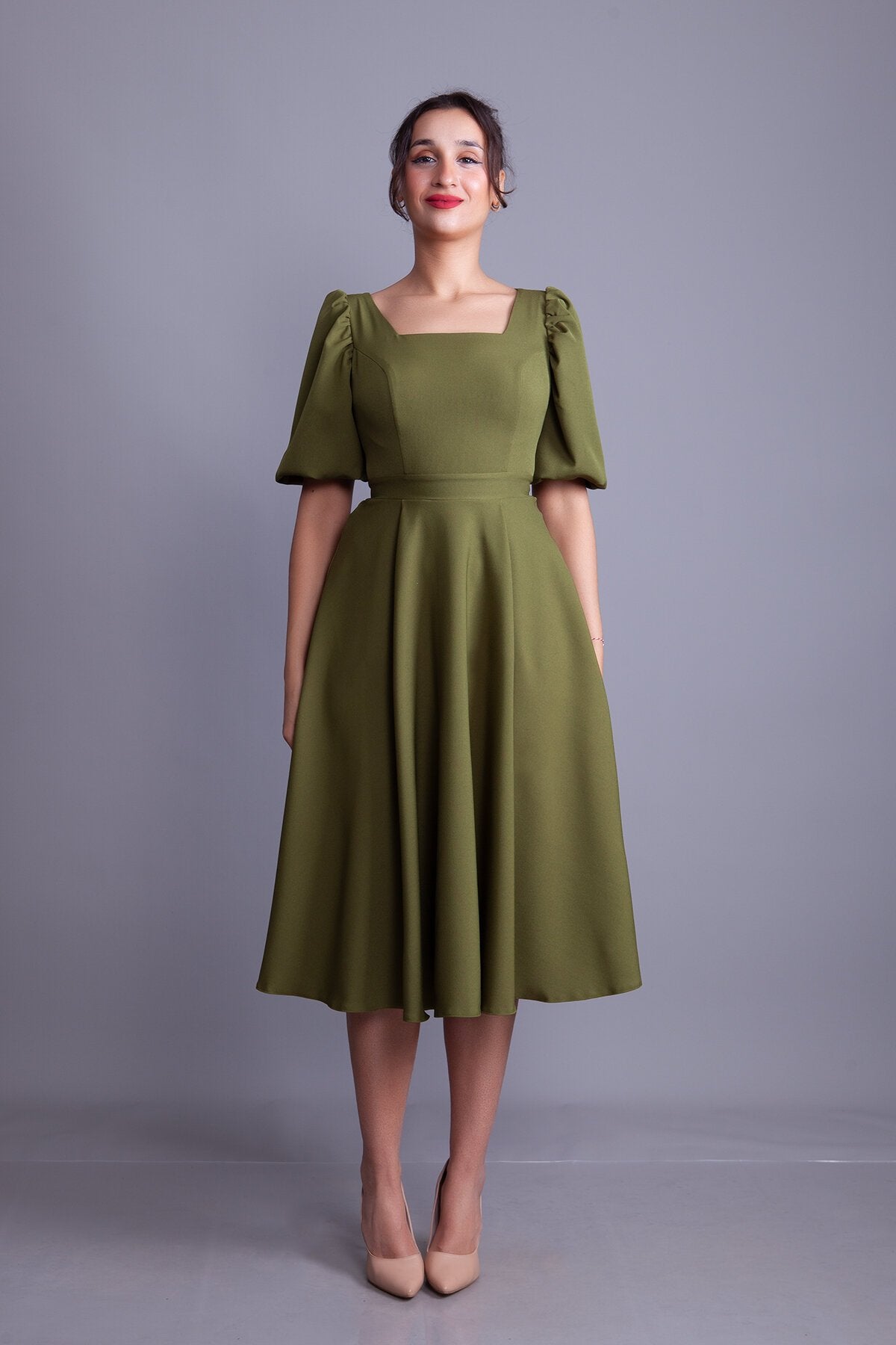 Midi Square Neck Balloon Sleeve Evening Dress - Khaki