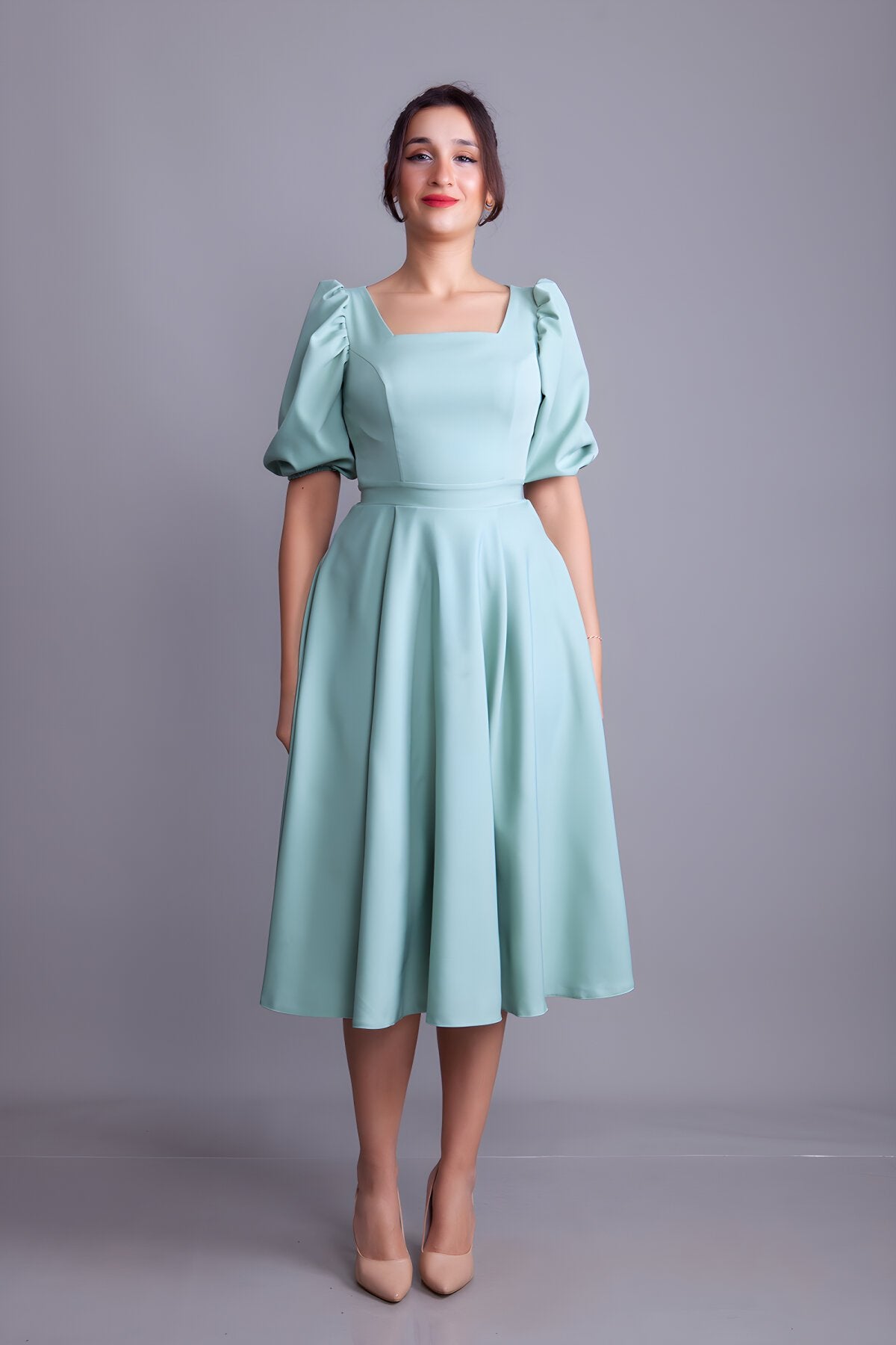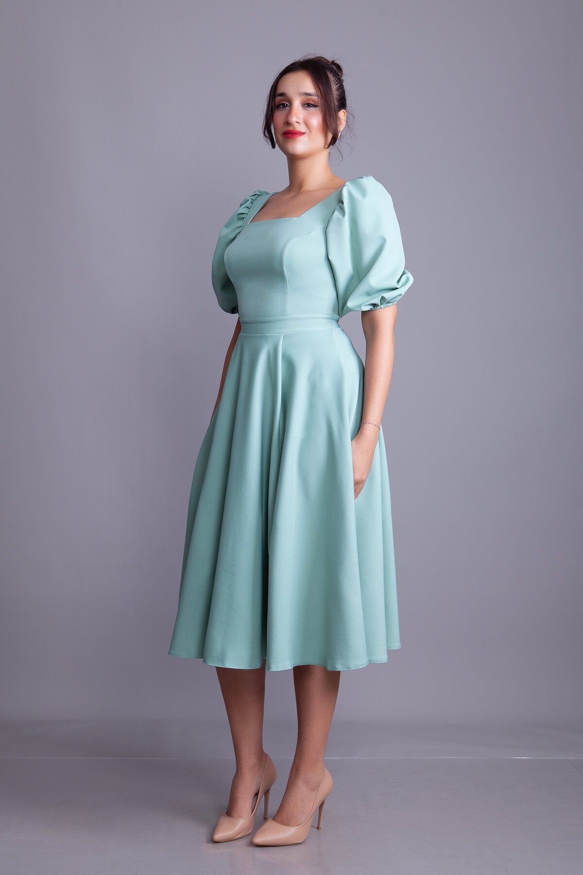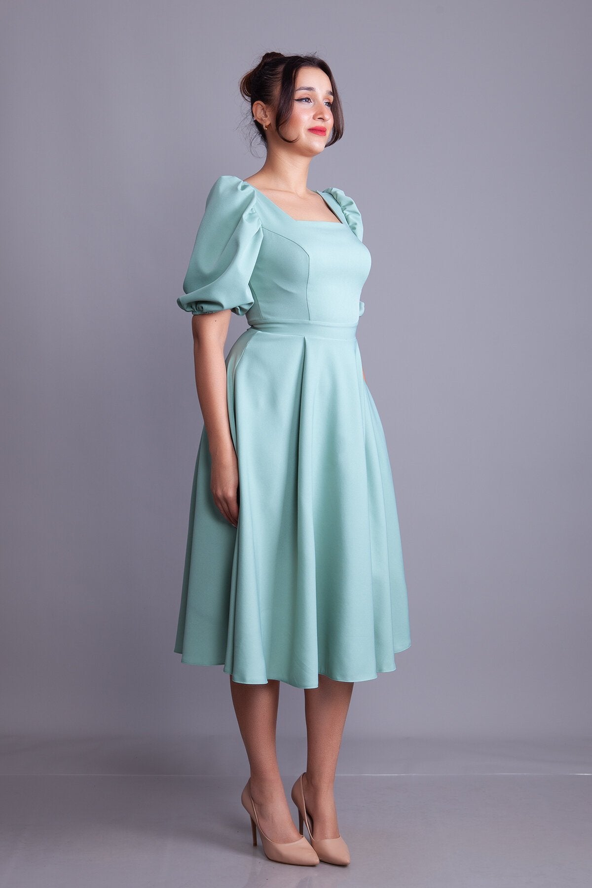 Midi Square Neck Balloon Sleeve Evening Dress - Mint Green