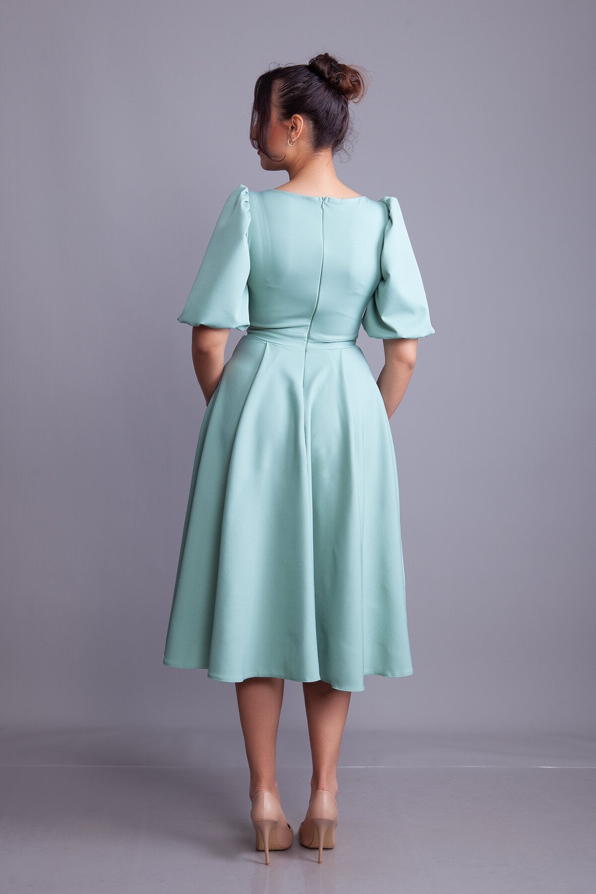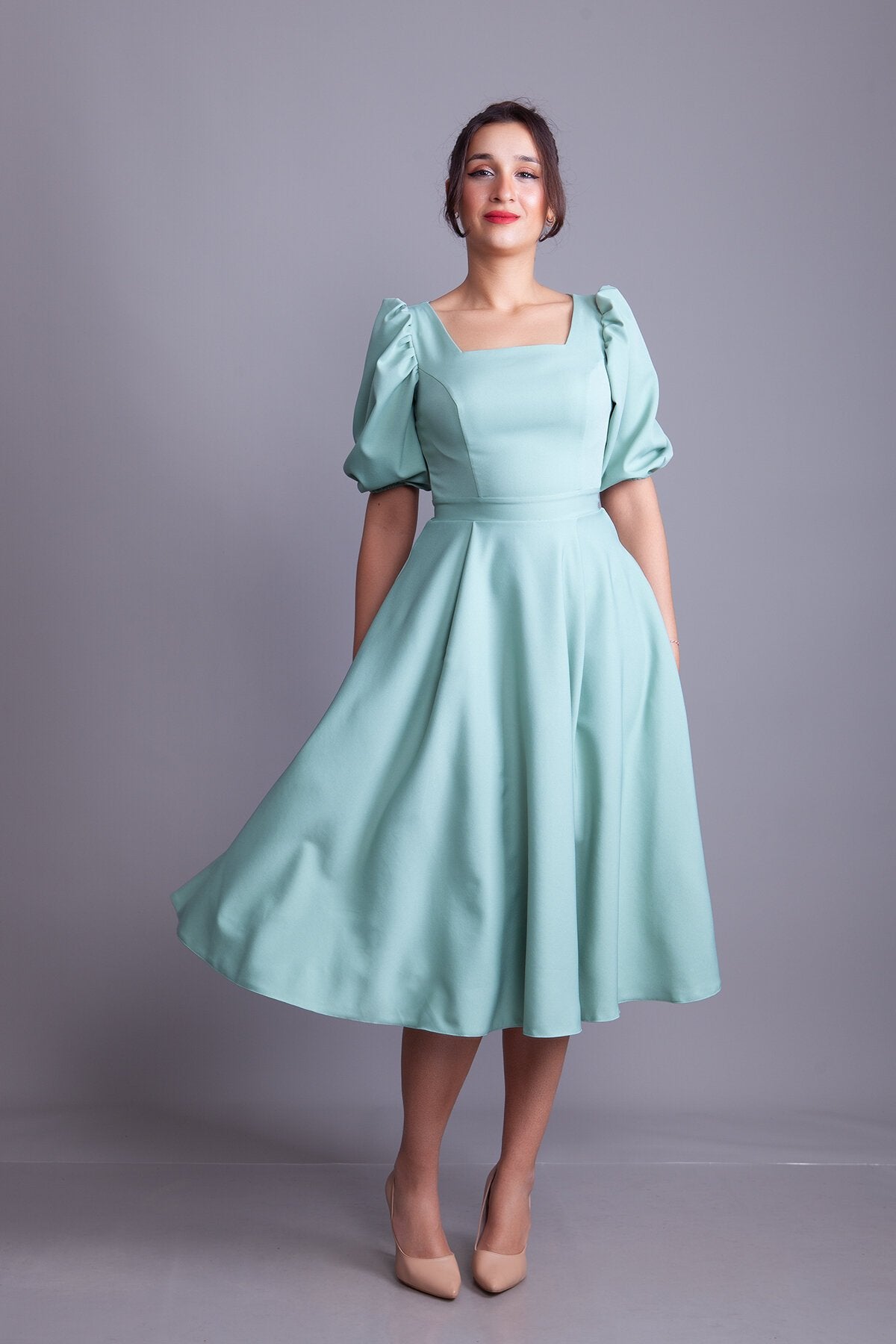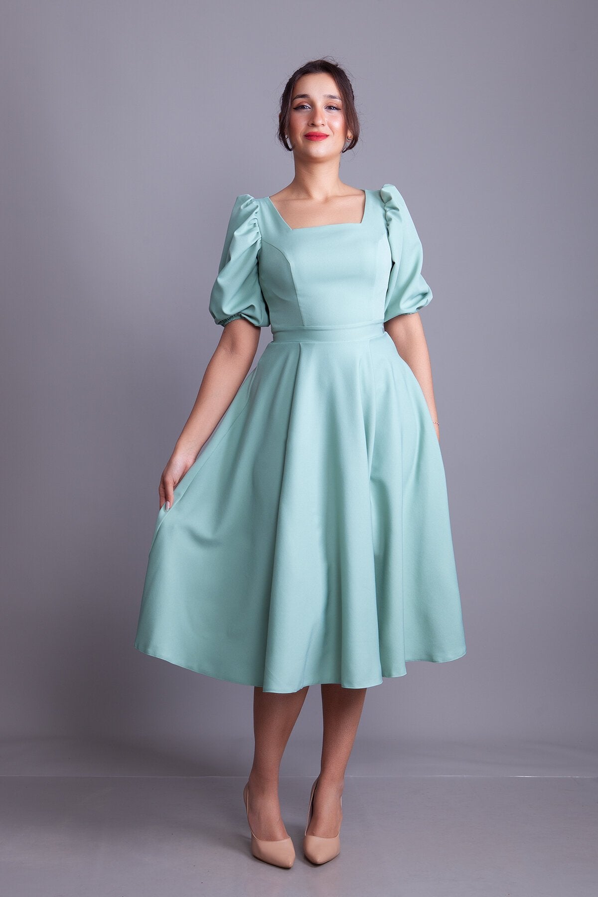 Midi Square Neck Balloon Sleeve Evening Dress - Mint Green