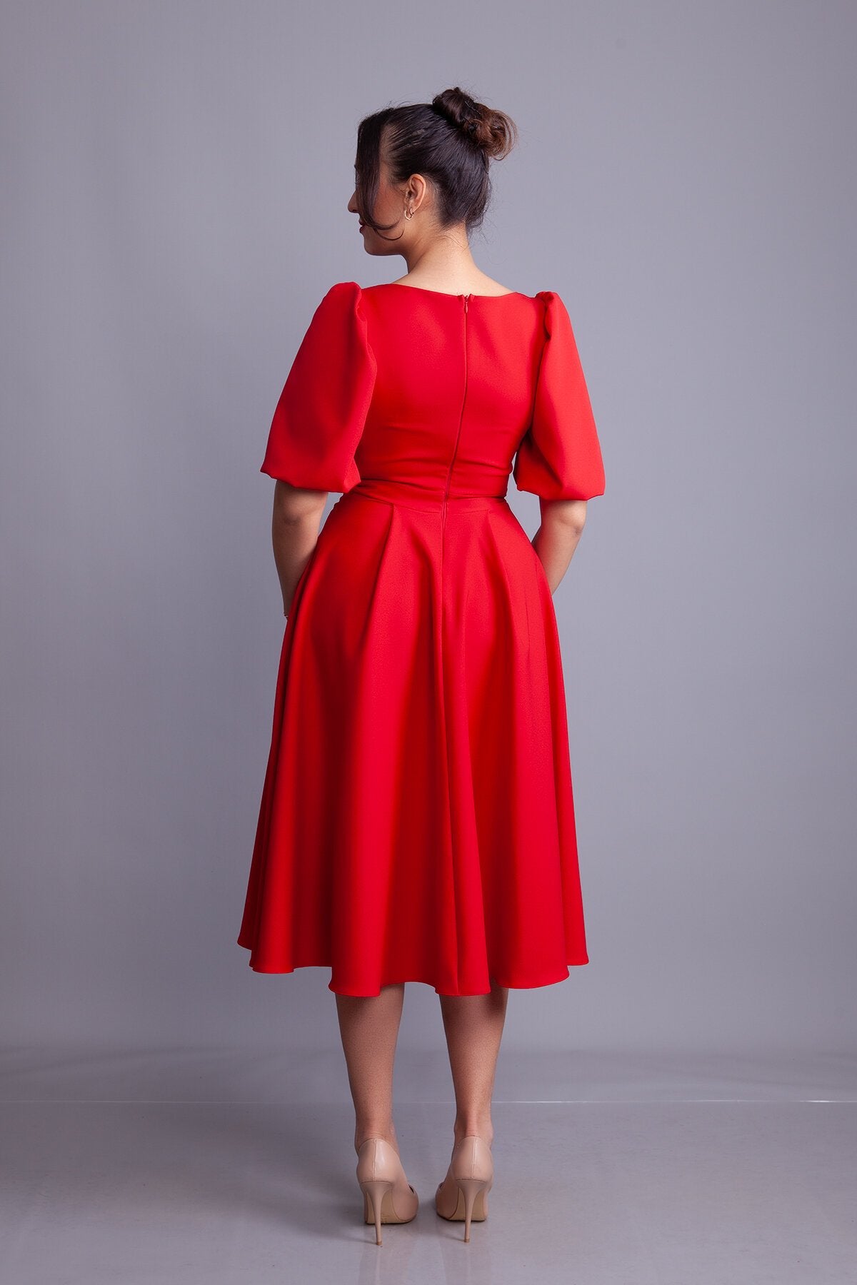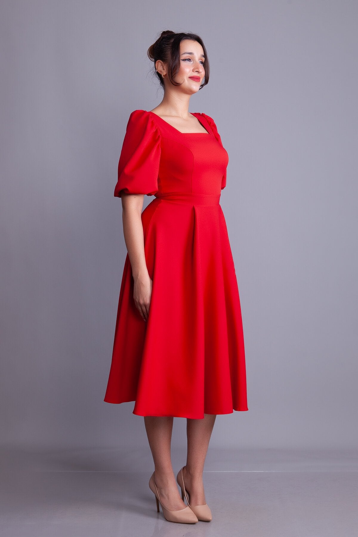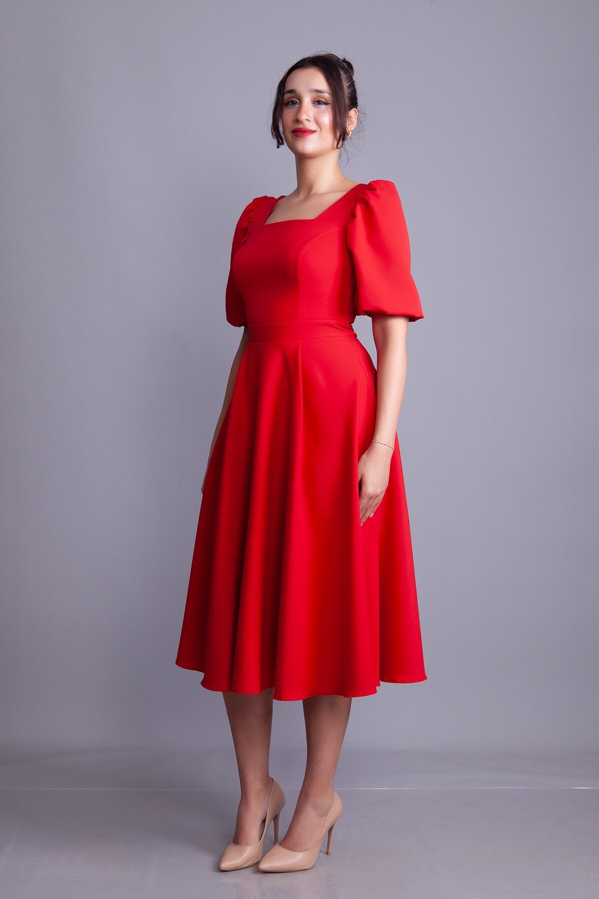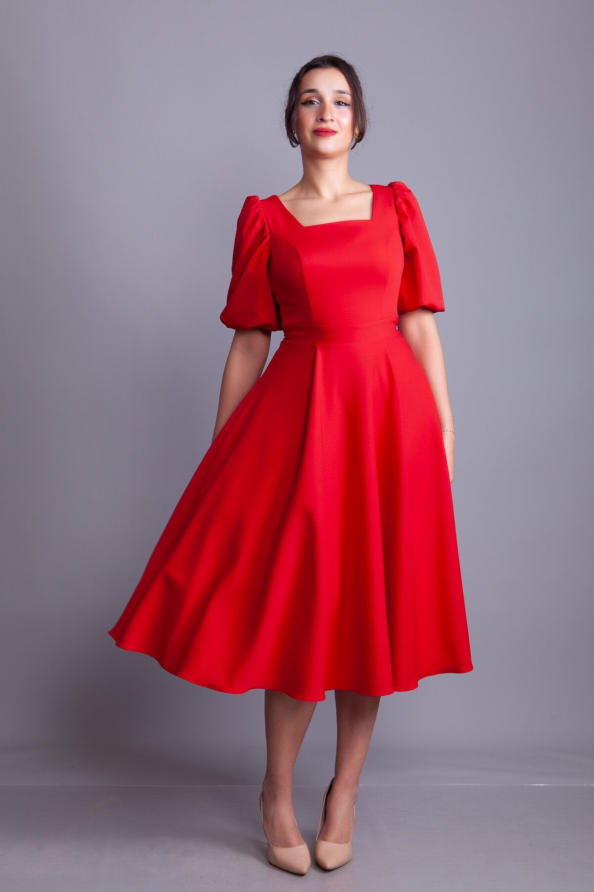 Midi Square Neck Balloon Sleeve Evening Dress - Red