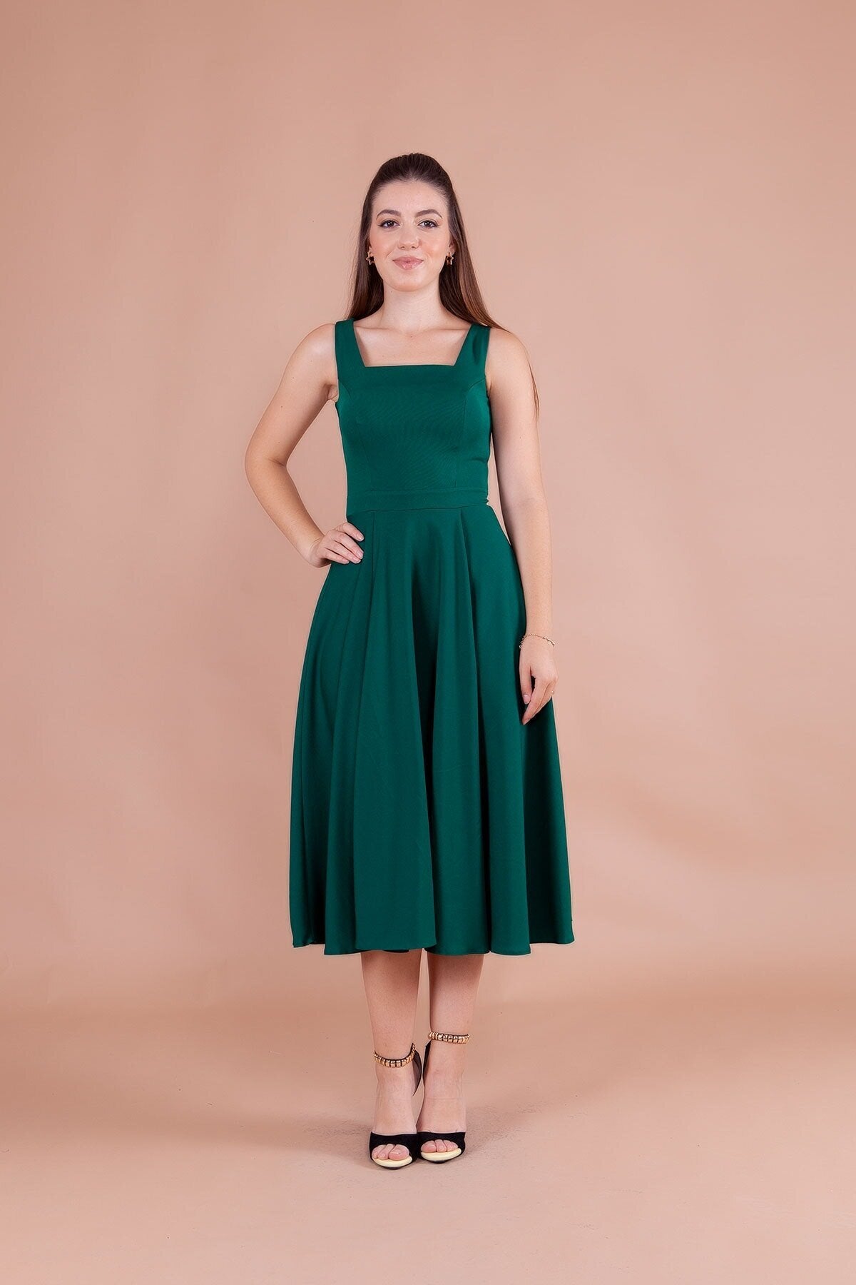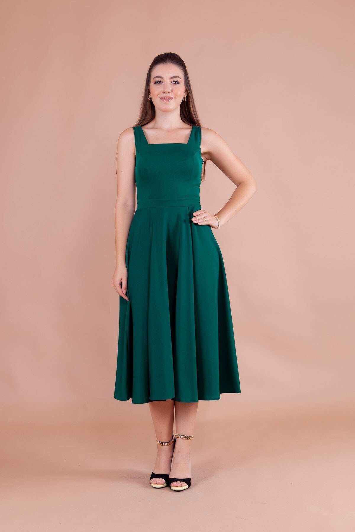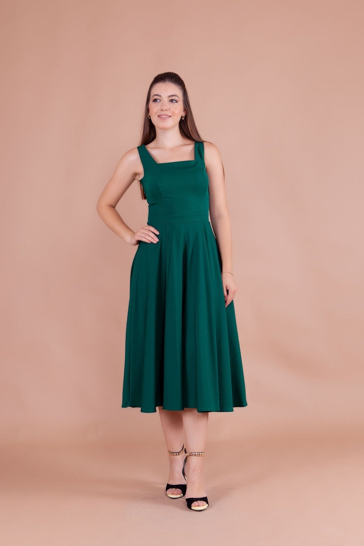 Embrace a look of refined grace with this stunning emerald midi dress, designed to accentuate your natural elegance. The structured bodice meets a beautifully flared skirt, creating a classic A-line silhouette that offers both comfort and a high-fashion aesthetic that never goes out of style.