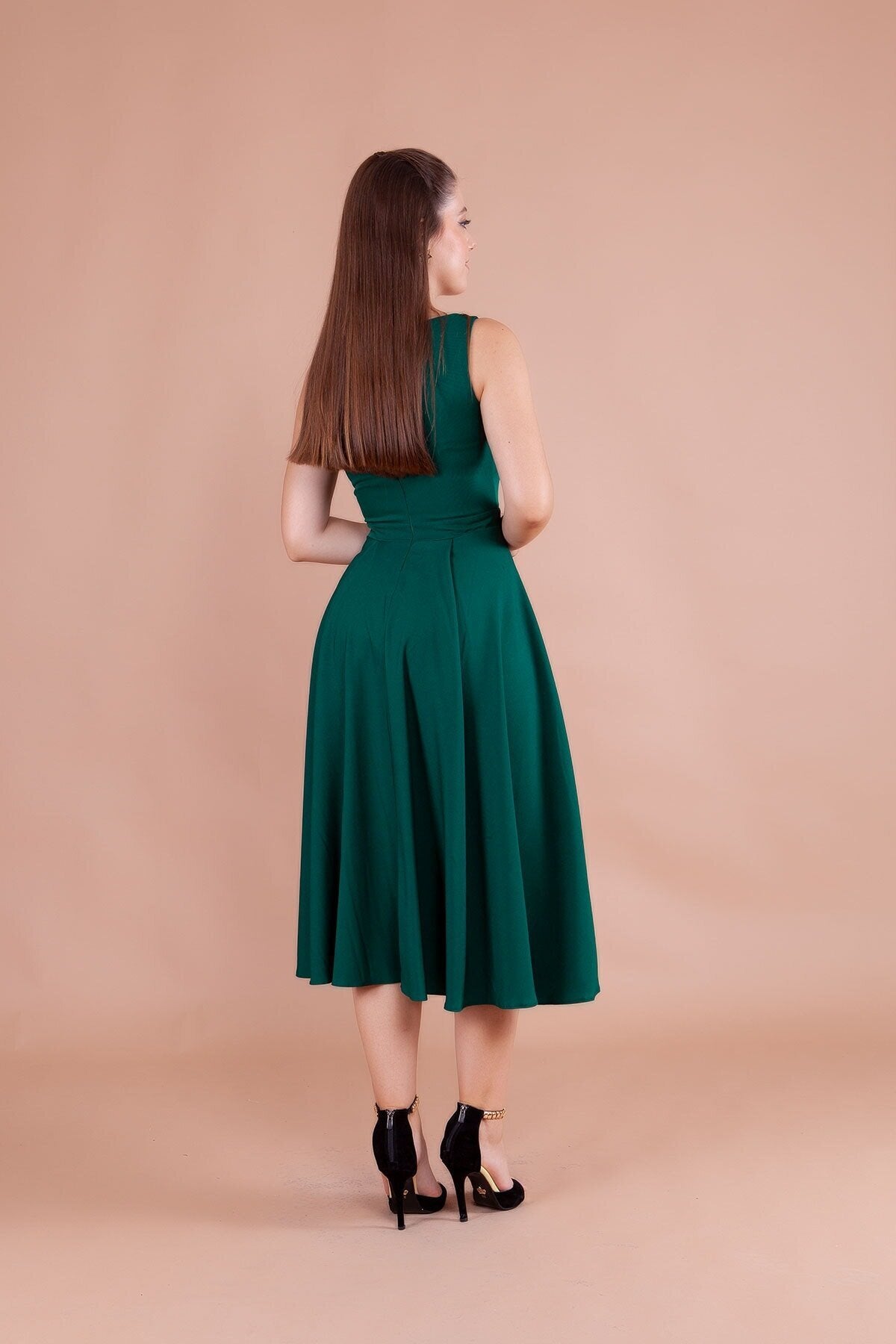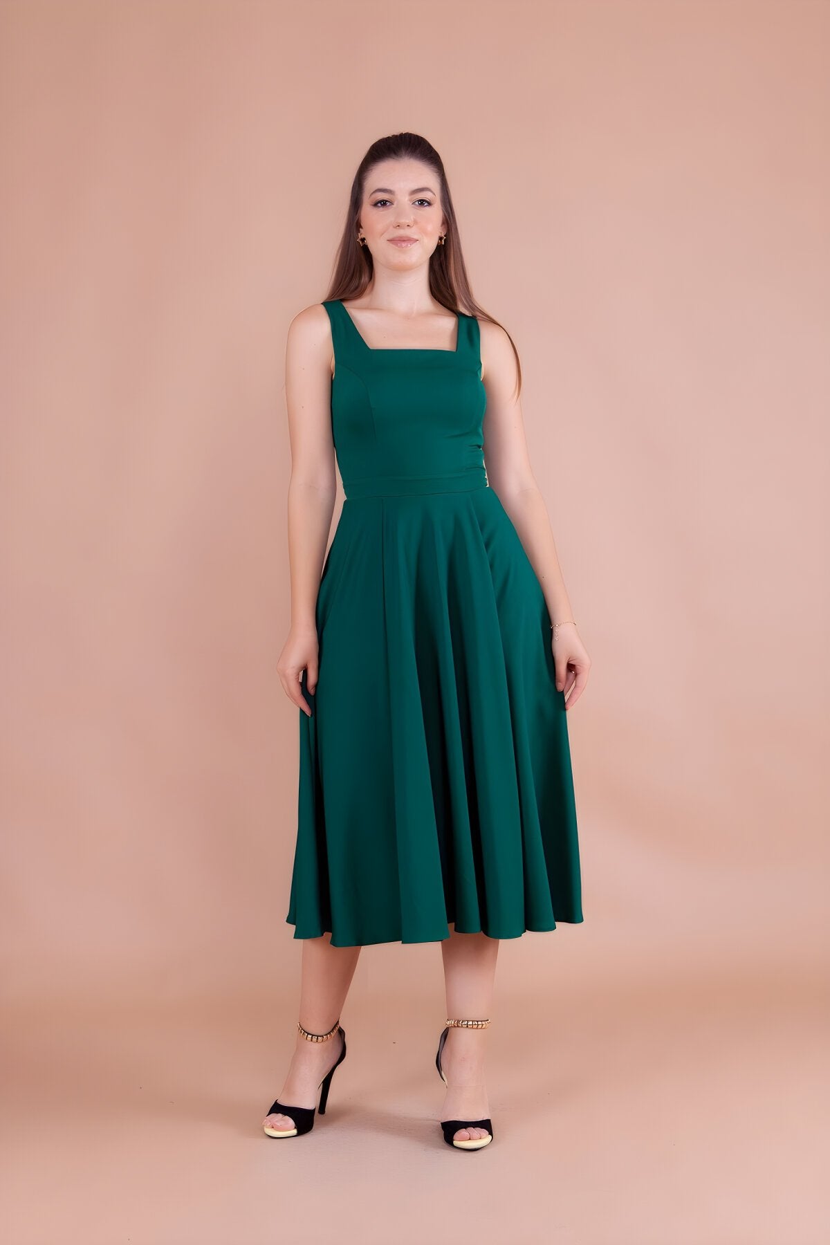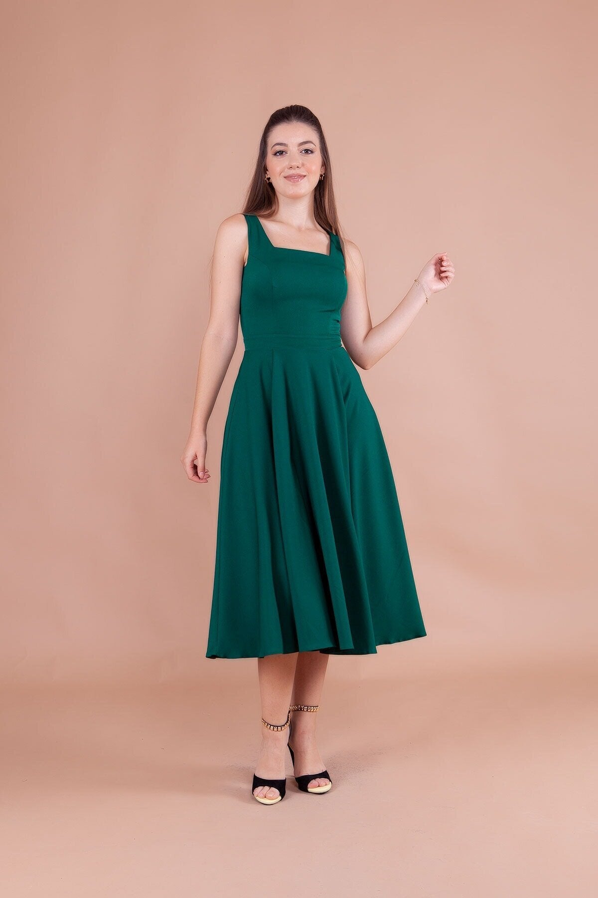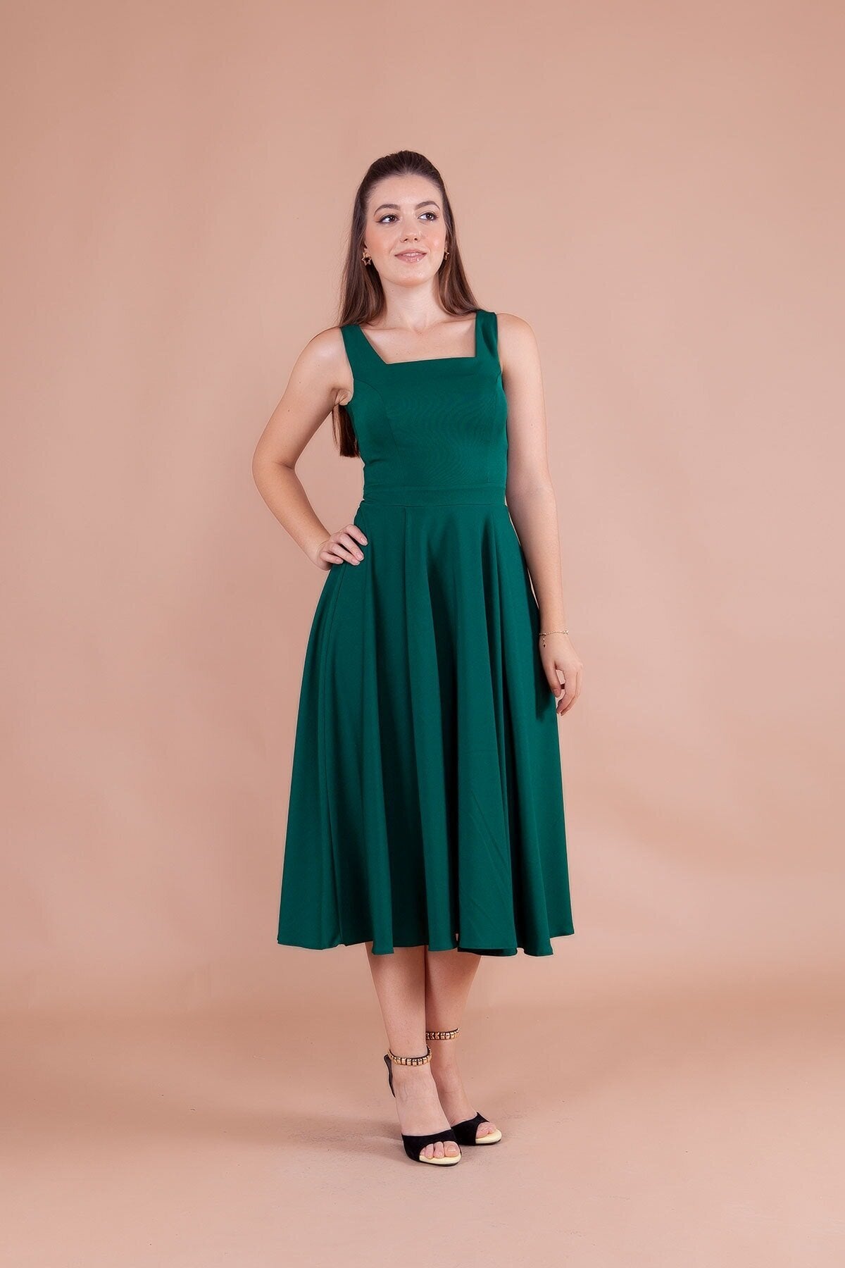 Embrace a look of refined grace with this stunning emerald midi dress, designed to accentuate your natural elegance. The structured bodice meets a beautifully flared skirt, creating a classic A-line silhouette that offers both comfort and a high-fashion aesthetic that never goes out of style.