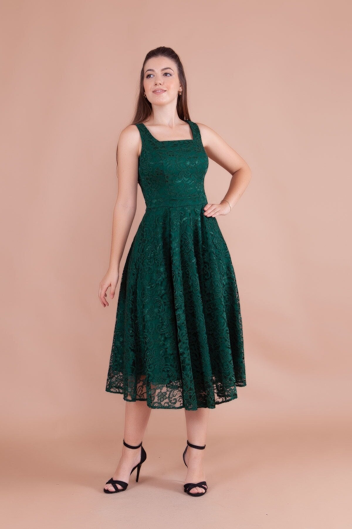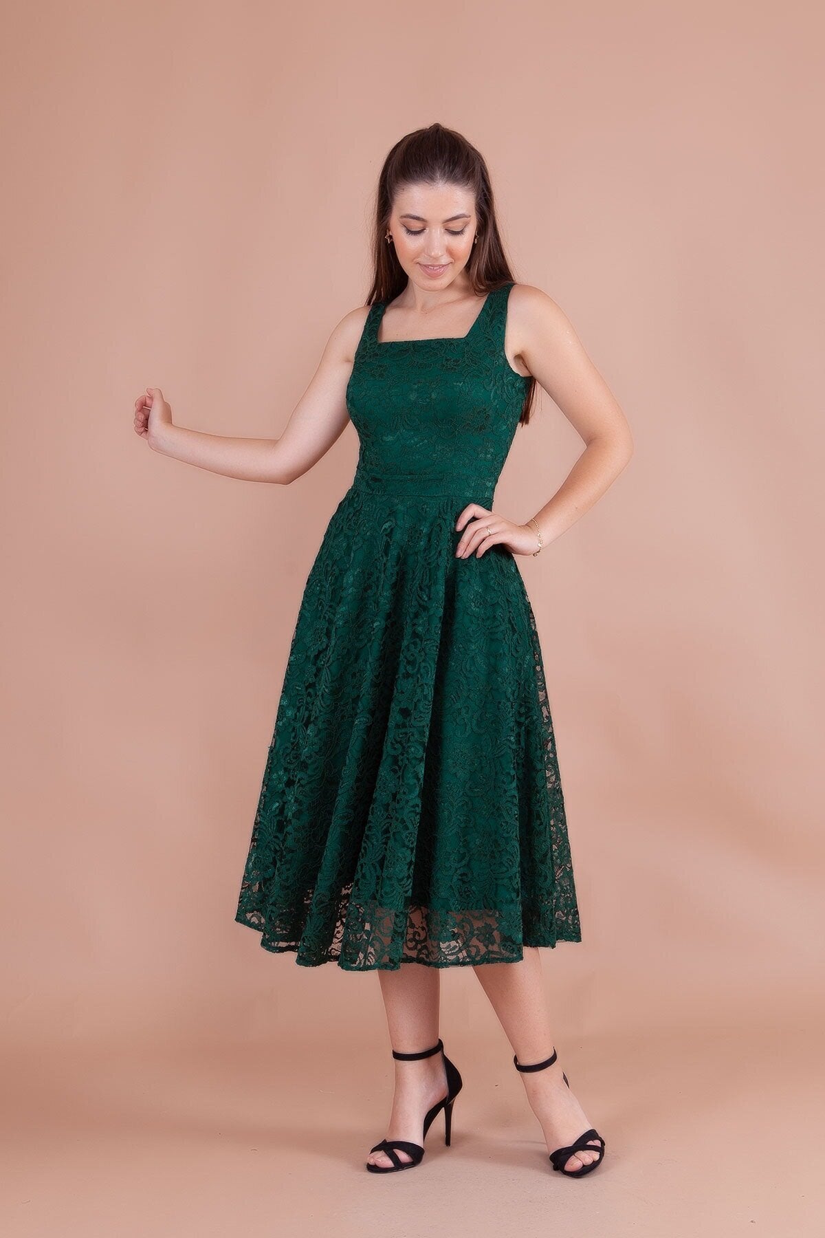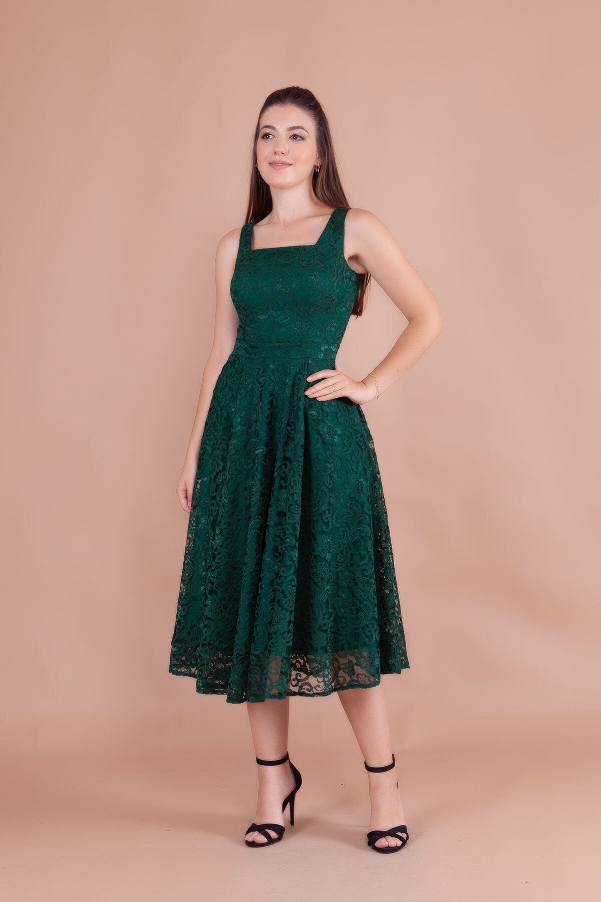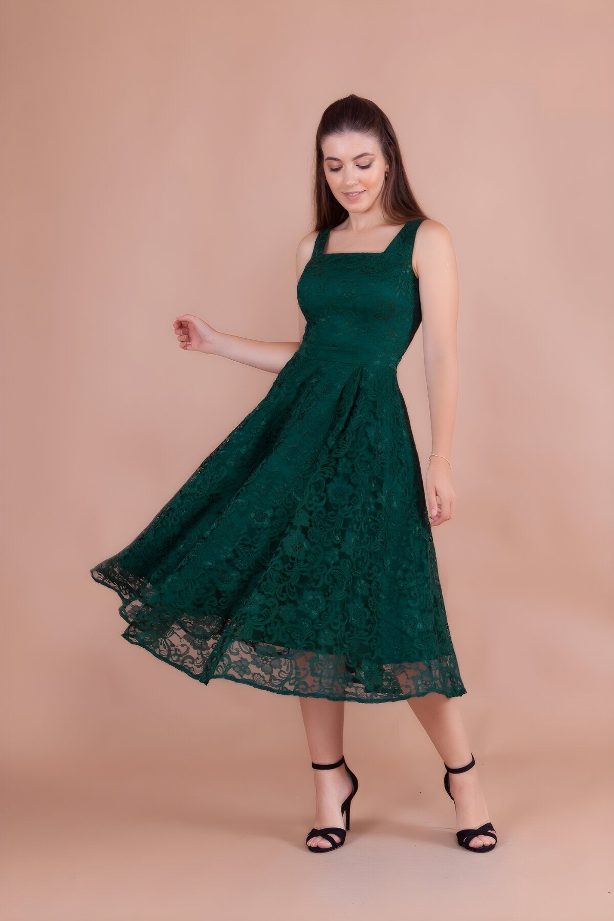 - Intricate French Lace Detail: The dress is finished with a beautifully scalloped midi hemline and a slightly sheer lace overlay, adding a touch of ethereal lightness and high-end texture to the deep emerald hue.