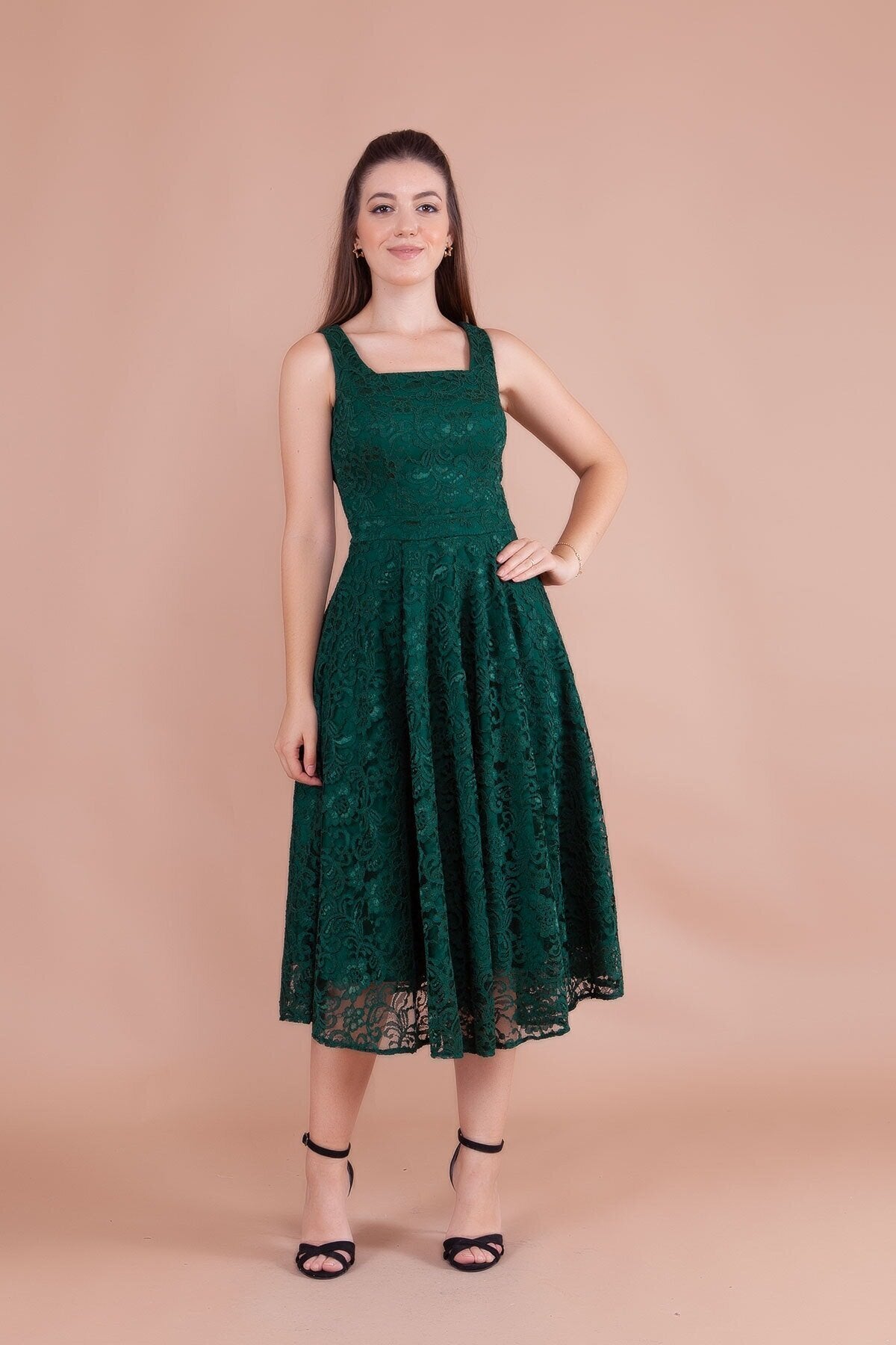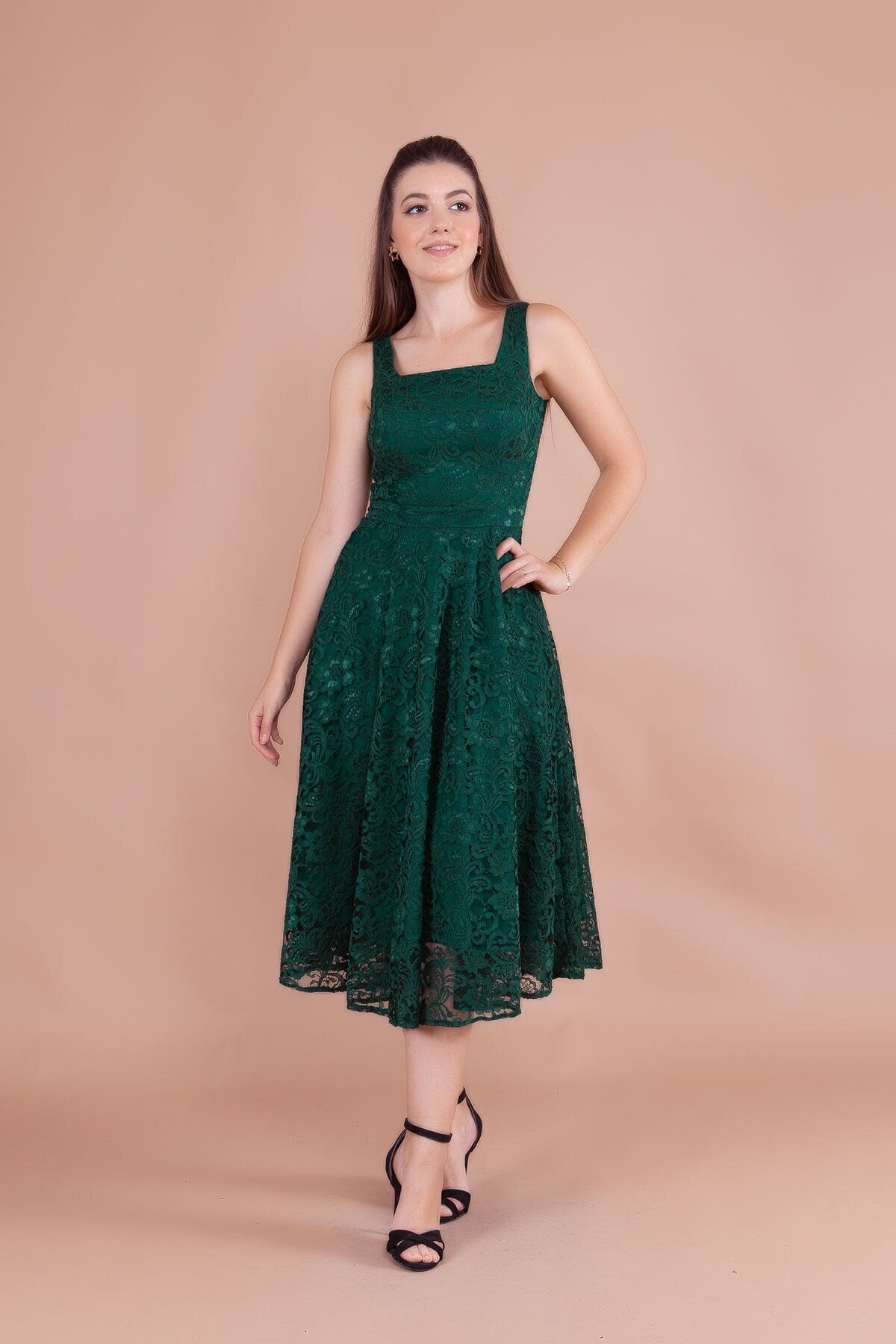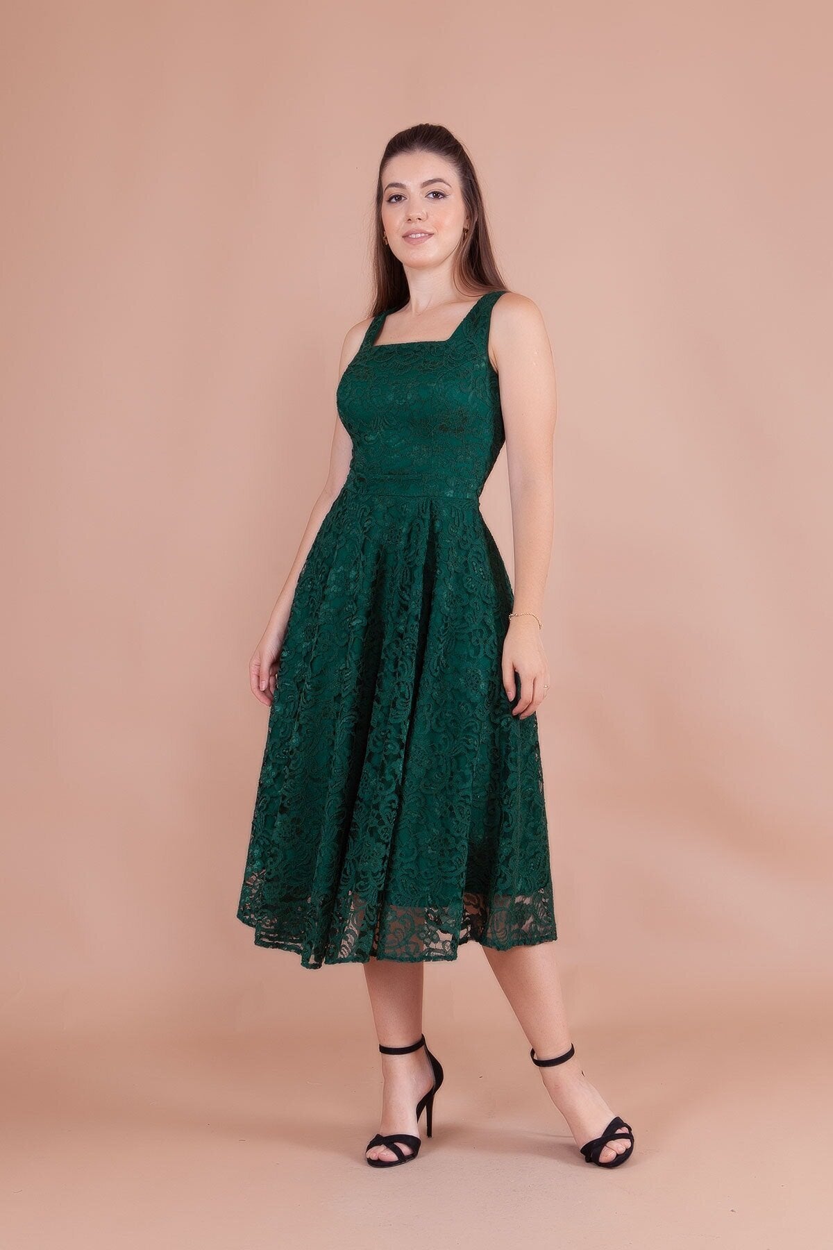 Midi Square Neck Thick Strap French Lace Evening Dress - Emerald