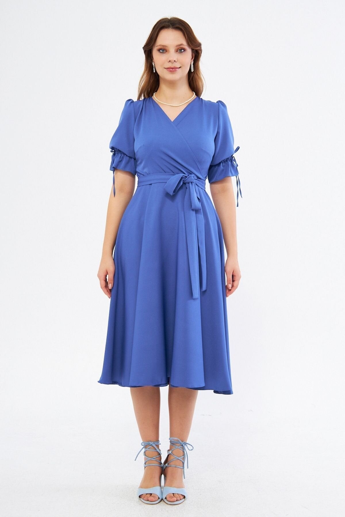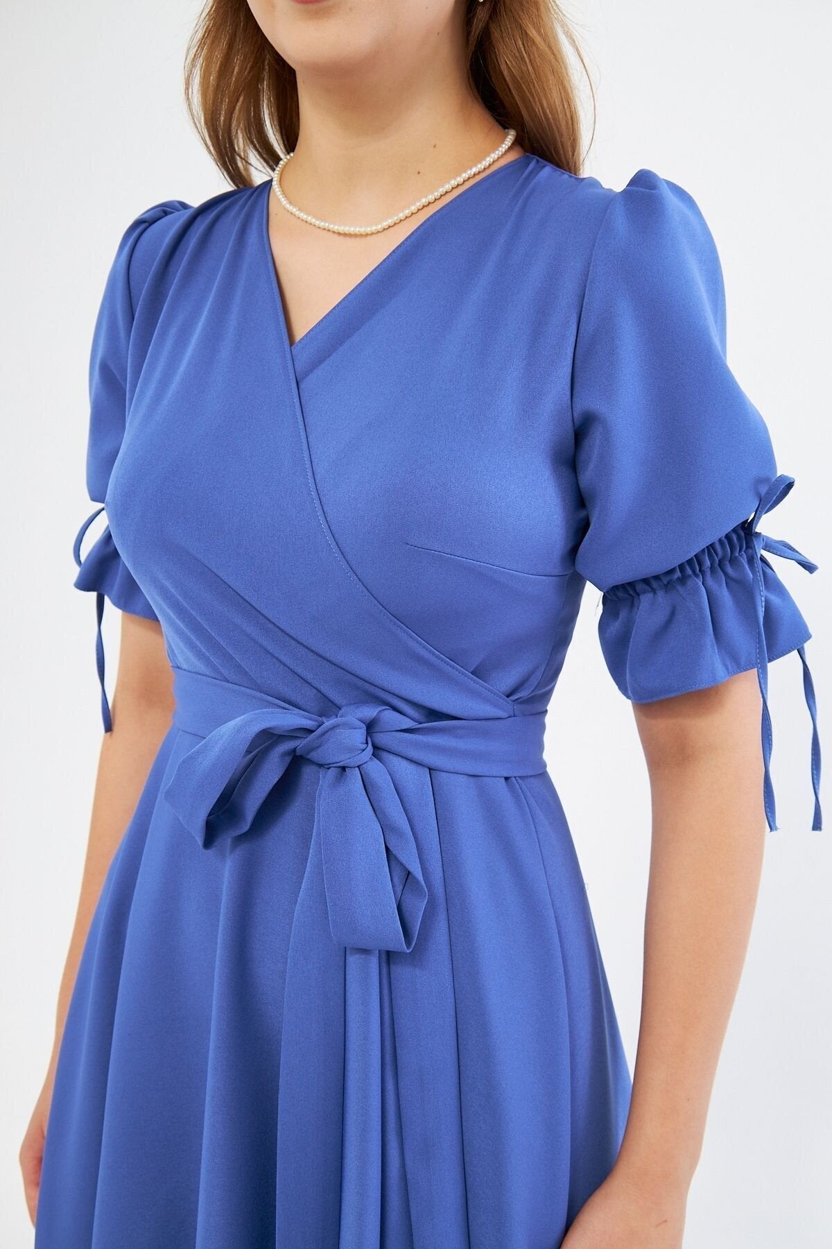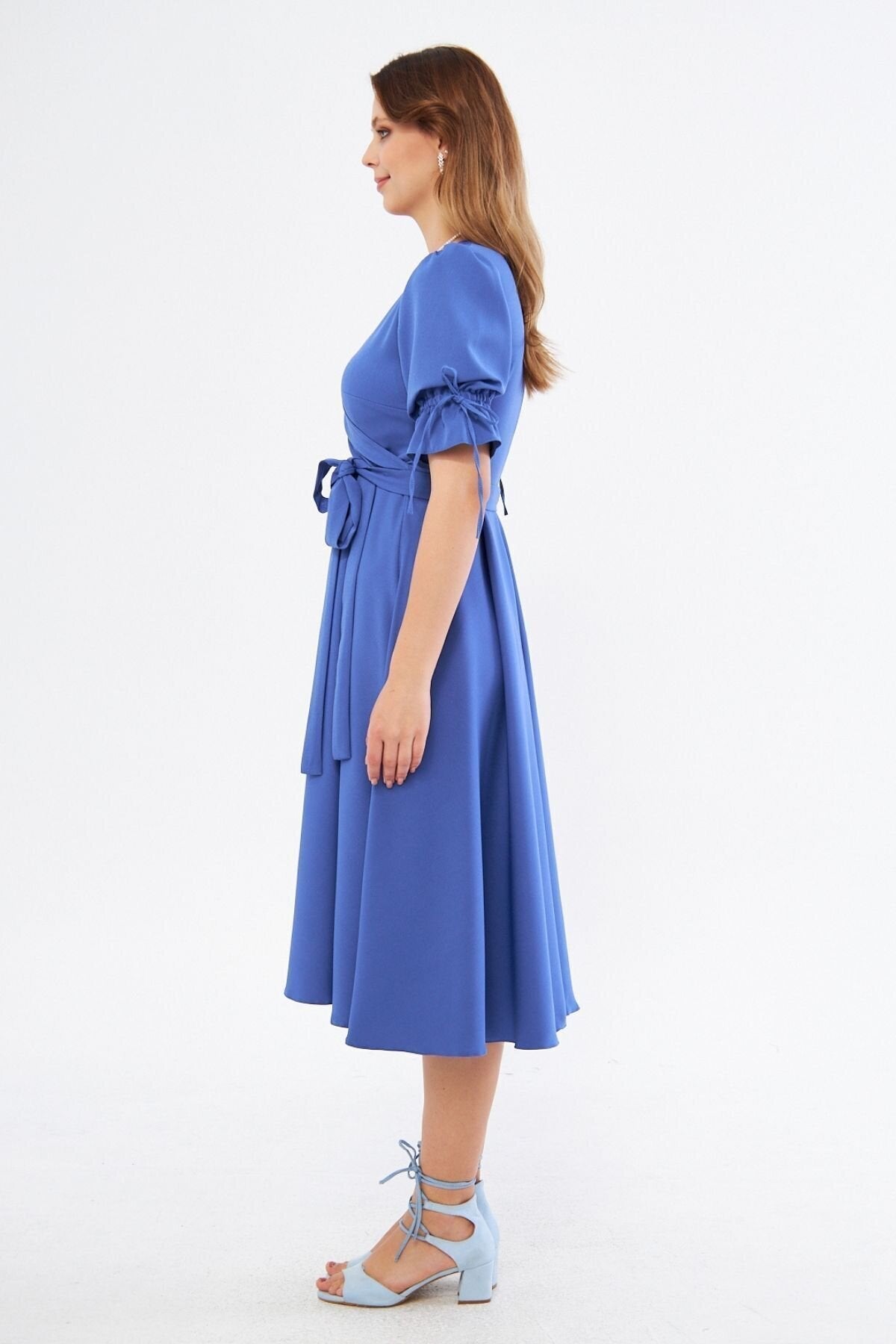 Midi Surplice Neck Ruched Evening Dress - Denim Blue