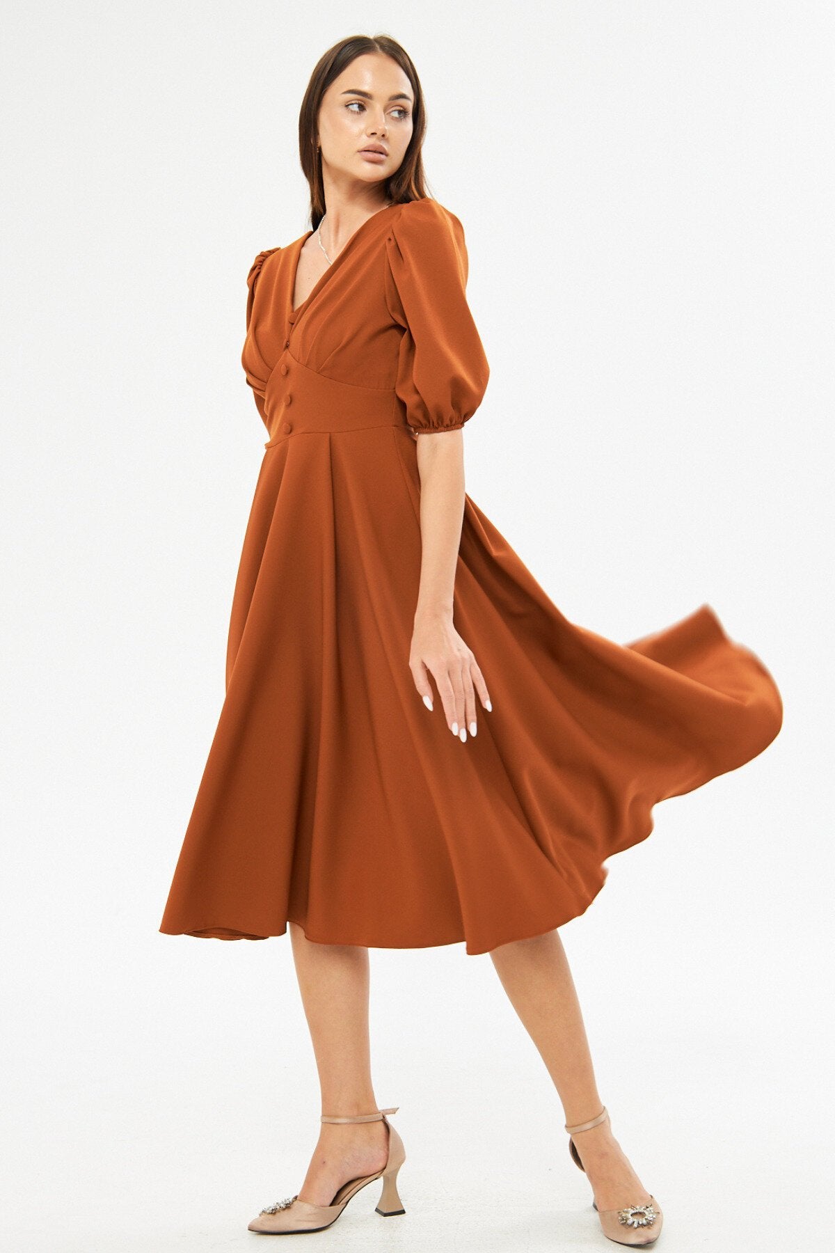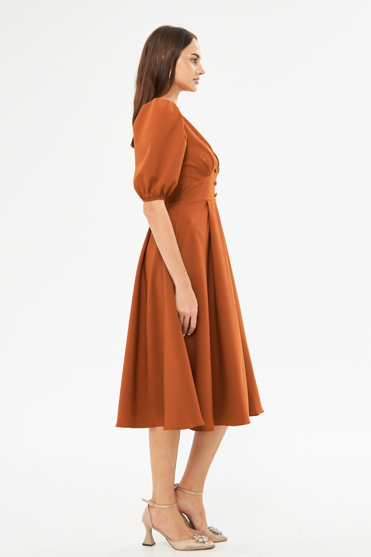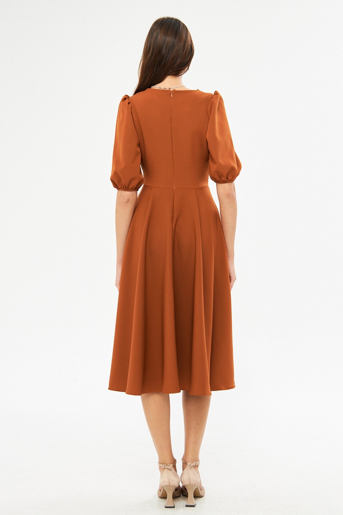 Midi V-Neck Balloon Sleeve Pleated Evening Dress - Cinnamon