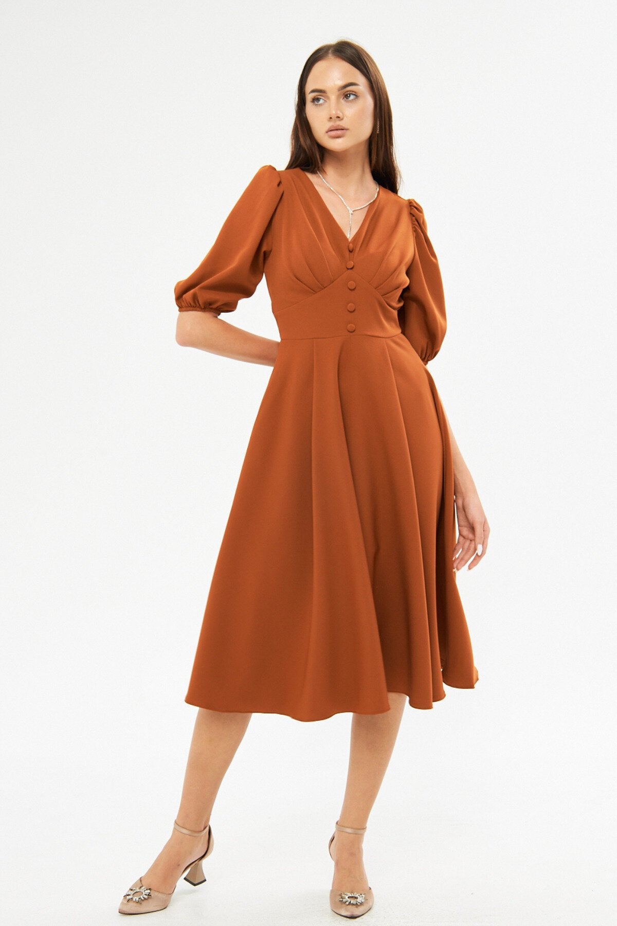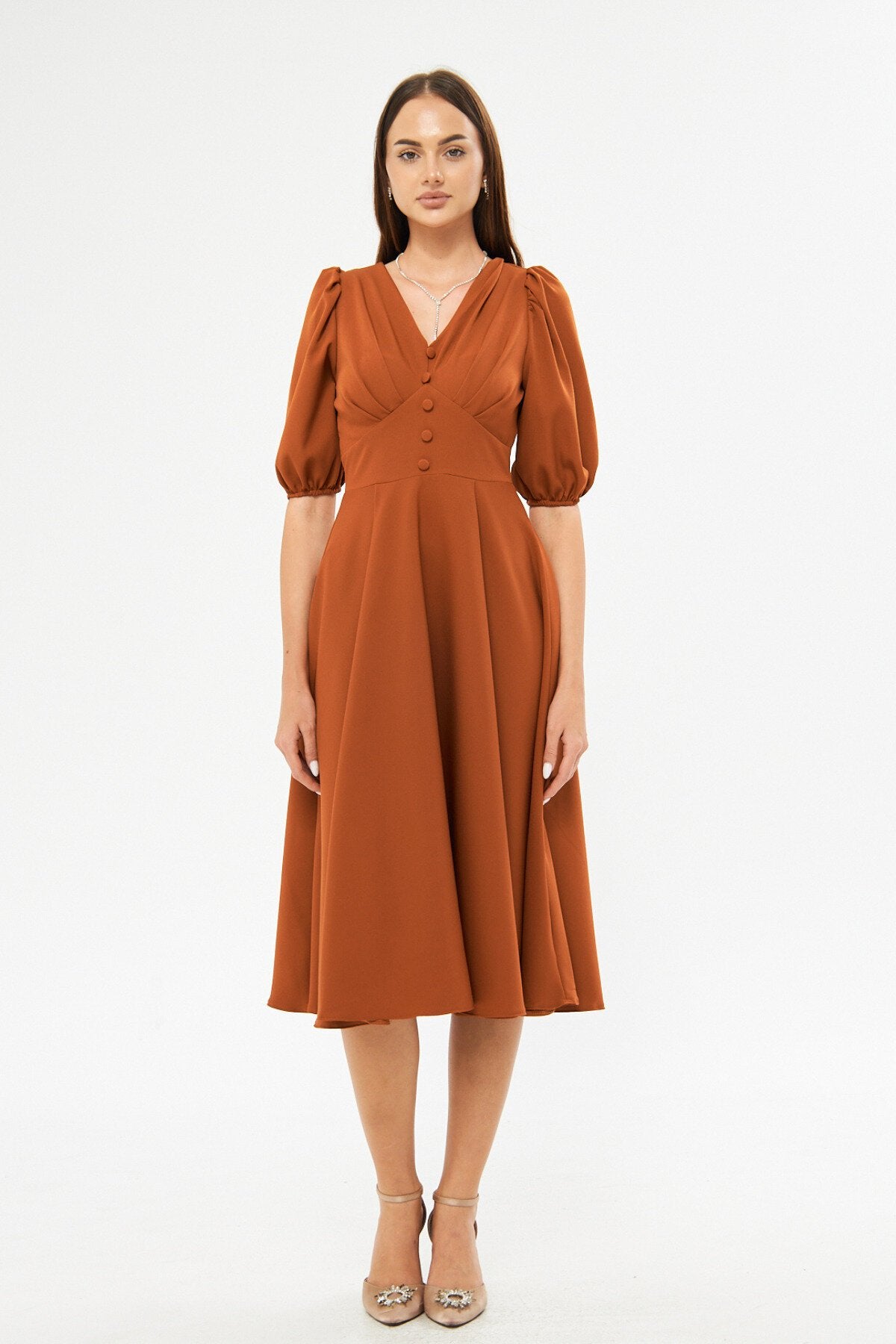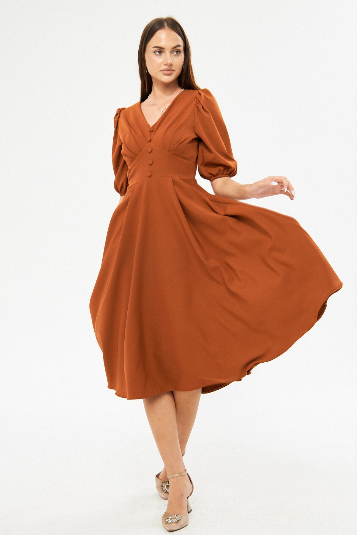 Midi V-Neck Balloon Sleeve Pleated Evening Dress - Cinnamon