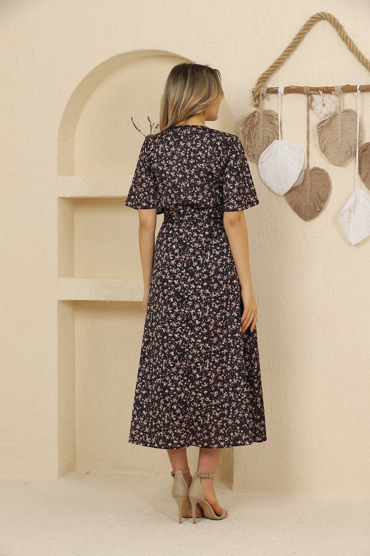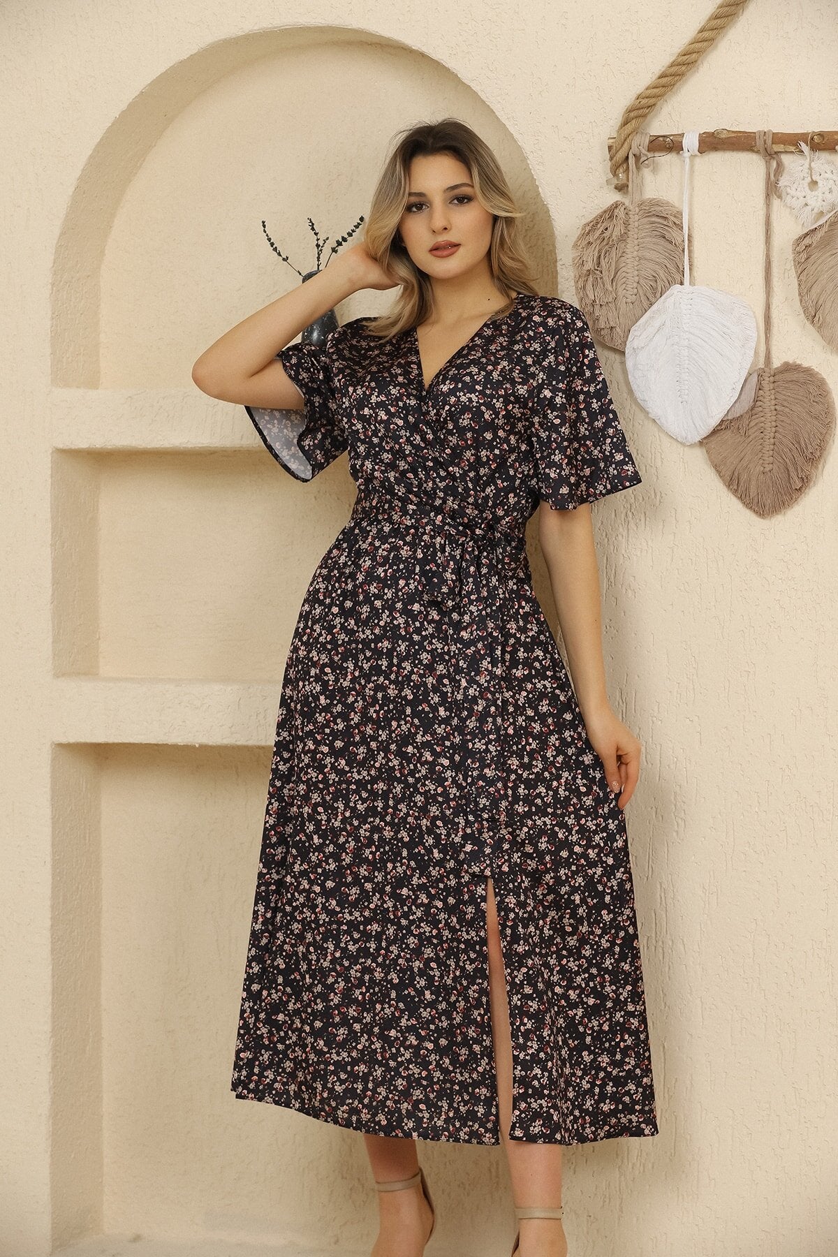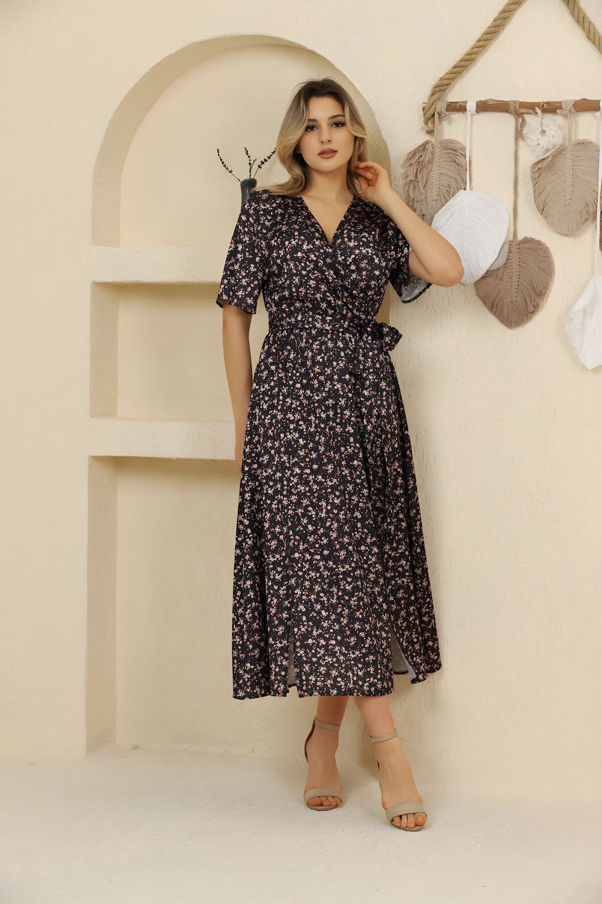 Midi Wrap Floral Patterned Satin Slit Dress - Black