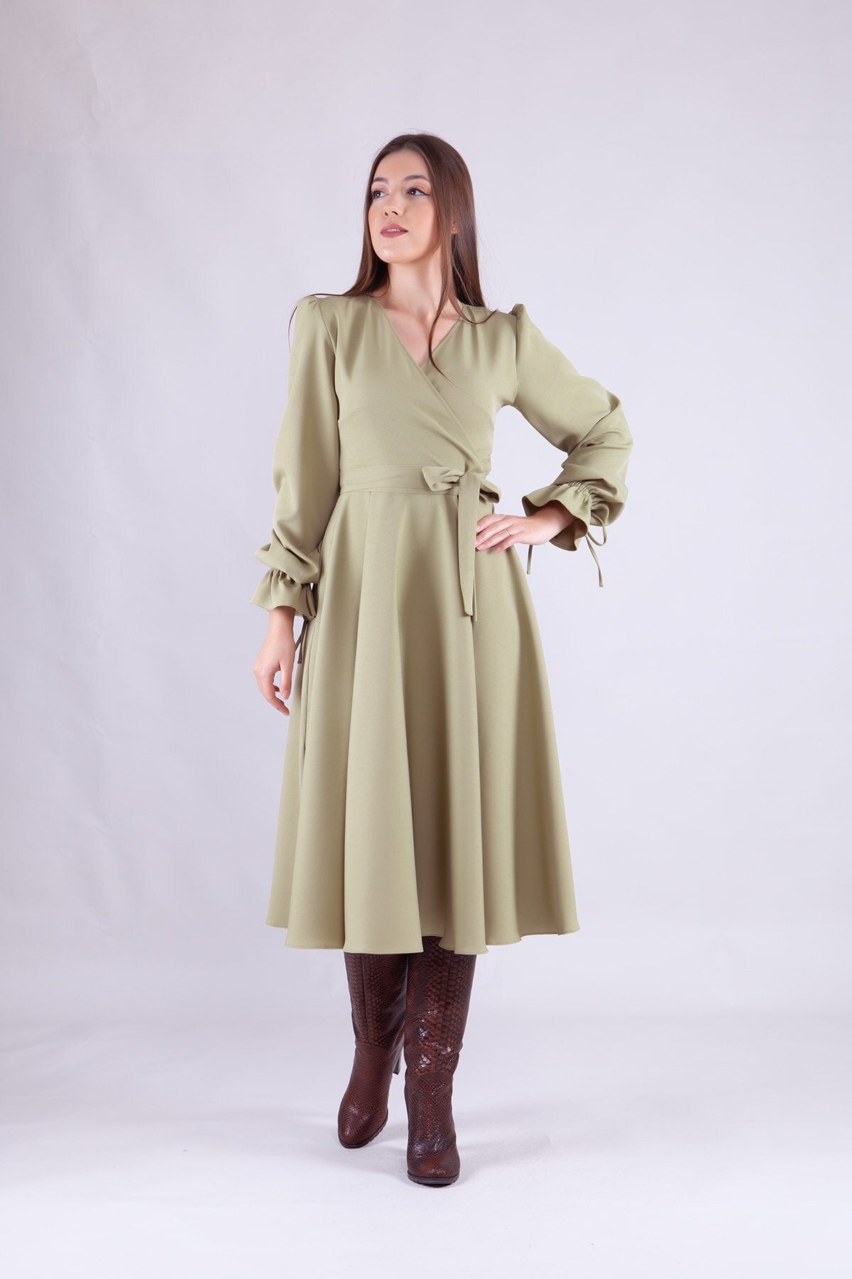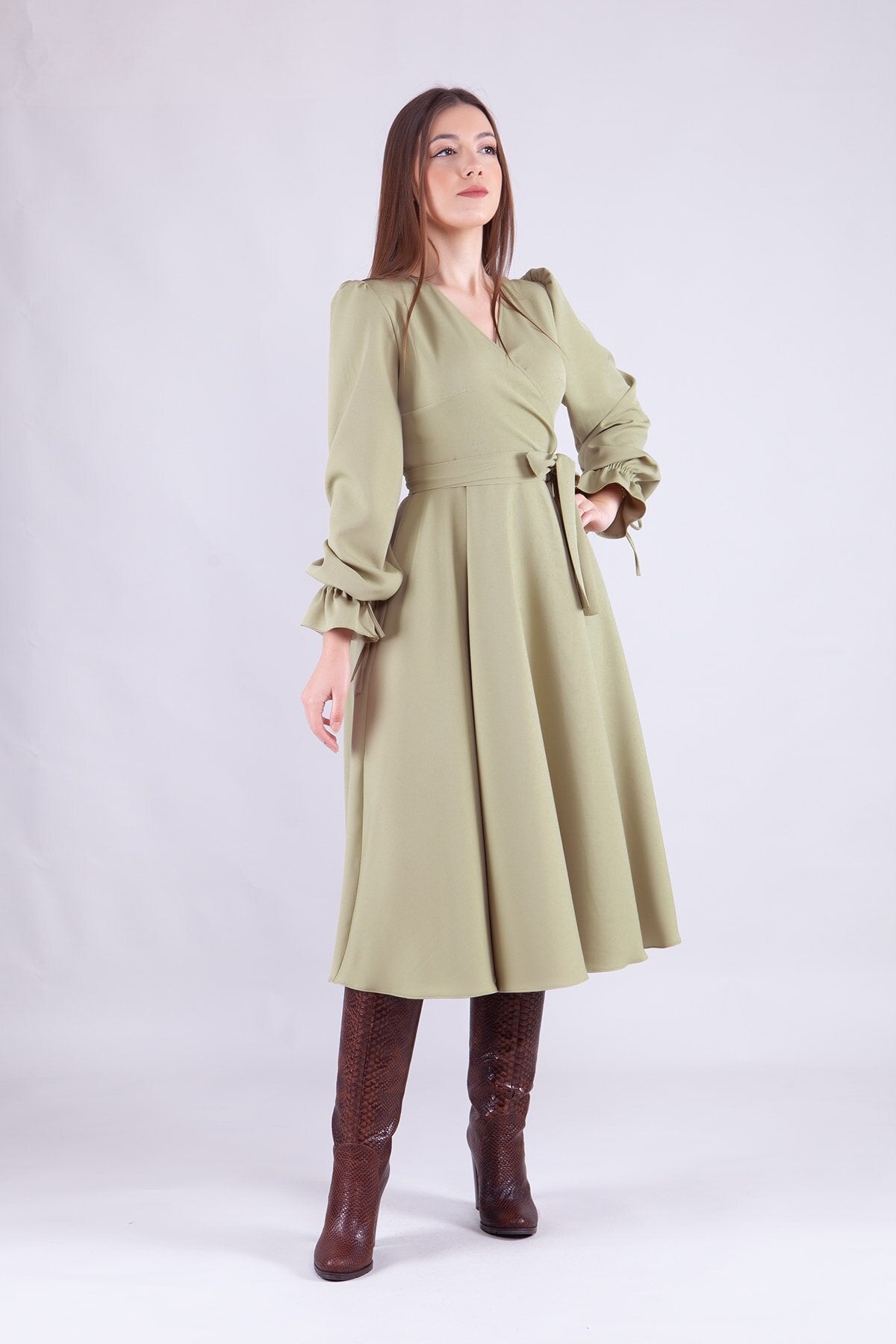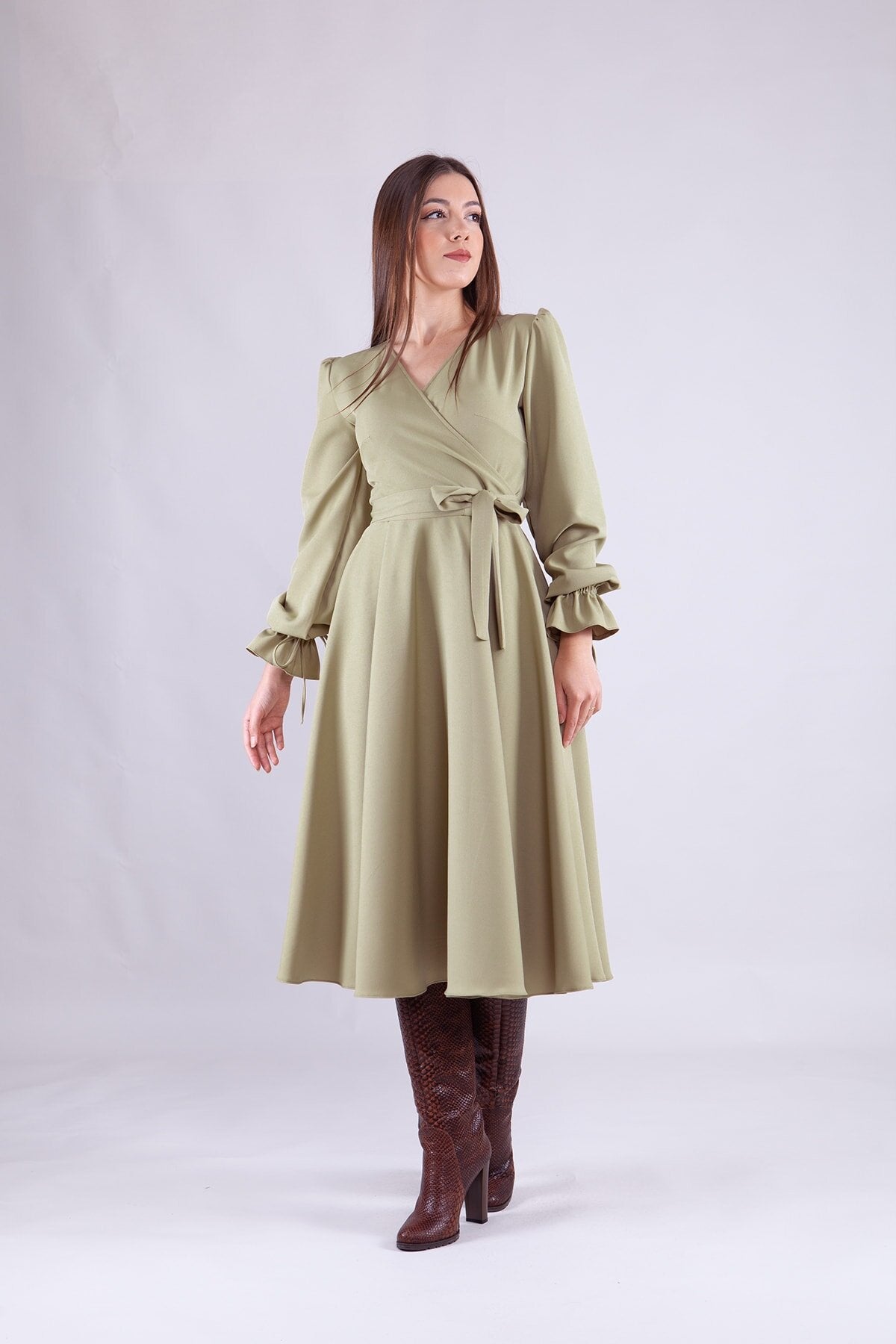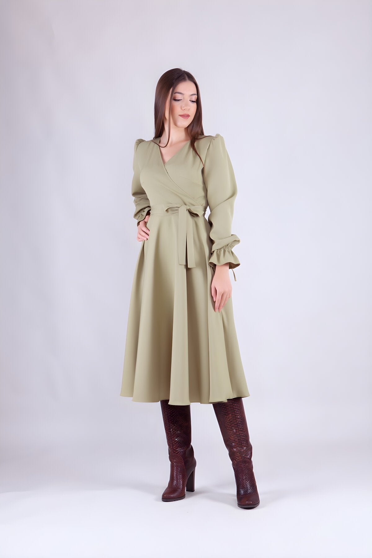 Midi Wrap-Neck Long Sleeve Dress - Oil Green