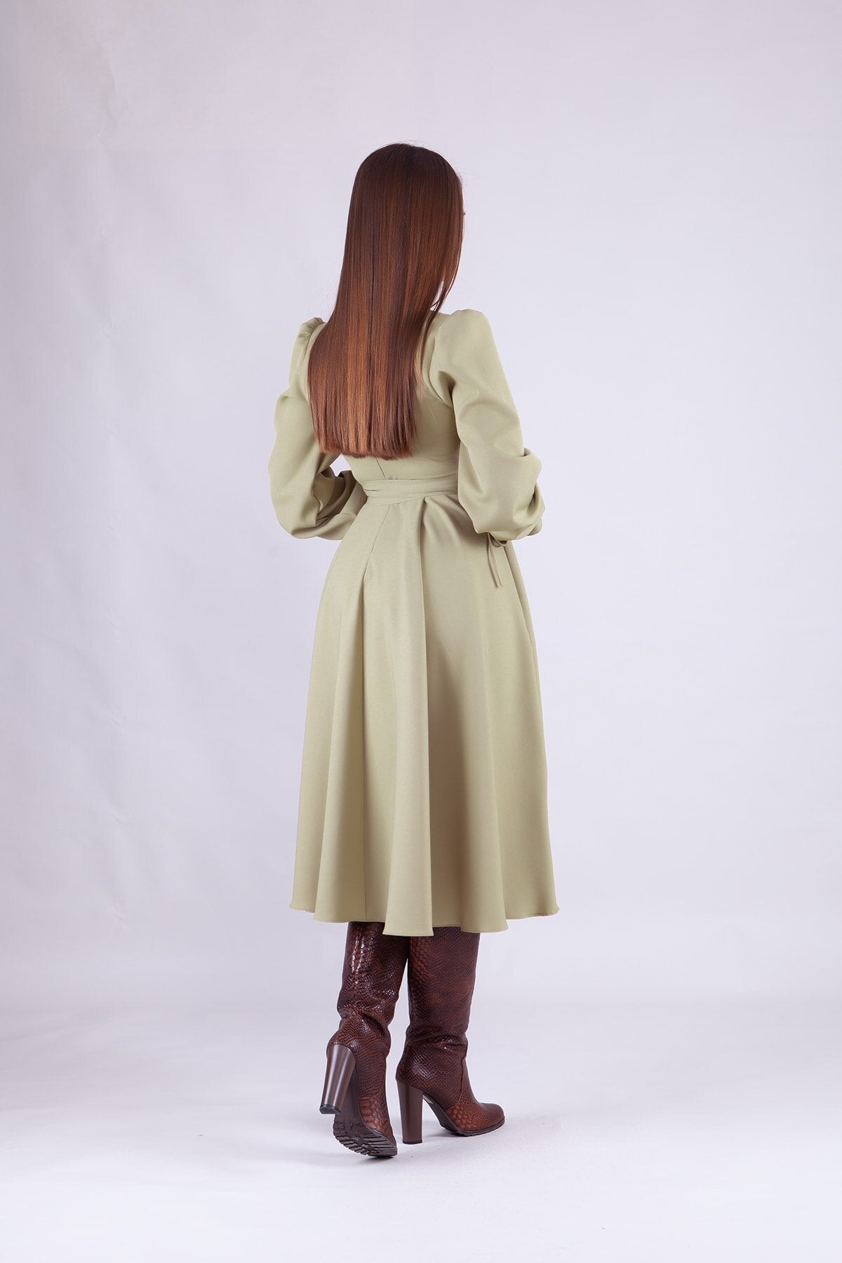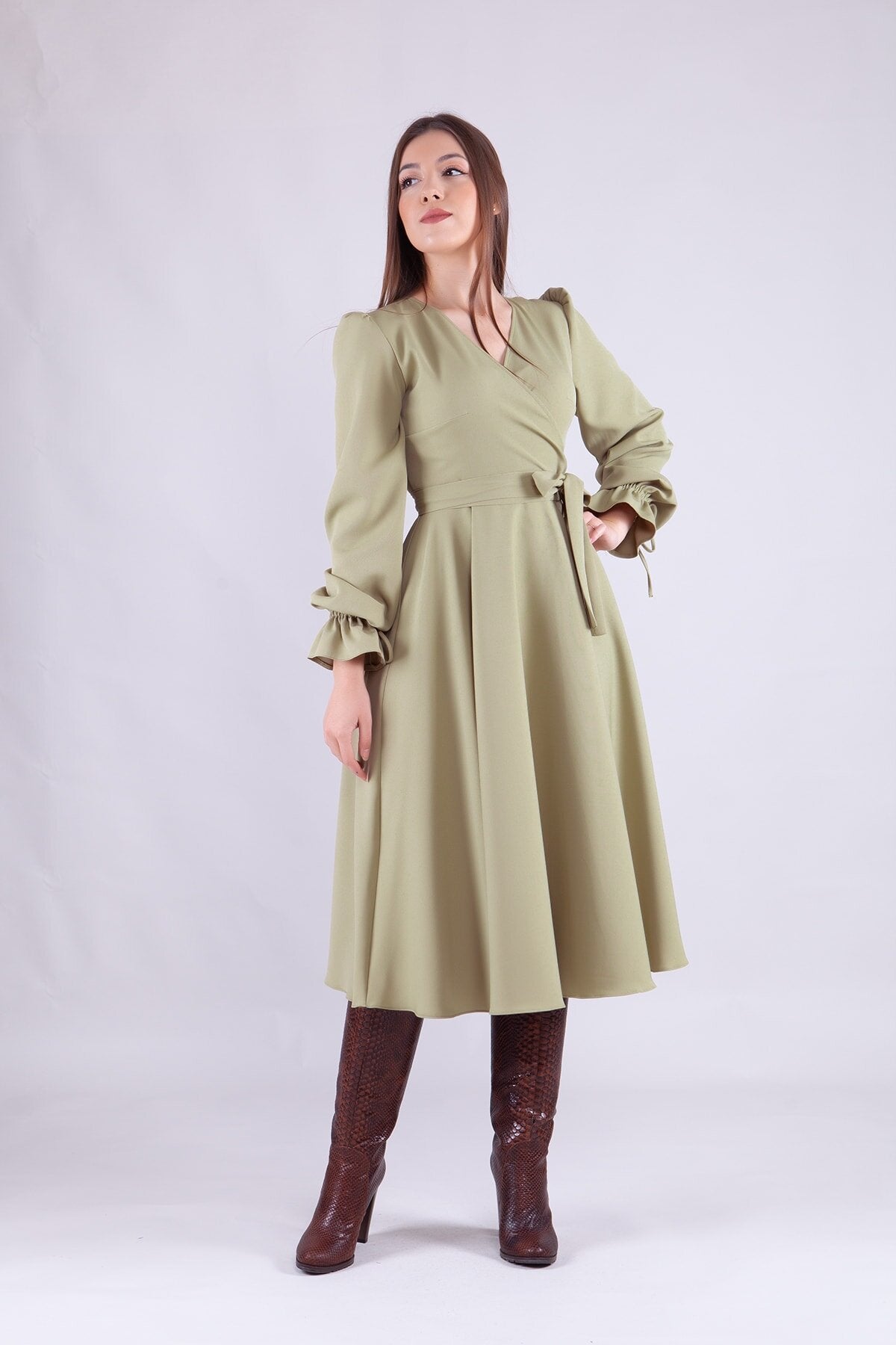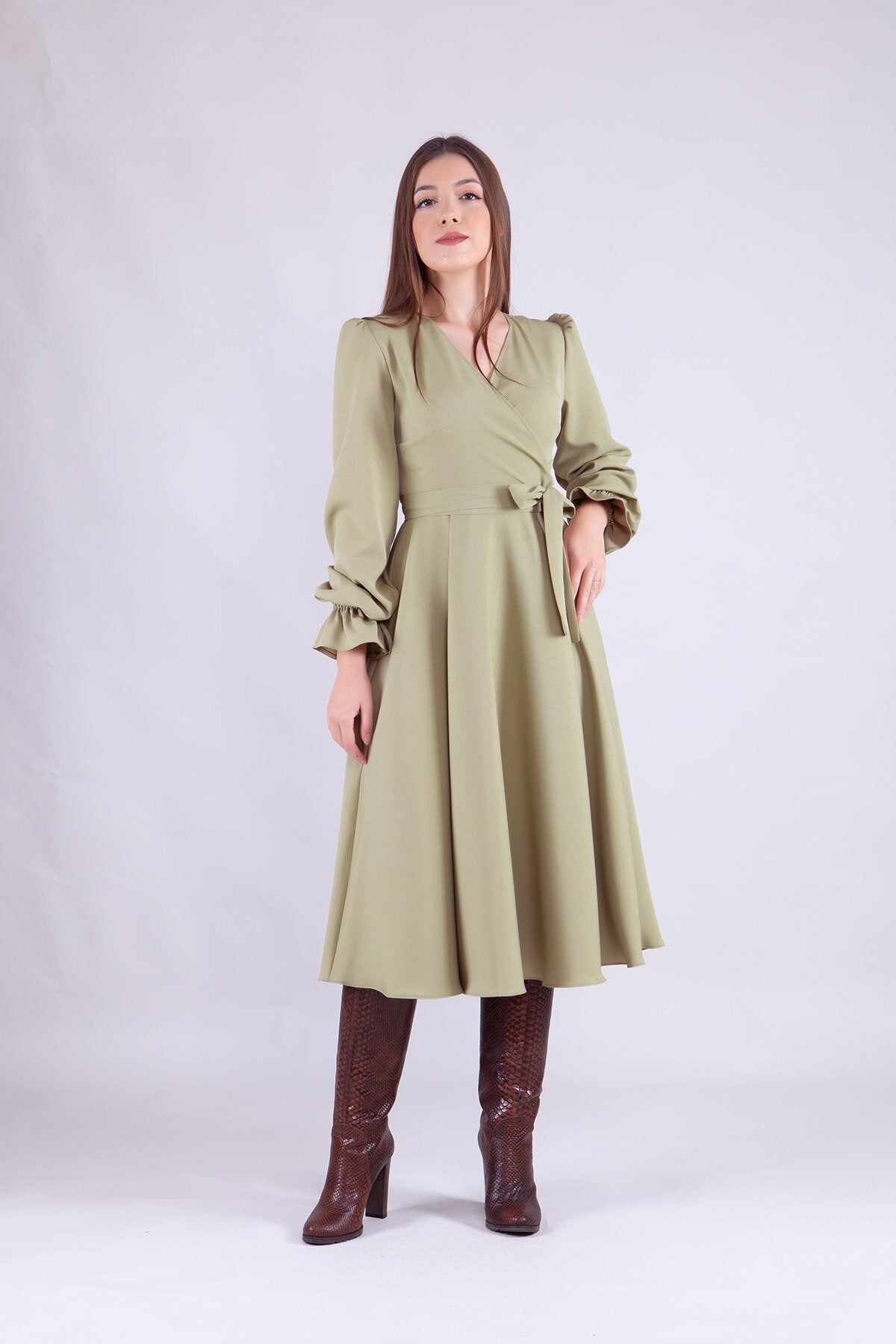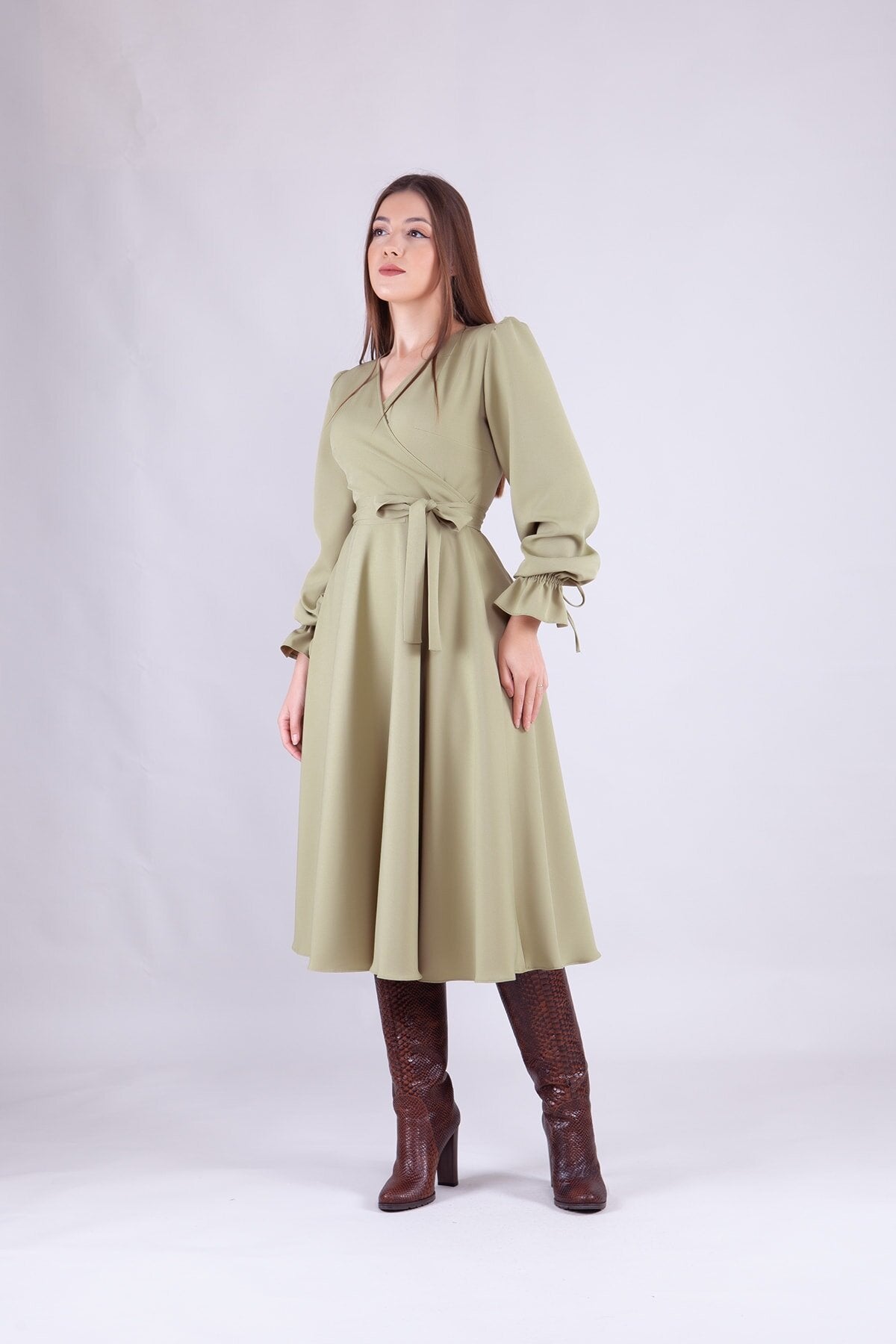 Midi Wrap-Neck Long Sleeve Dress - Oil Green