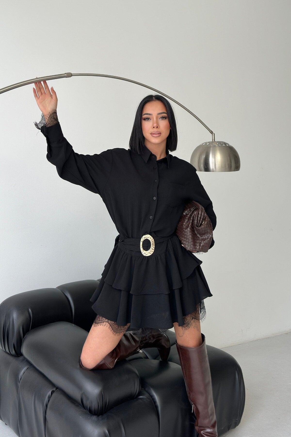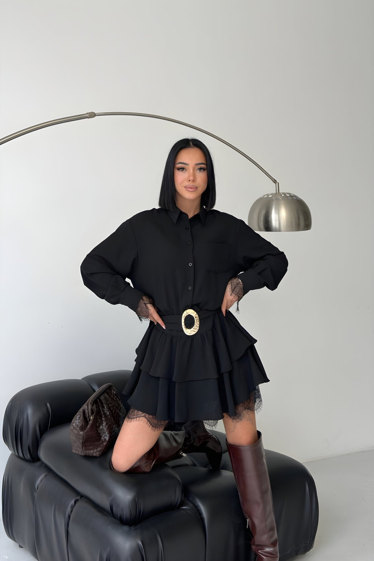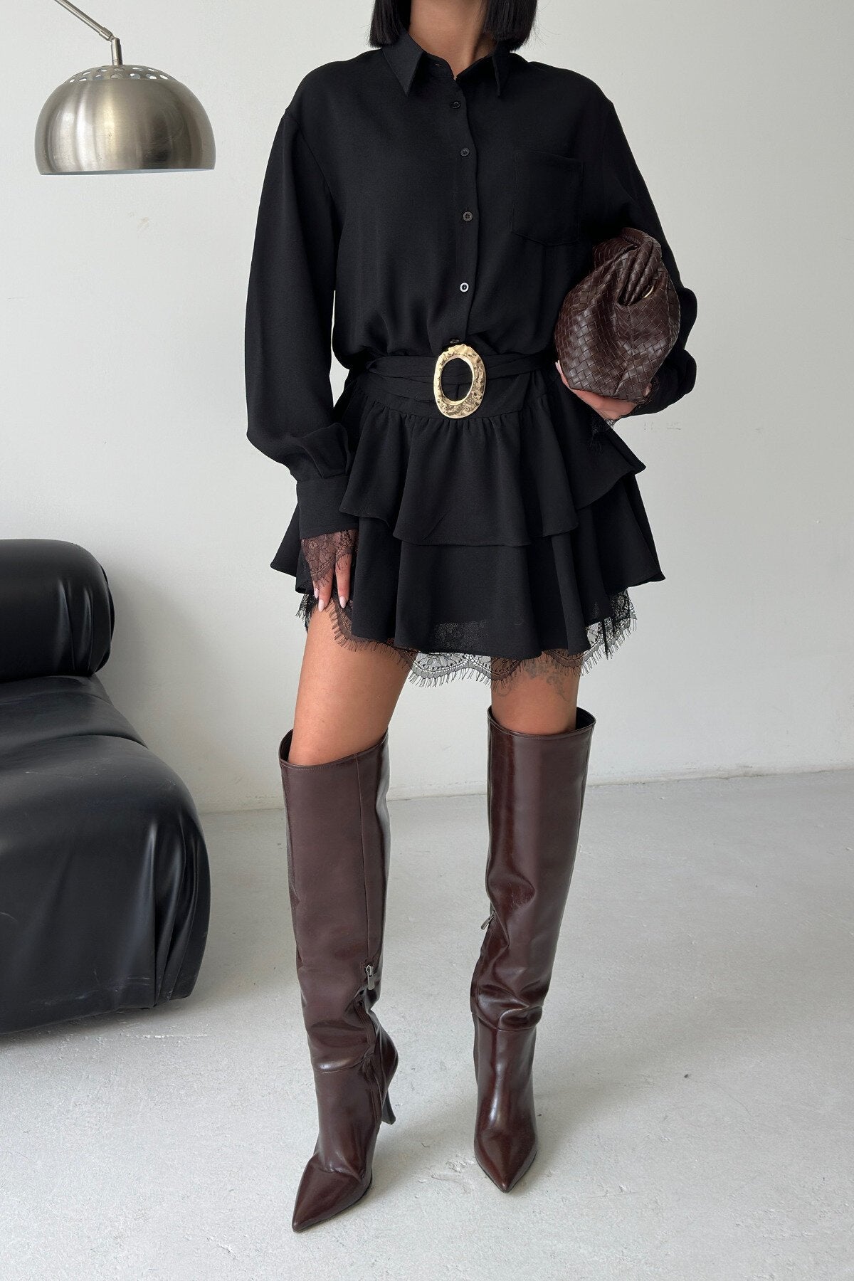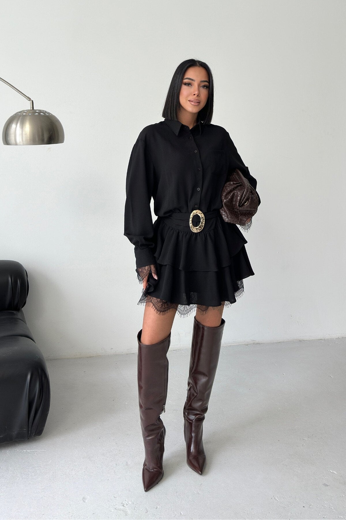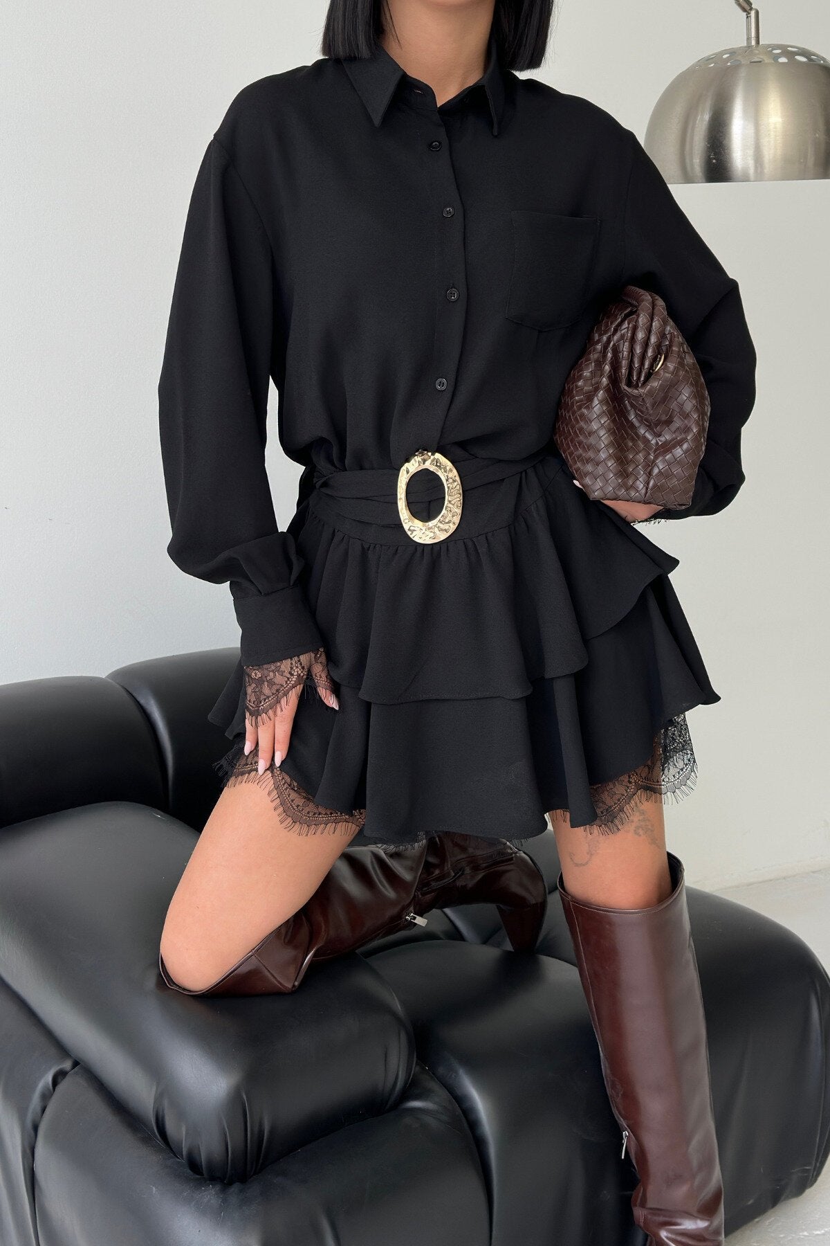 Mini Belted Shirt Lace Detail Dress - Black