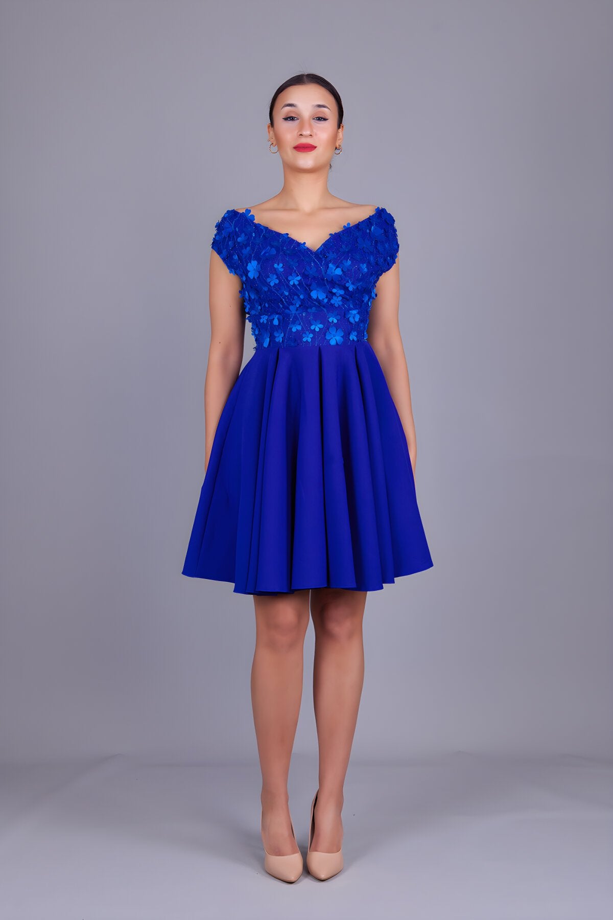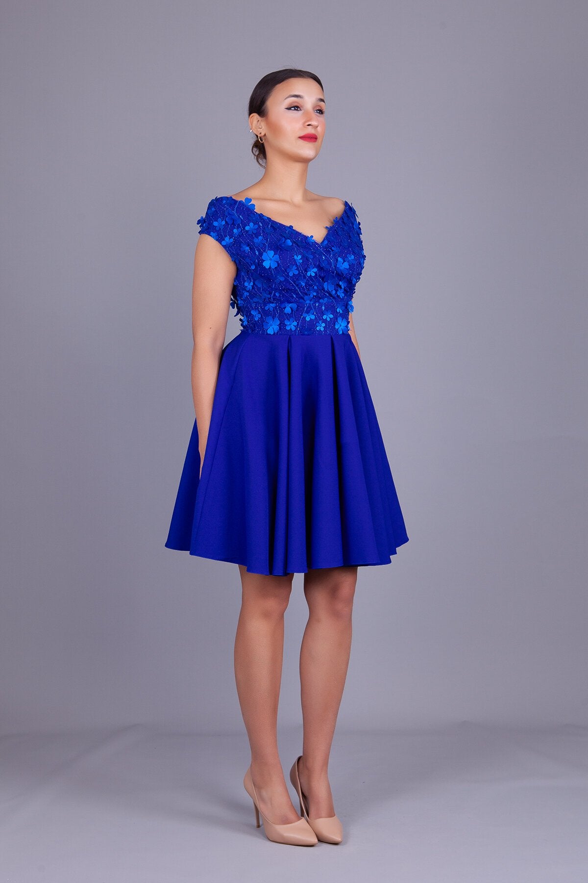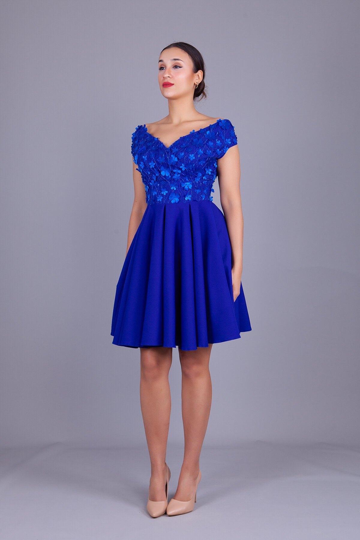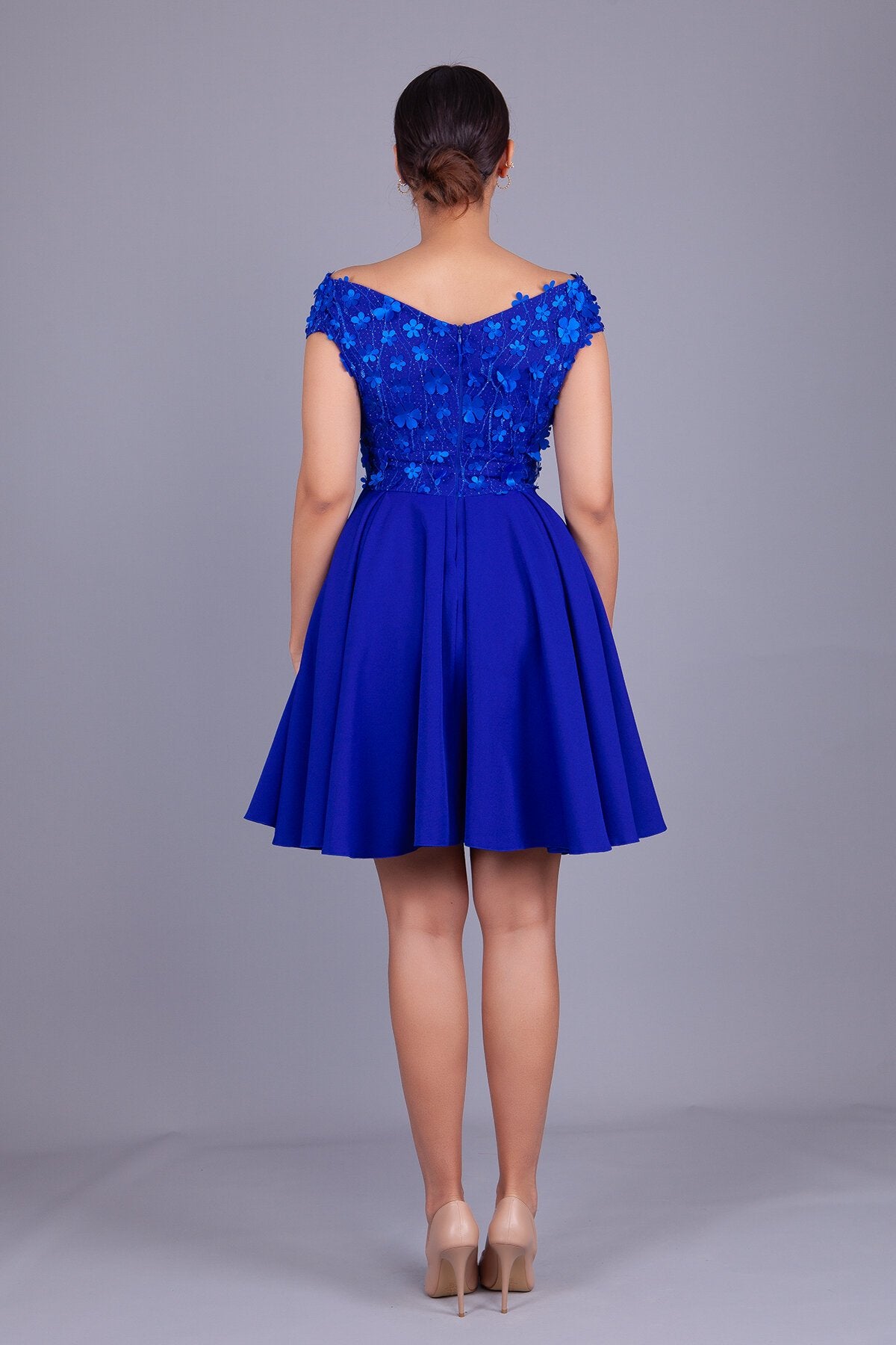 Mini Boat Neck Floral Tulle Detail Evening Dress - Sax Blue