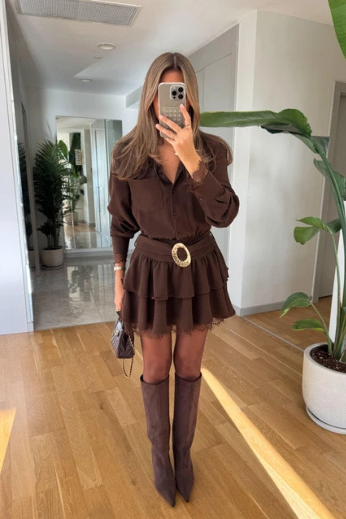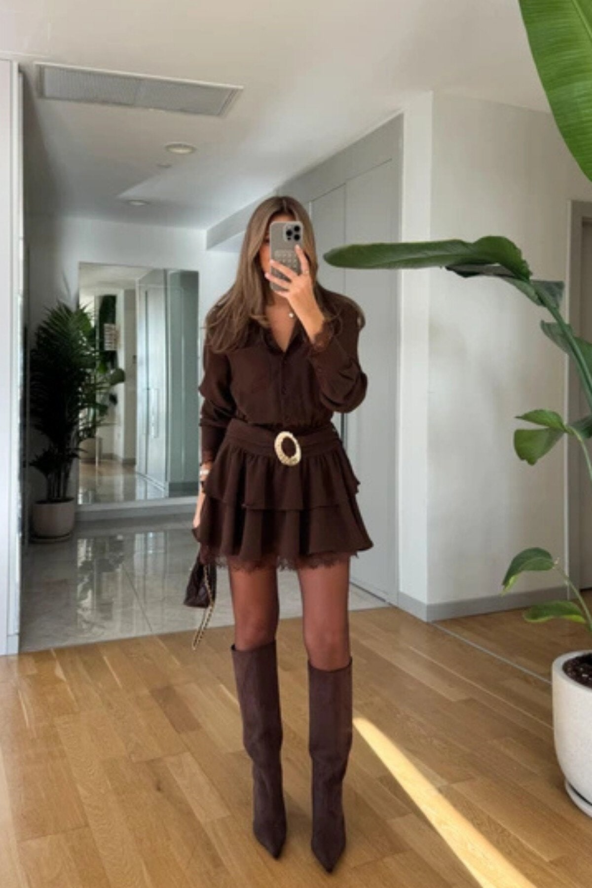 Versatile and effortlessly chic, this brown chiffon mini dress is a must-have for the woman who transitions seamlessly from professional settings to social gatherings. Its deep, earthy tone and layered textures make it an ideal choice for elevated year-round styling.