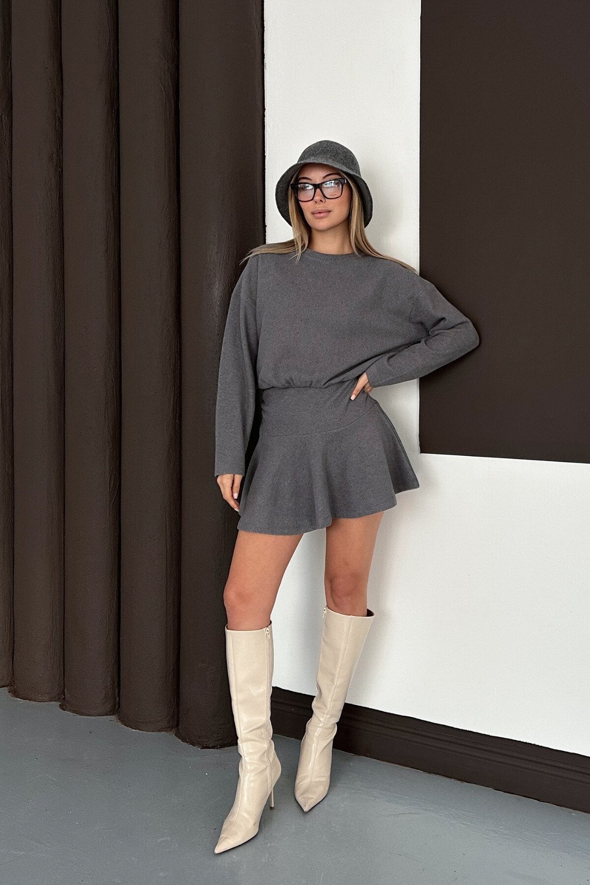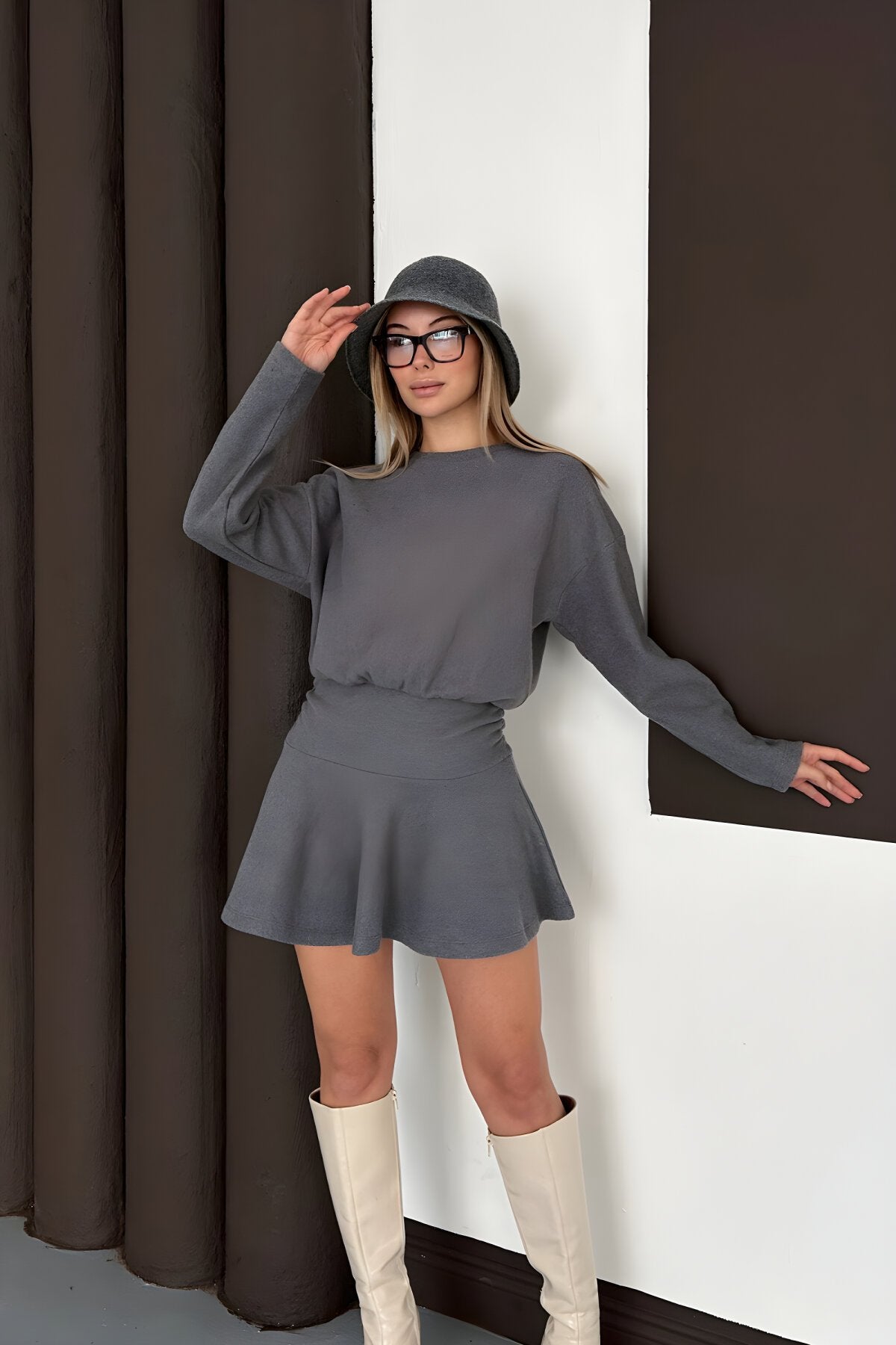 Mini Draped Crew Neck Dress - Anthracite
