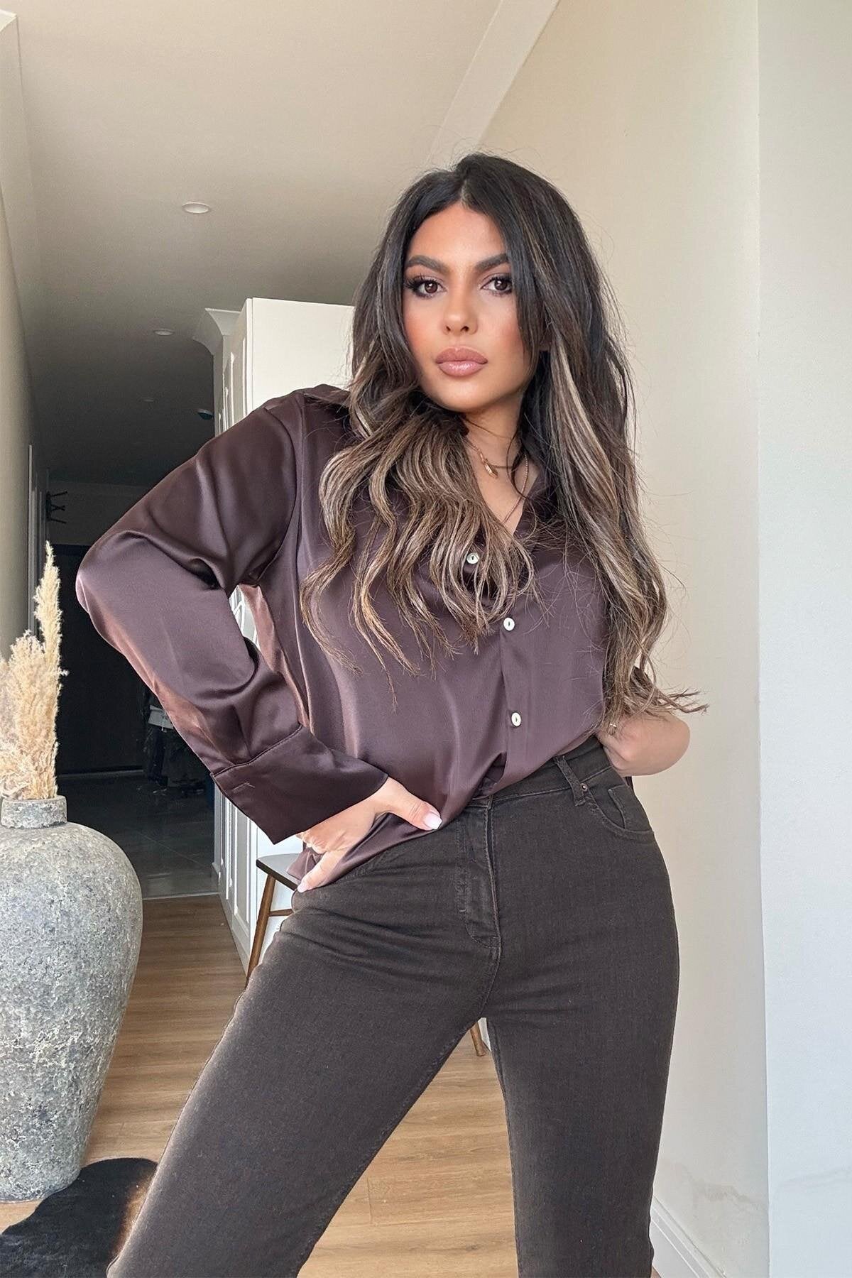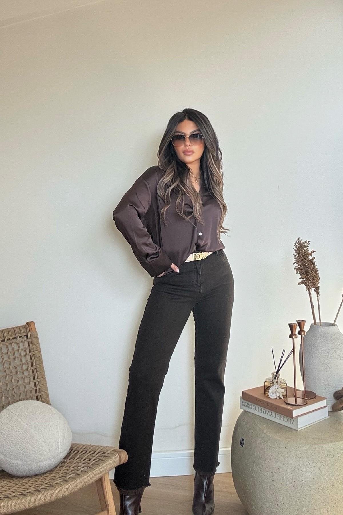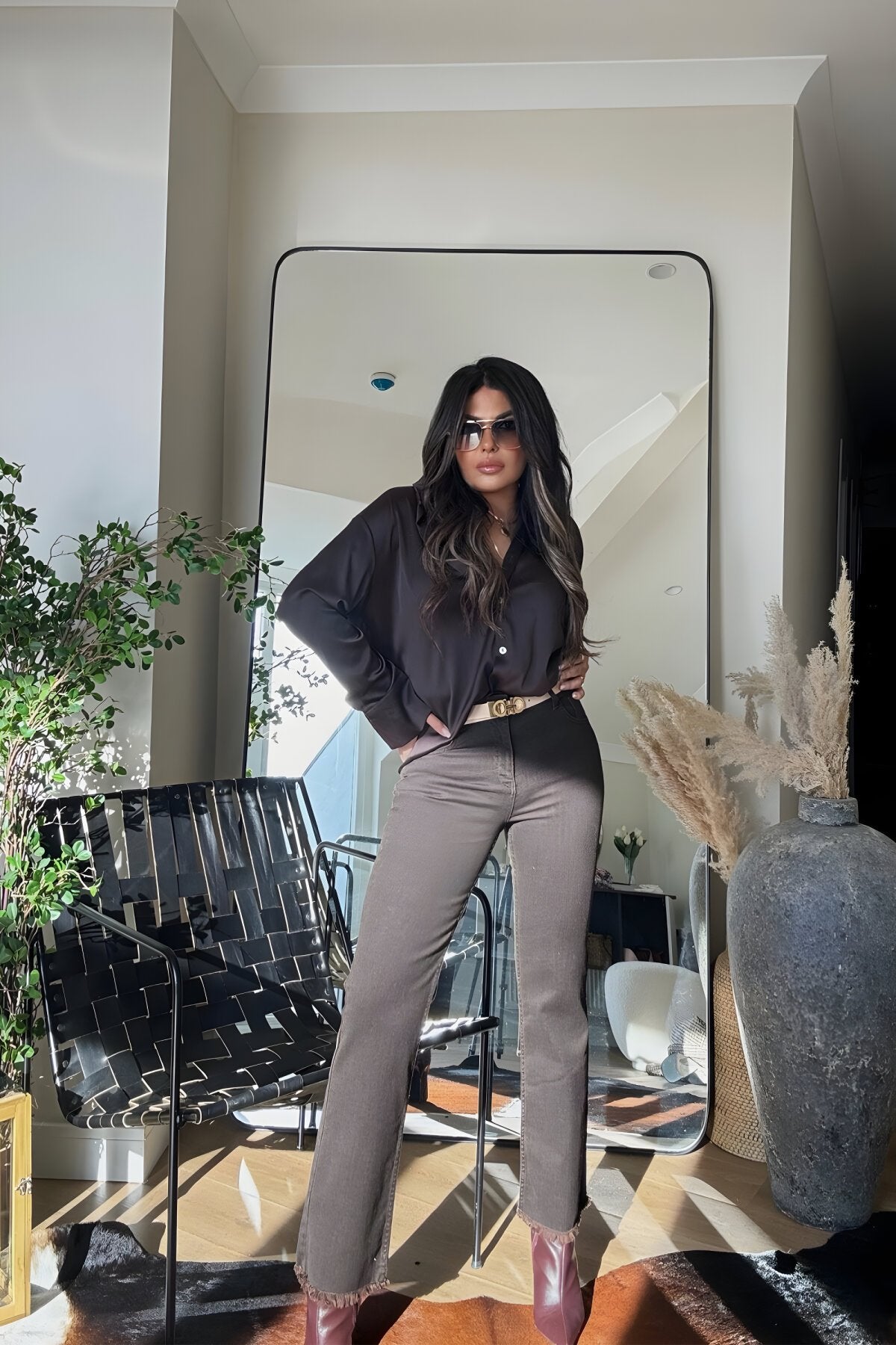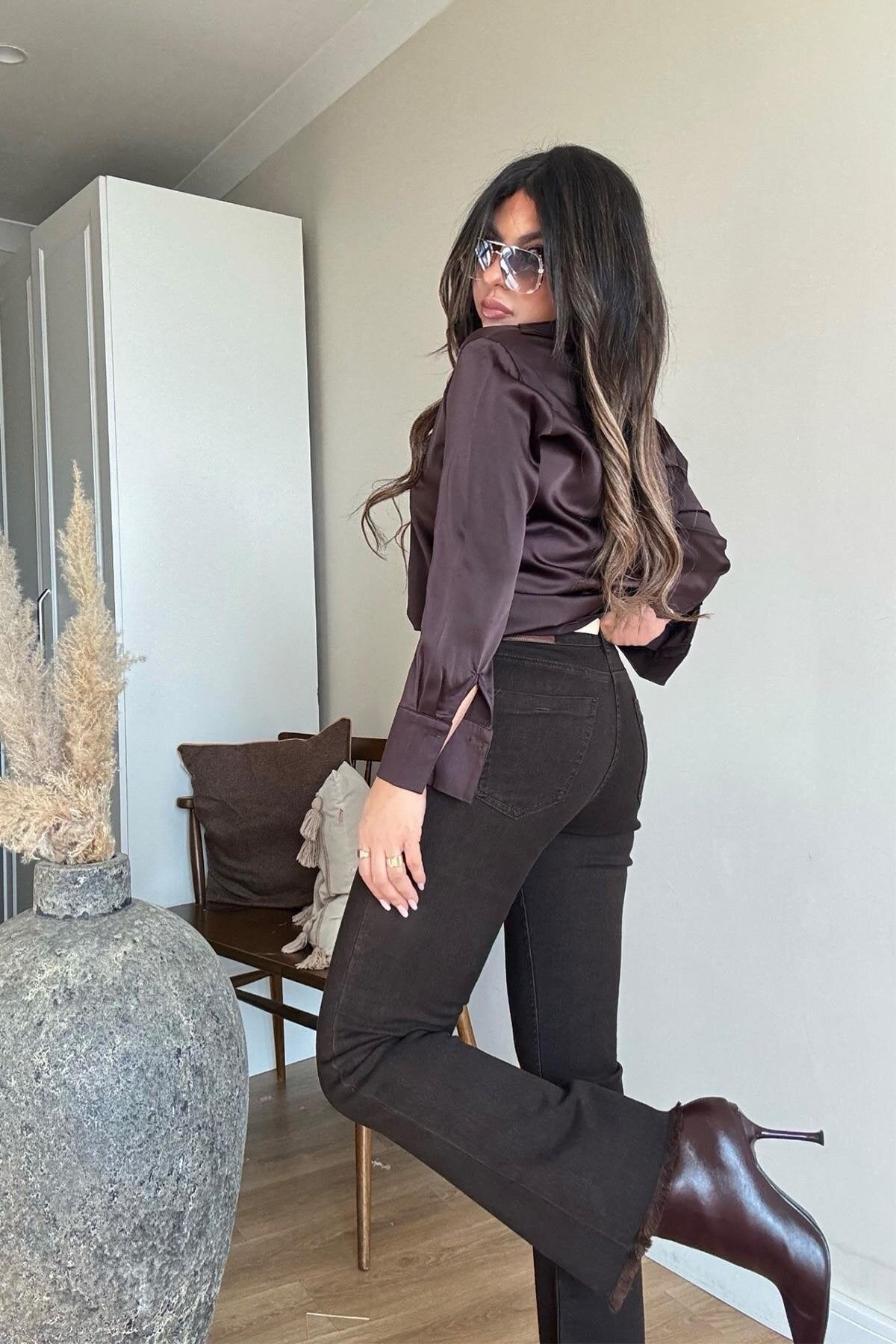 Mini Flare Jean Fringe Hem Pants - Dark Brown
