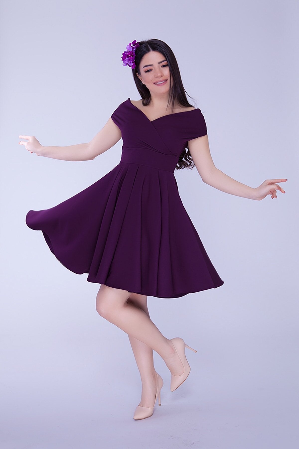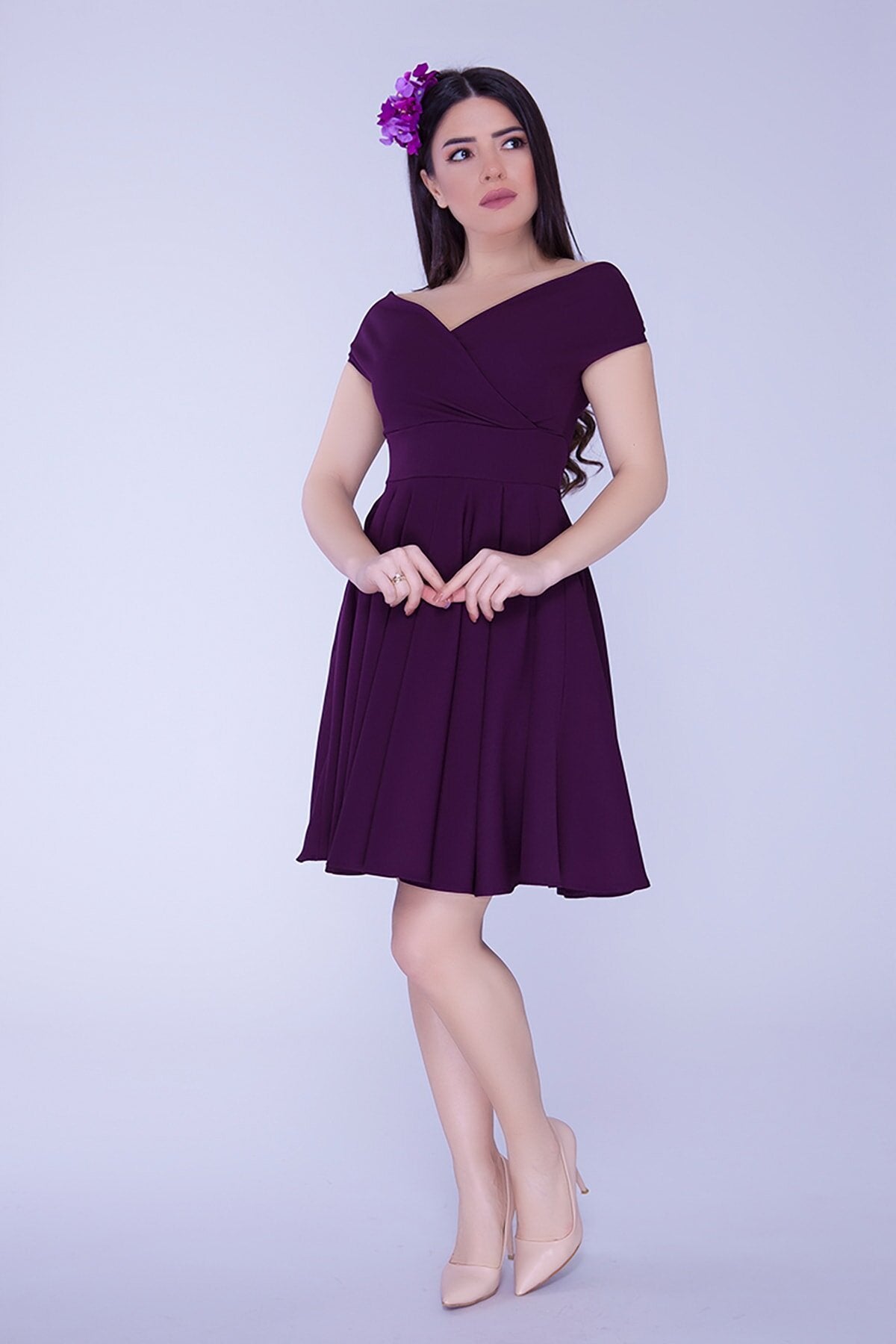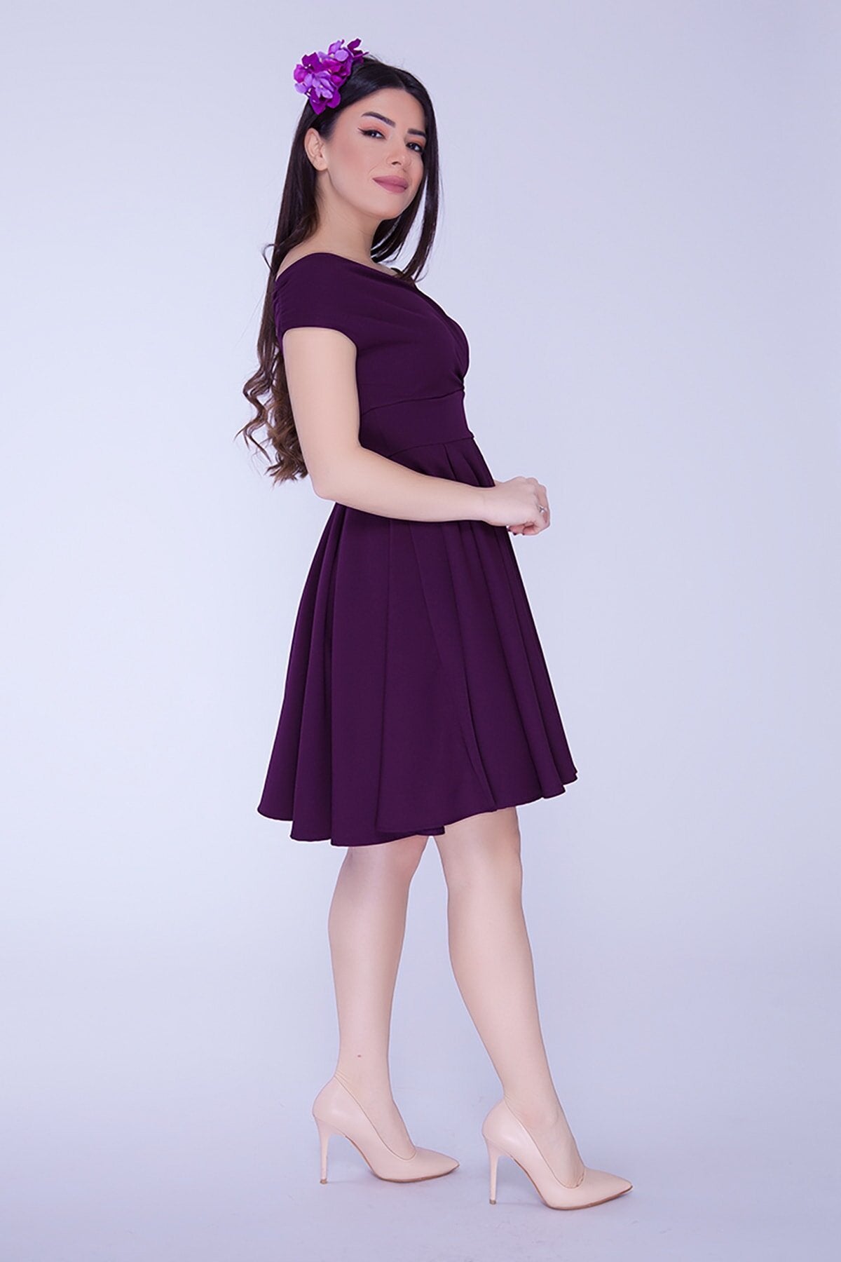 Mini Flared Draped Pleated Boat Neck Evening Dress - Plum