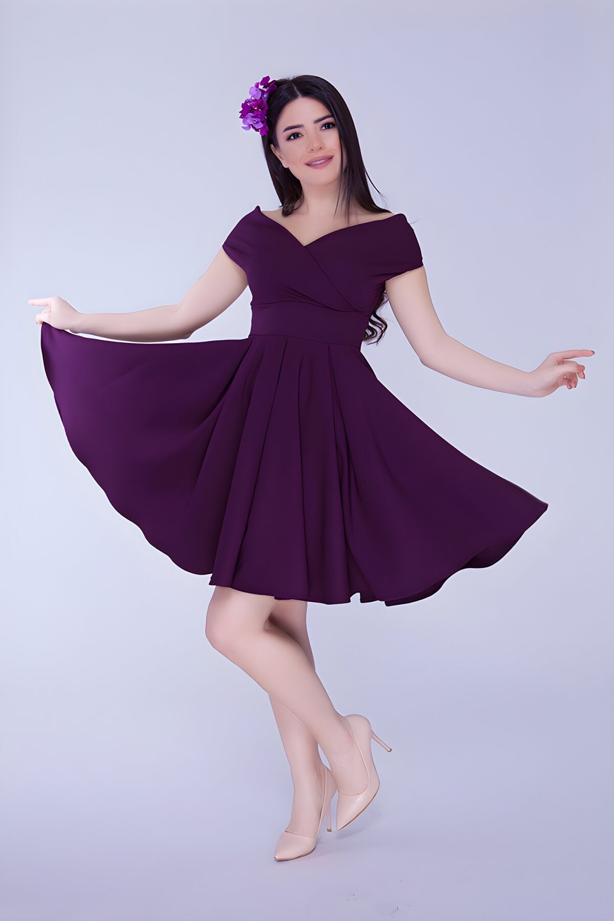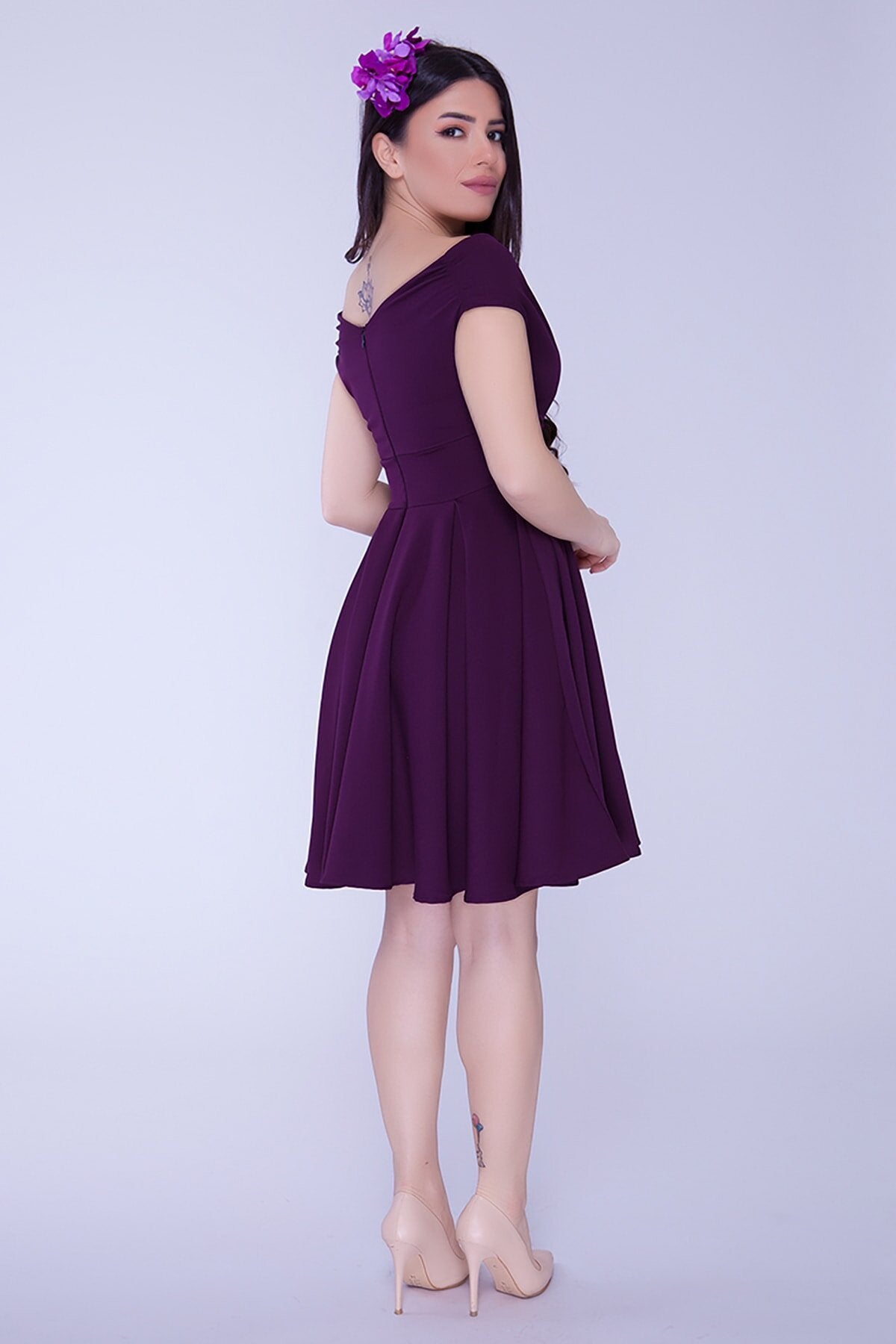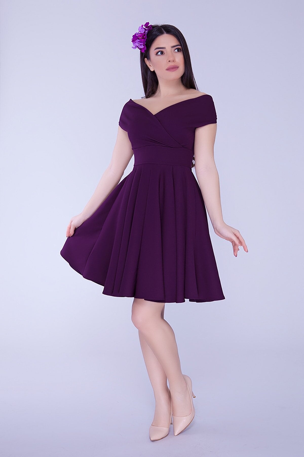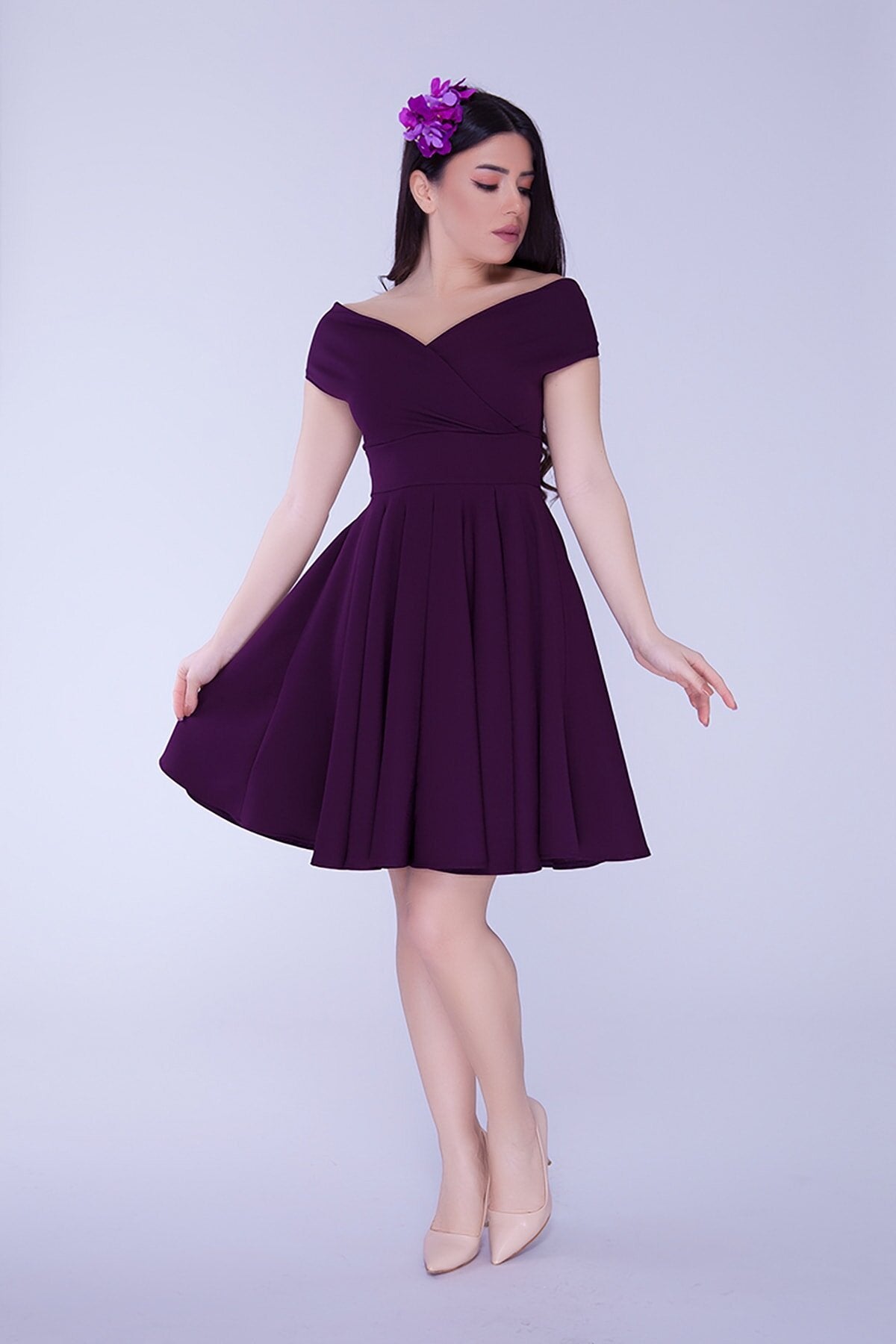 Mini Flared Draped Pleated Boat Neck Evening Dress - Plum