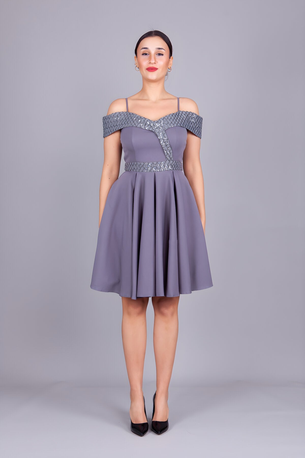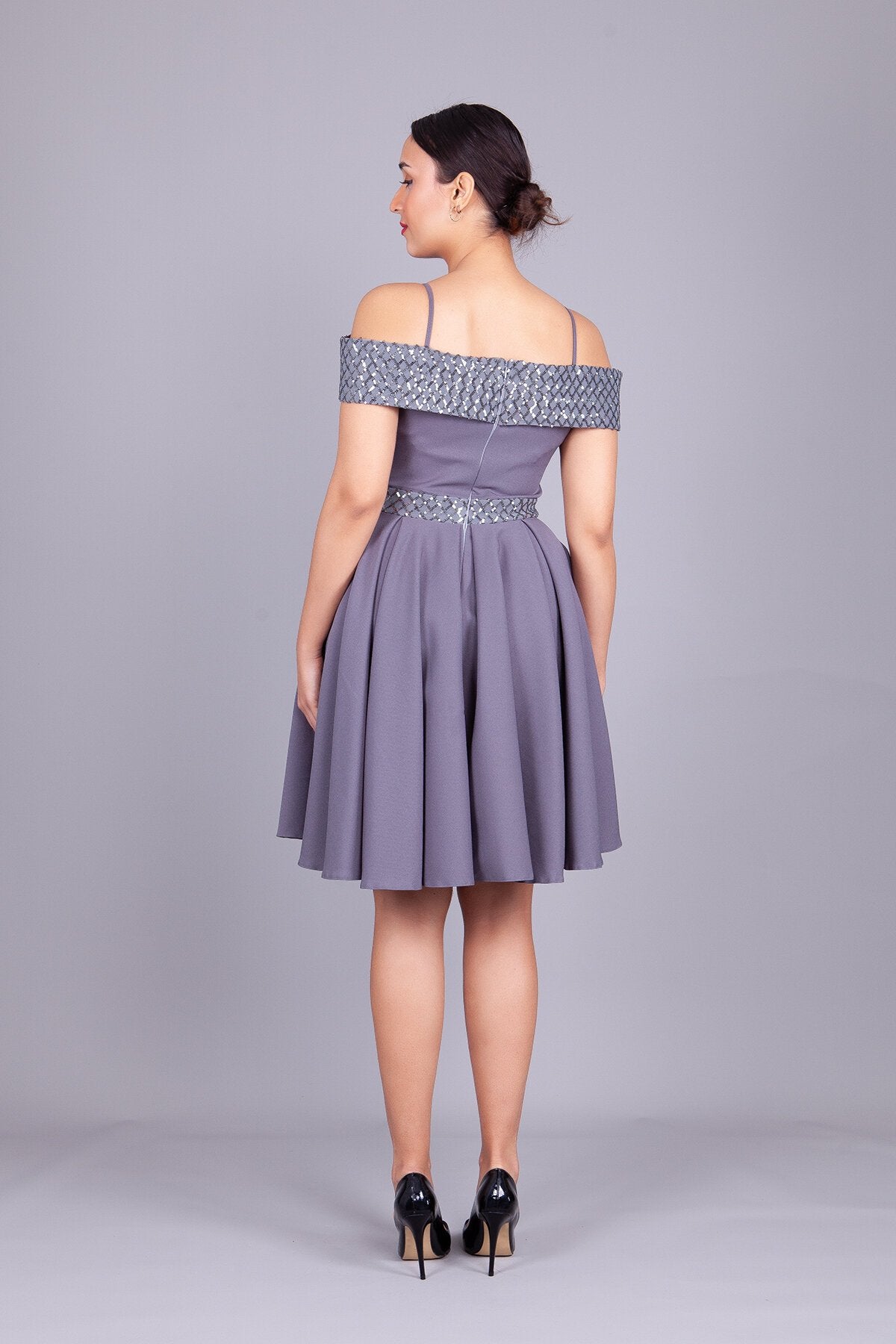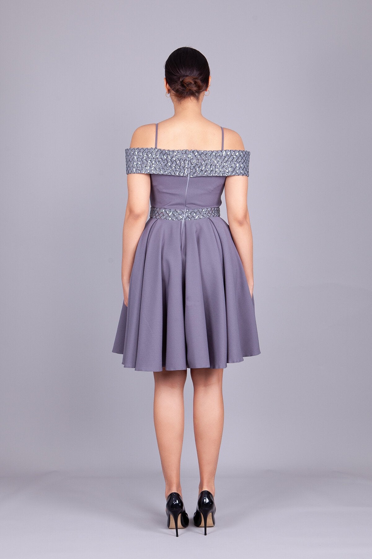 Mini Flared Off-the-Shoulder Strapped Checked Sequin-Detail Evening Dress - Grey