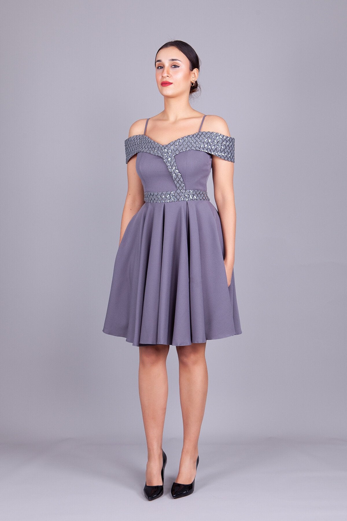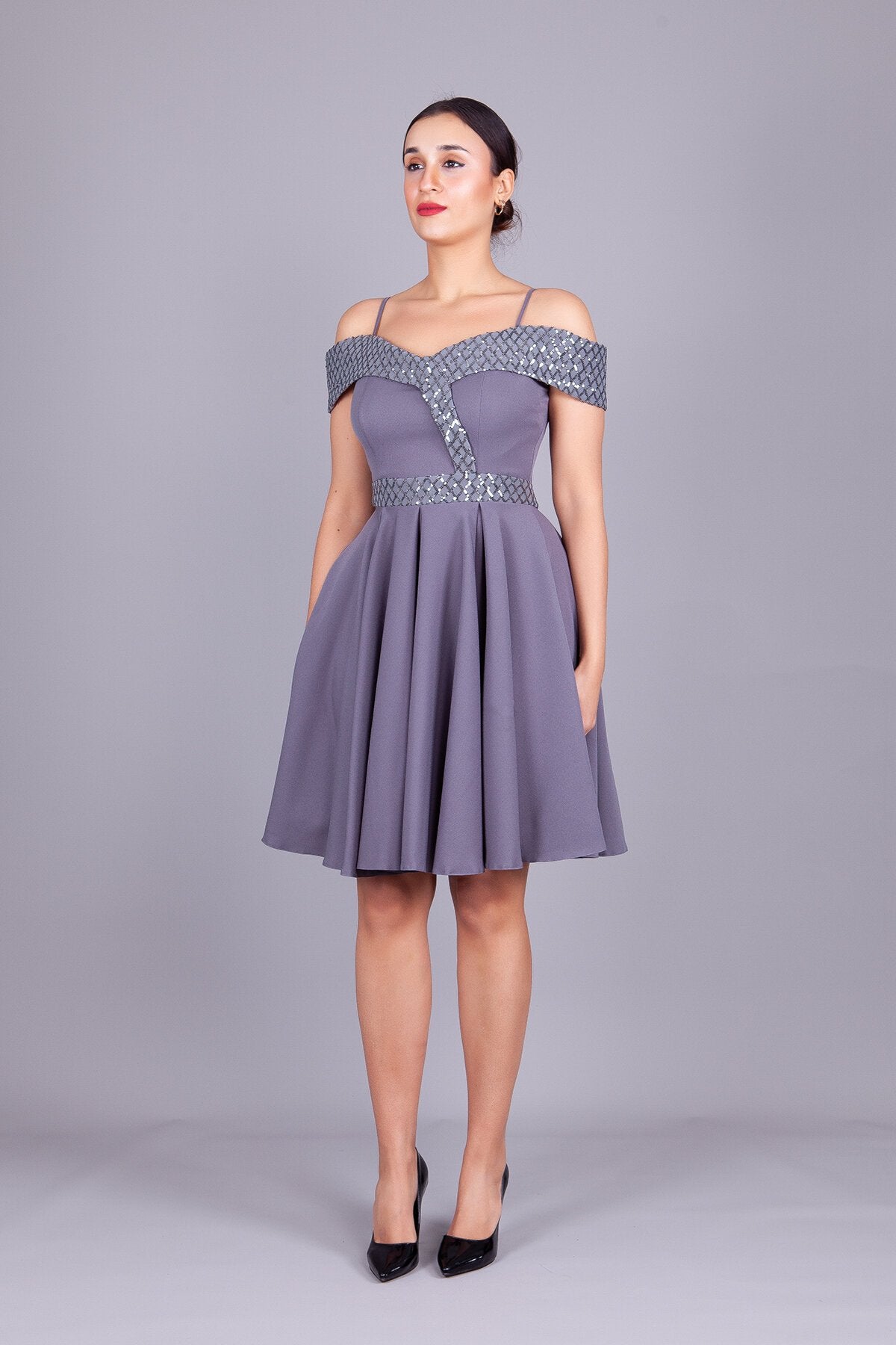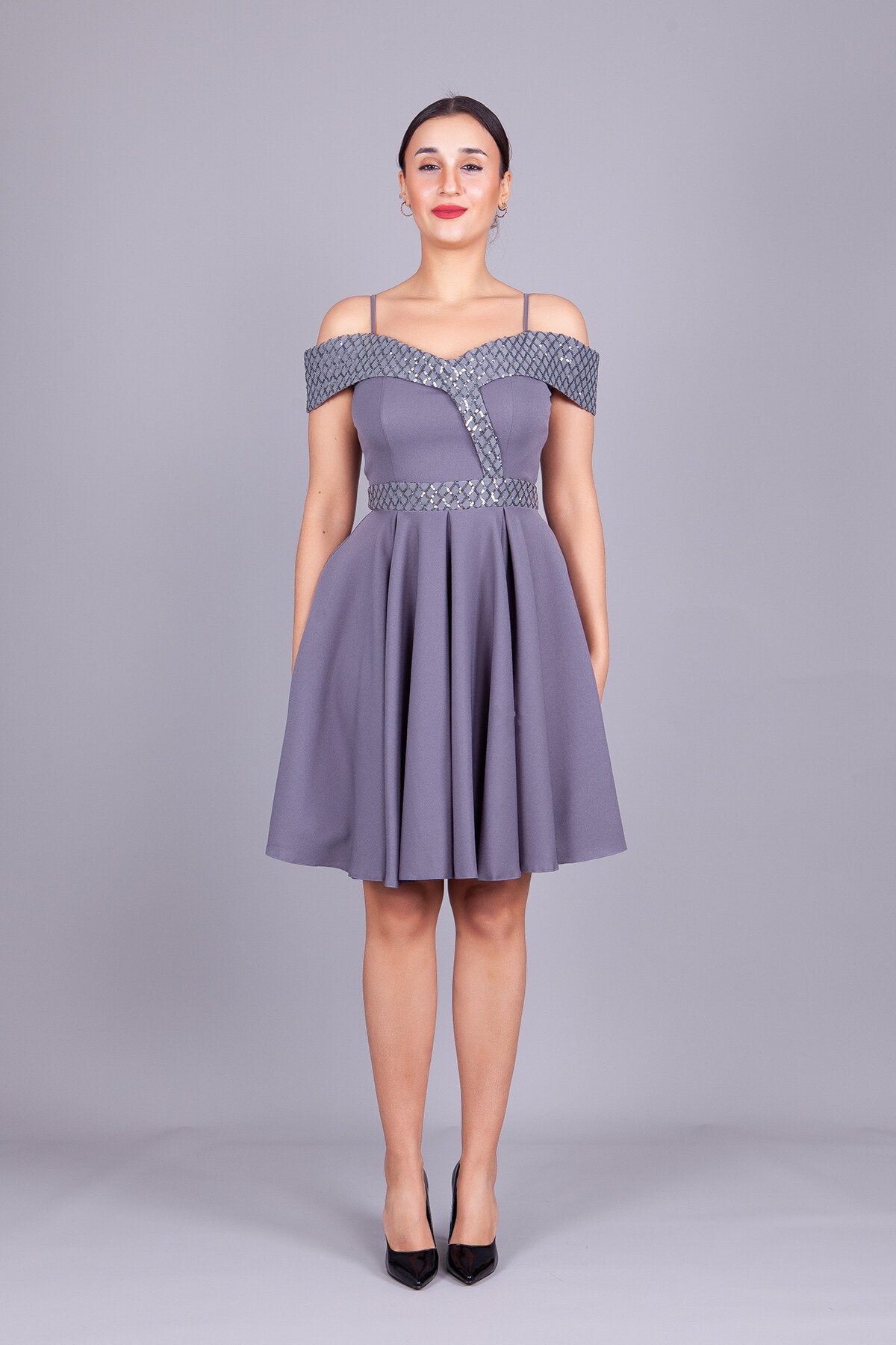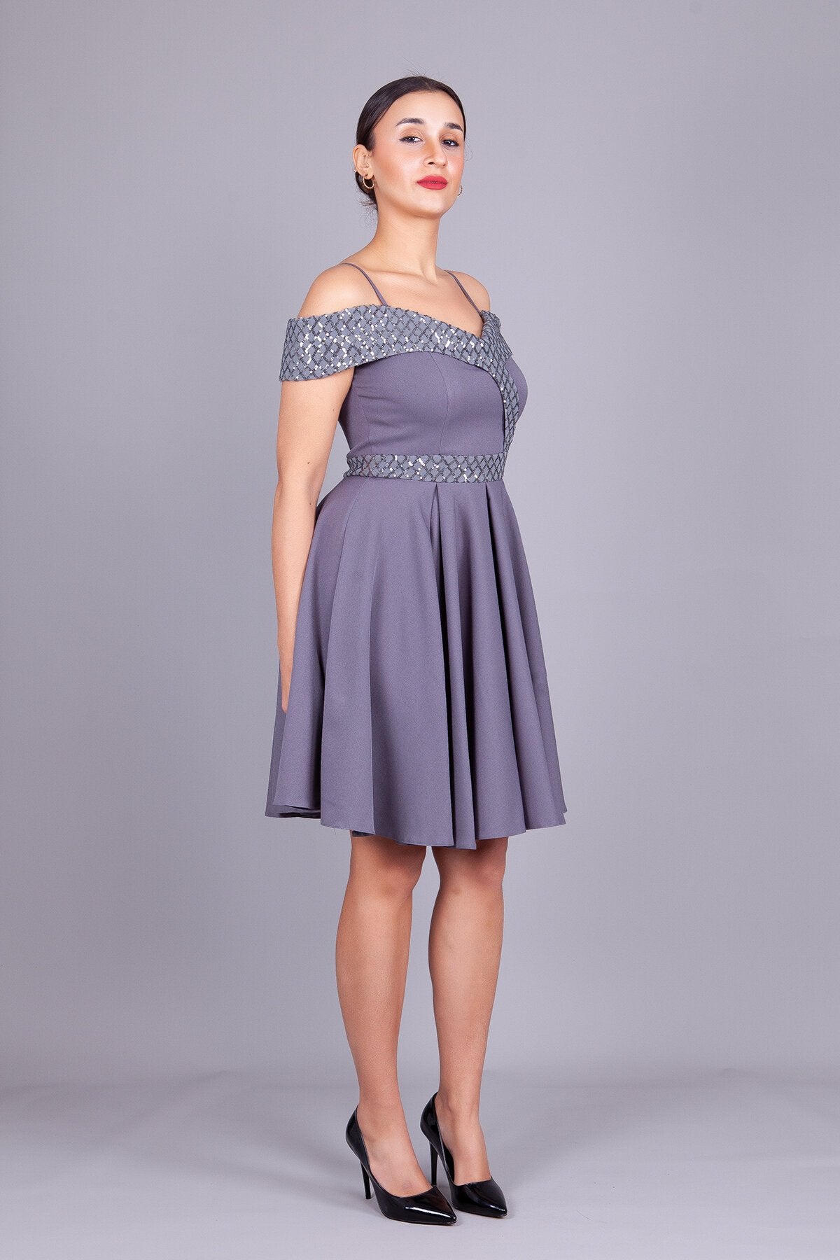 Mini Flared Off-the-Shoulder Strapped Checked Sequin-Detail Evening Dress - Grey