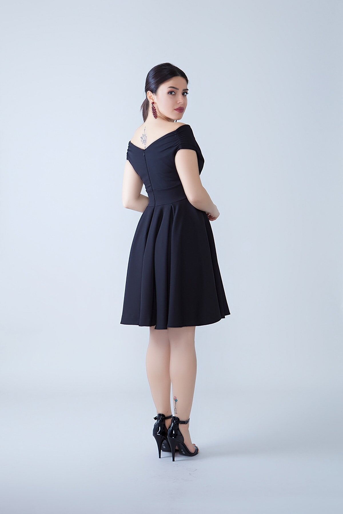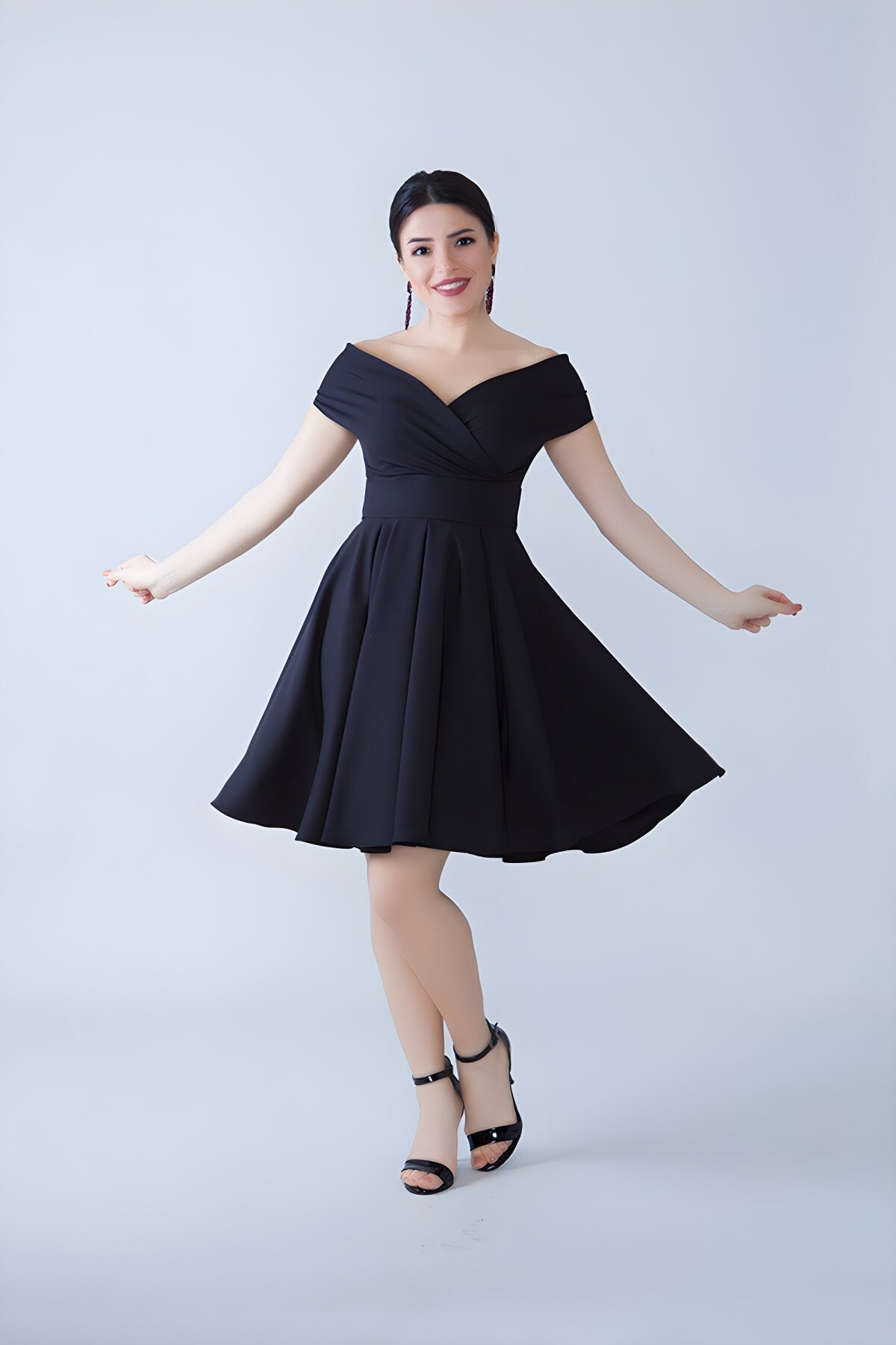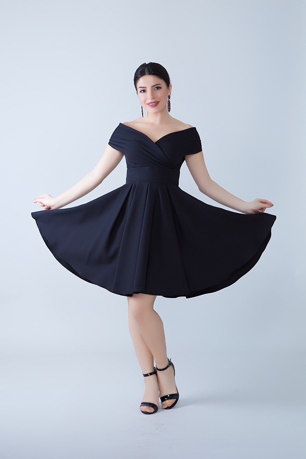 Mini Flared Pleated Boat Neck Evening Dress - Black