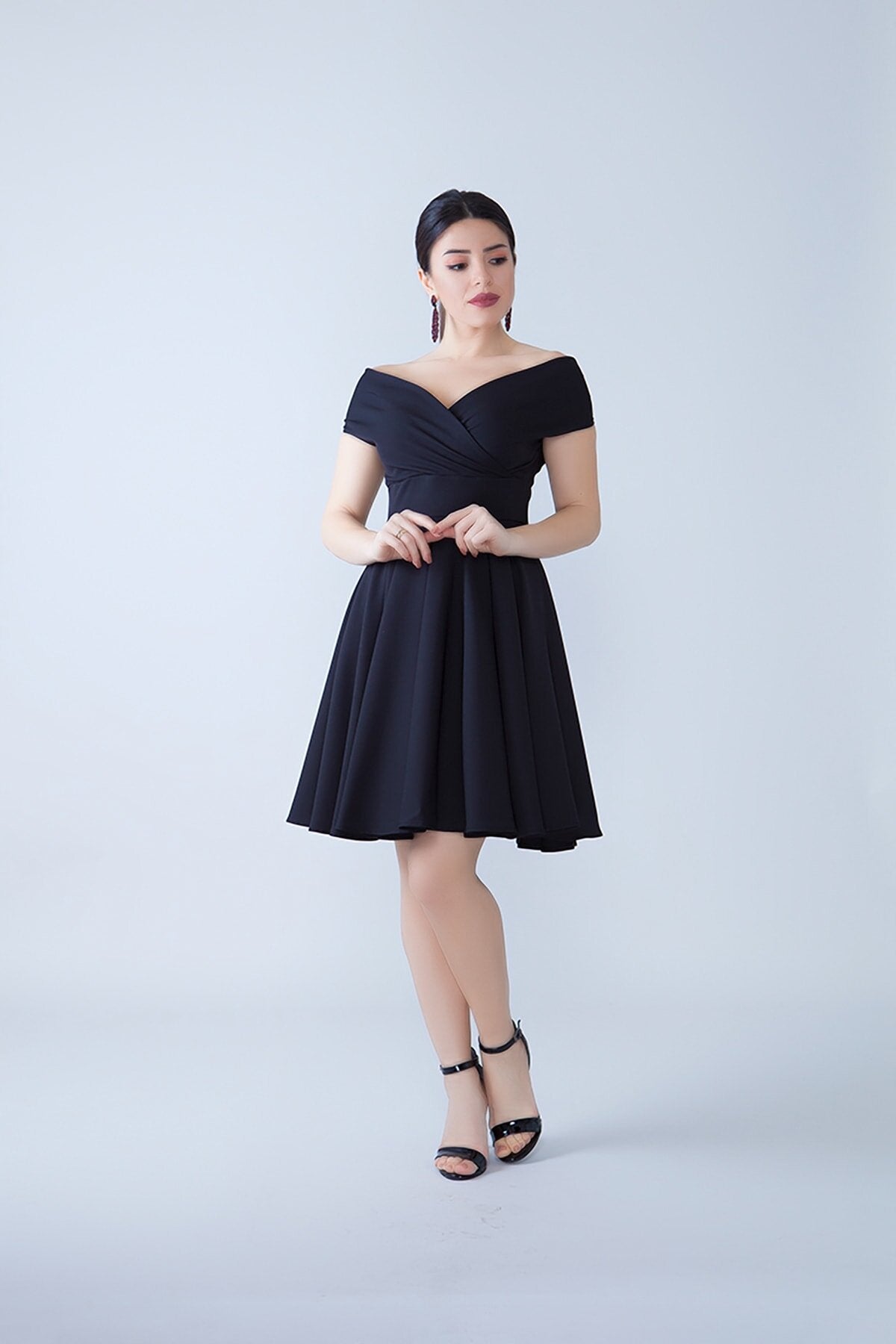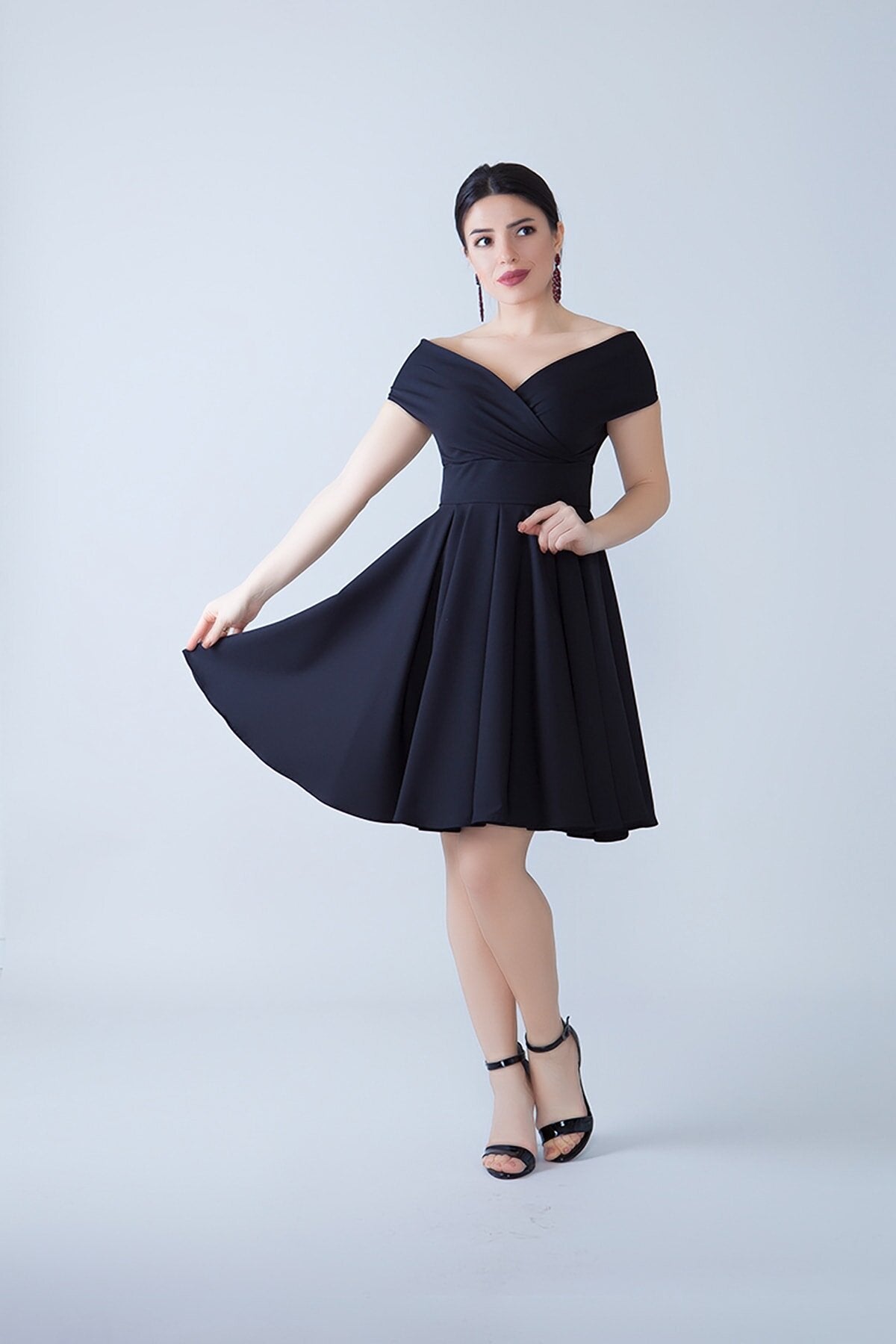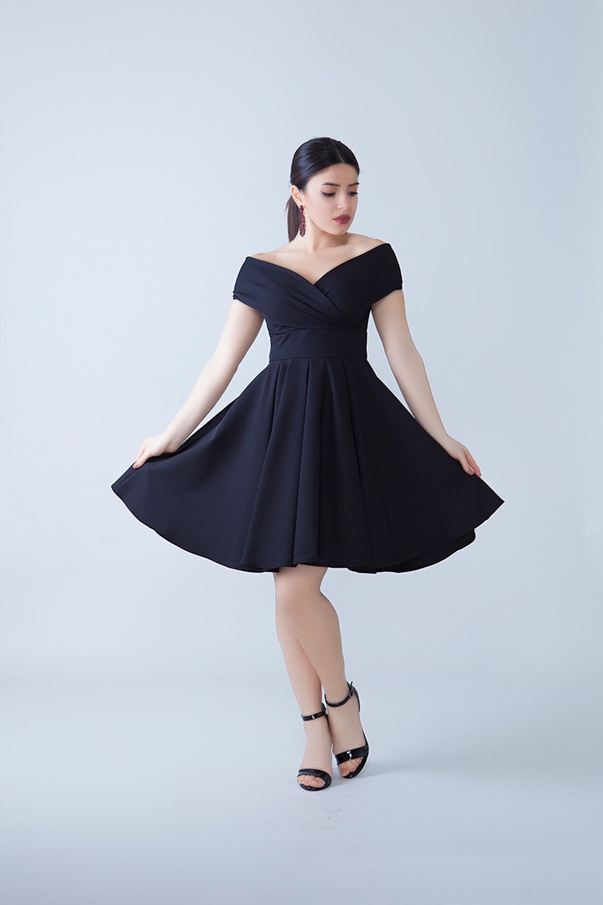 This mini flared evening dress is a masterclass in timeless sophistication. Featuring a stunning wrap-style bodice and a voluminous pleated skirt, it creates a feminine silhouette that radiates charm and grace for any special occasion.