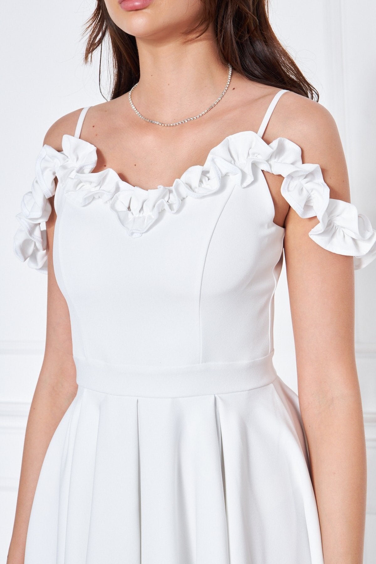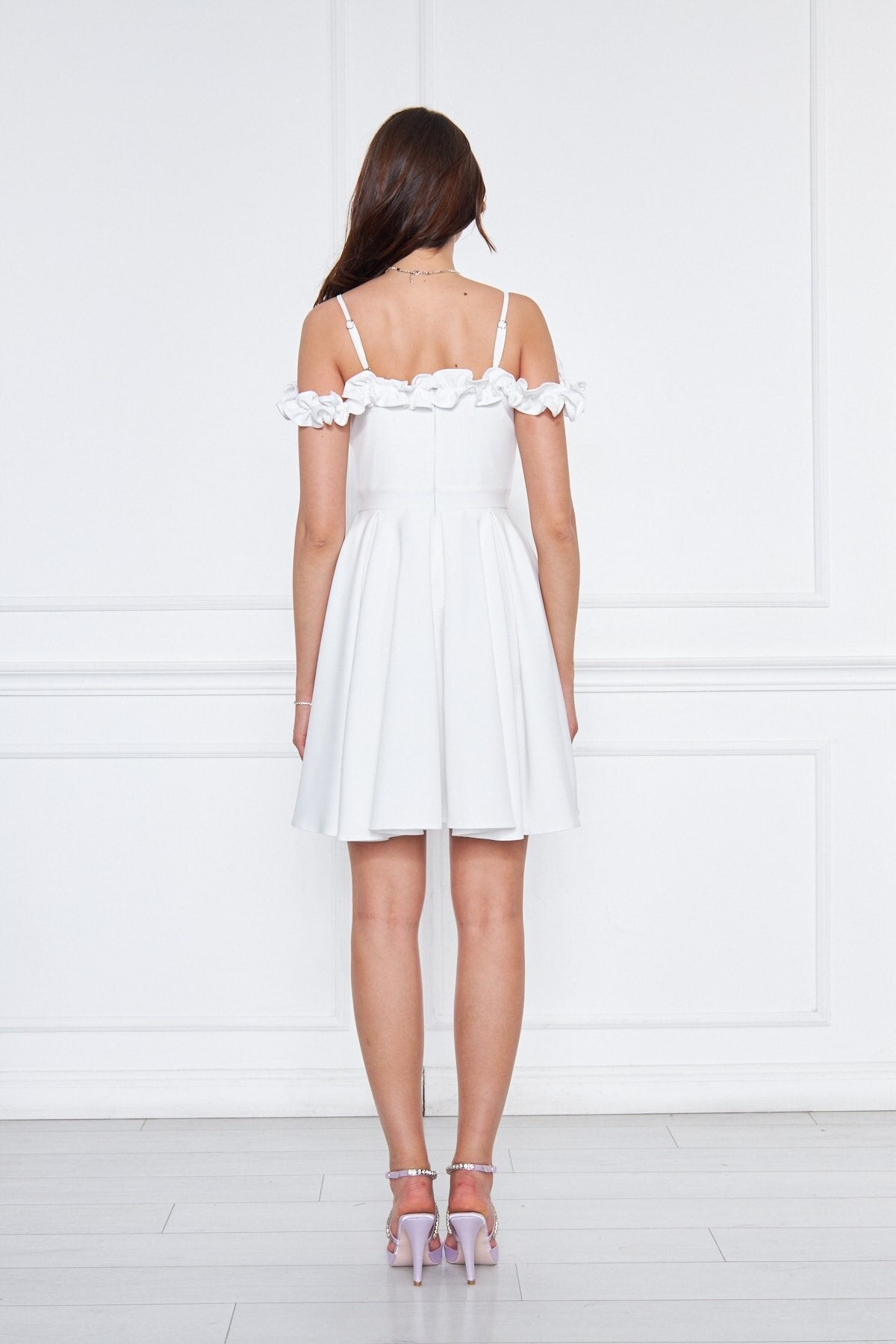 Mini Flared Pleated Ruffle Detail Evening Dress - White