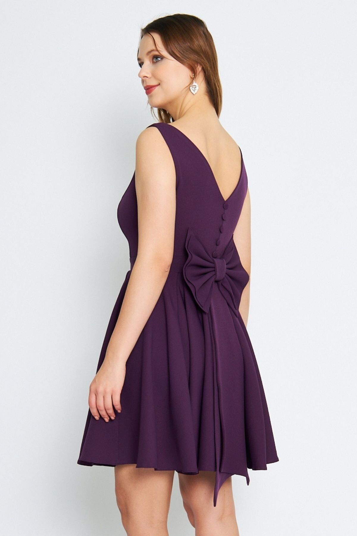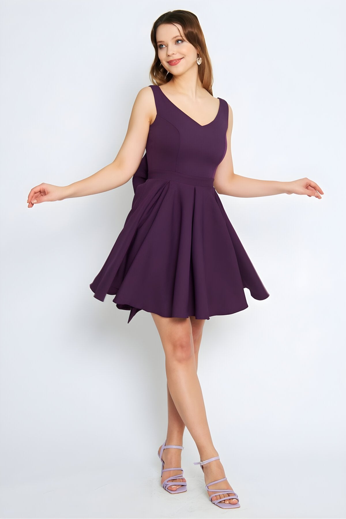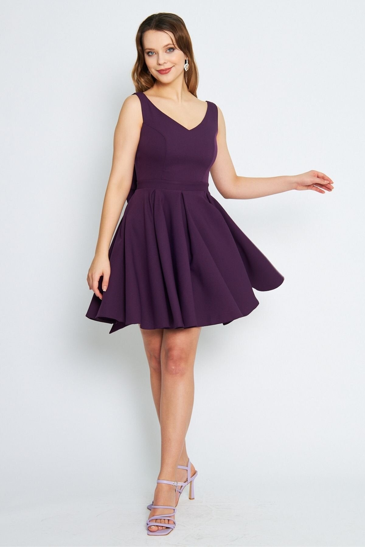 Mini Flared Pleated V-Neck Backless Evening Dress - Damson