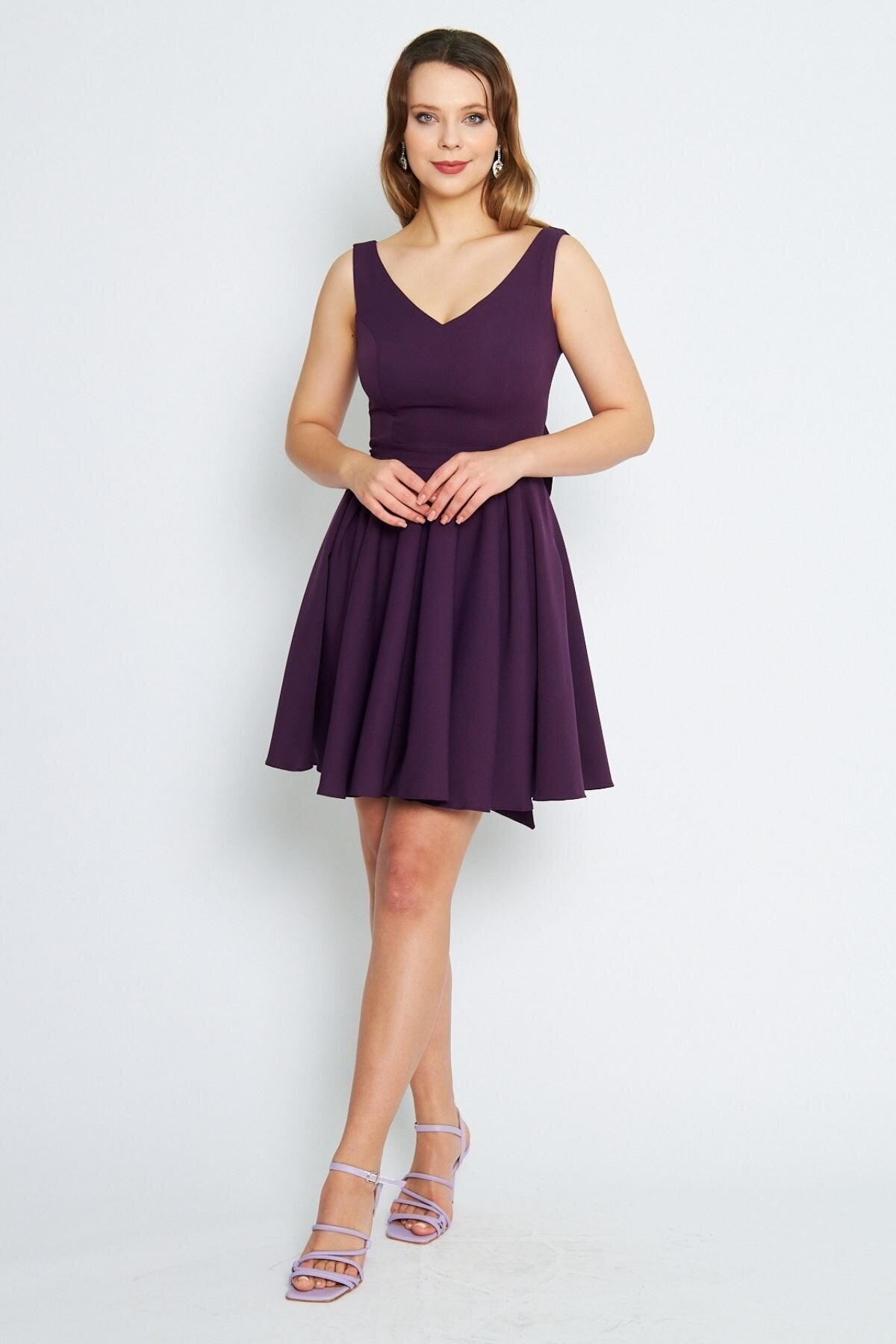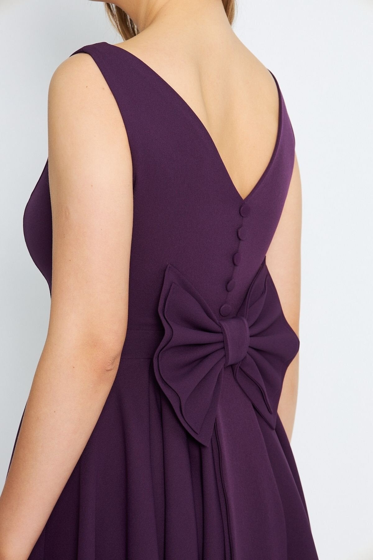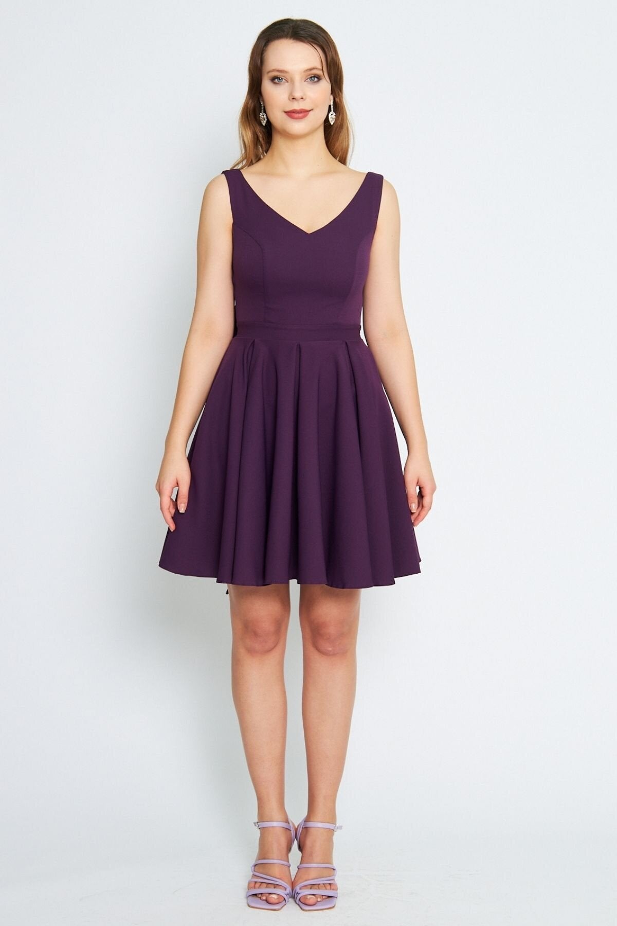 Mini Flared Pleated V-Neck Backless Evening Dress - Damson