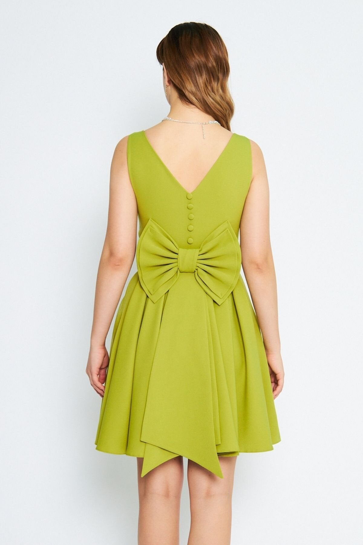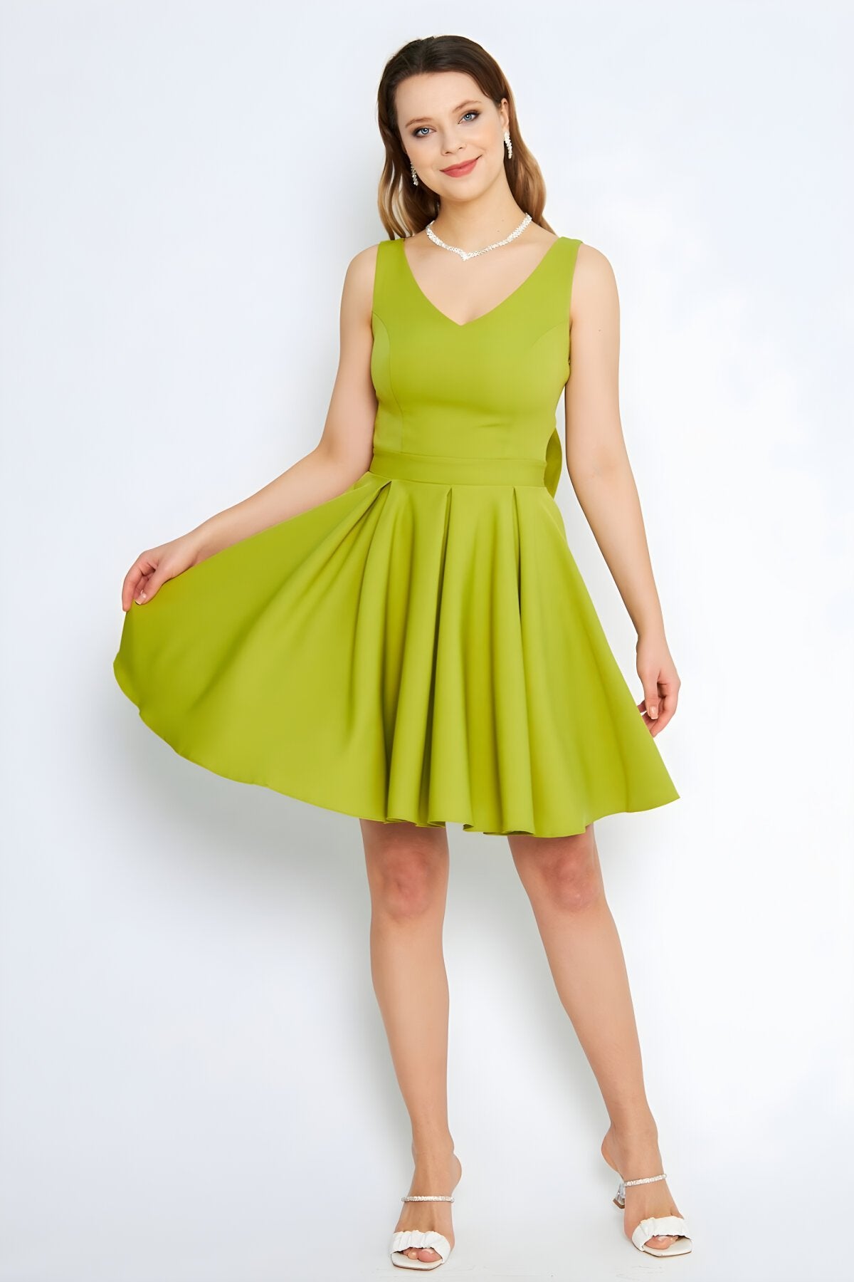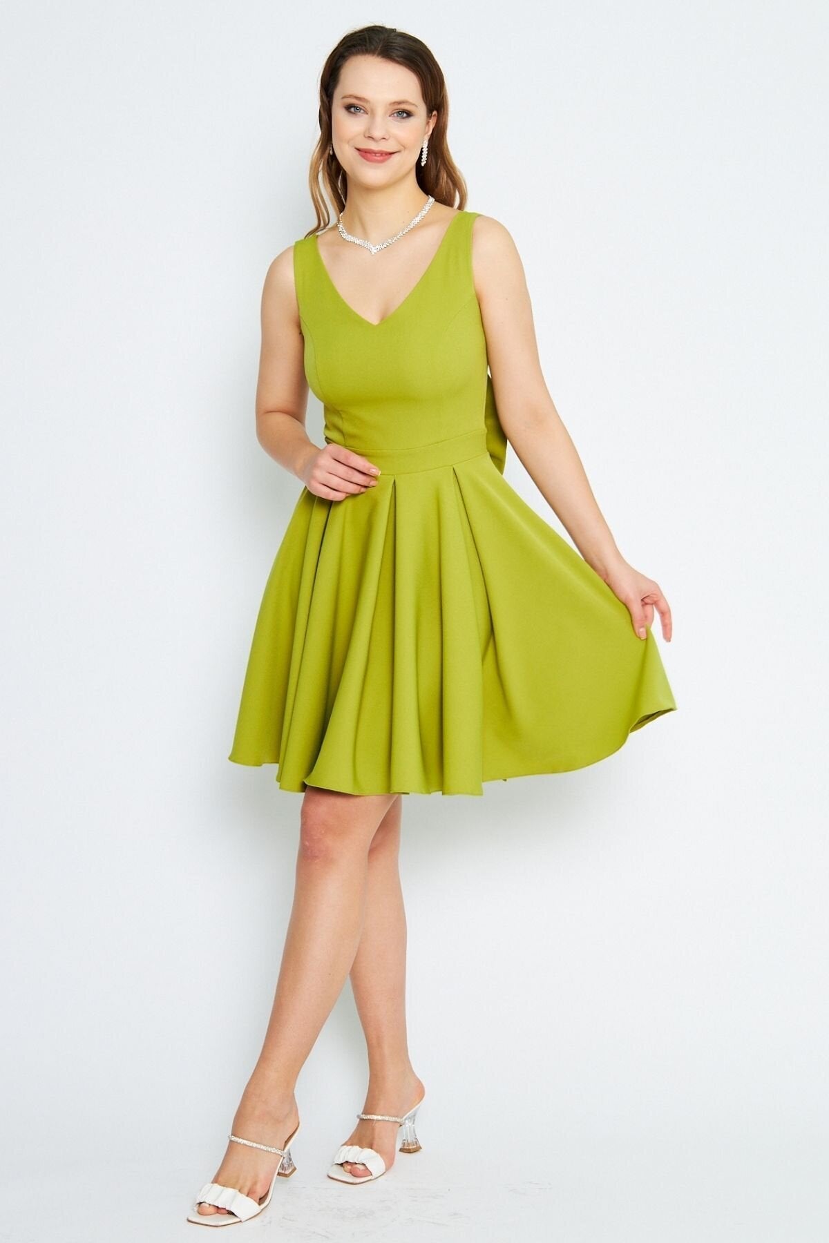 Mini Flared Pleated V-Neck Evening Dress with Back Bow - Pistachio Green