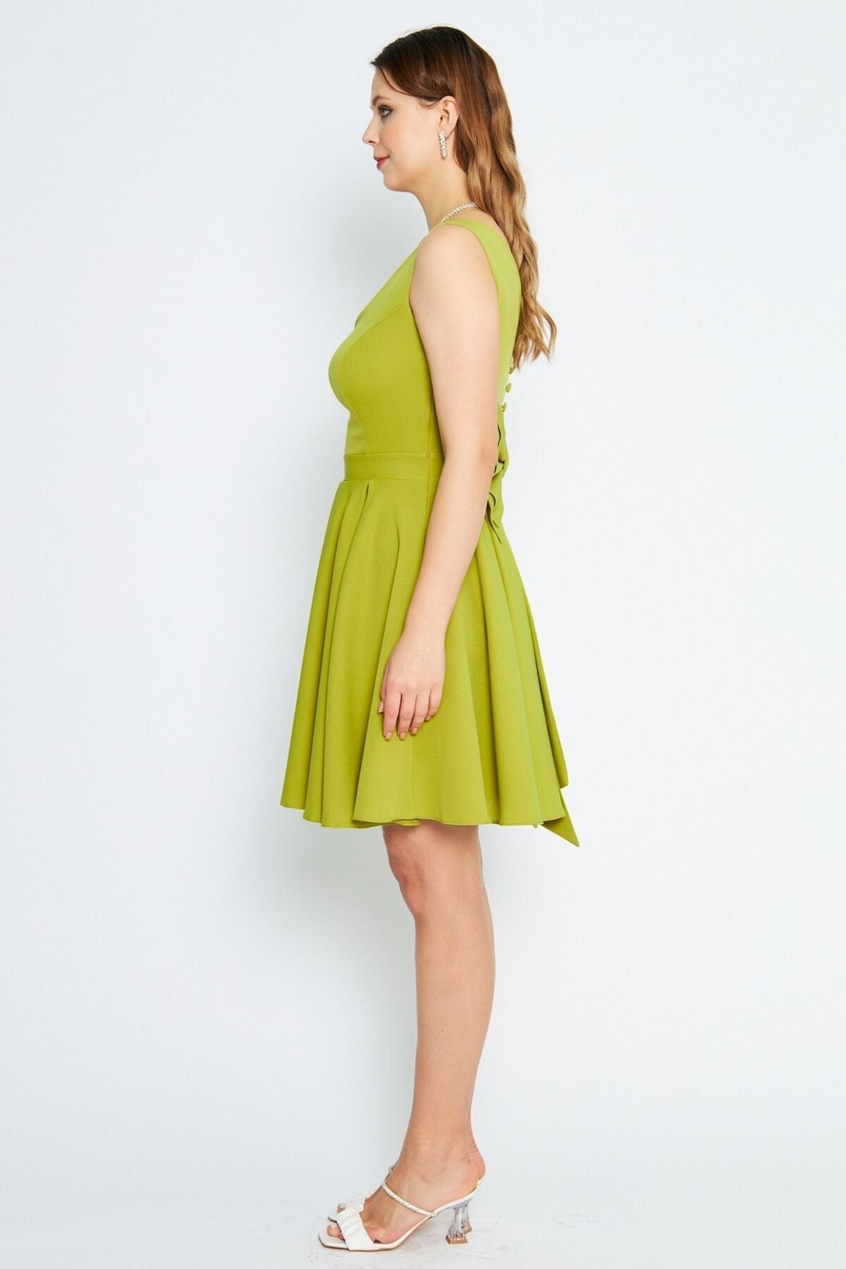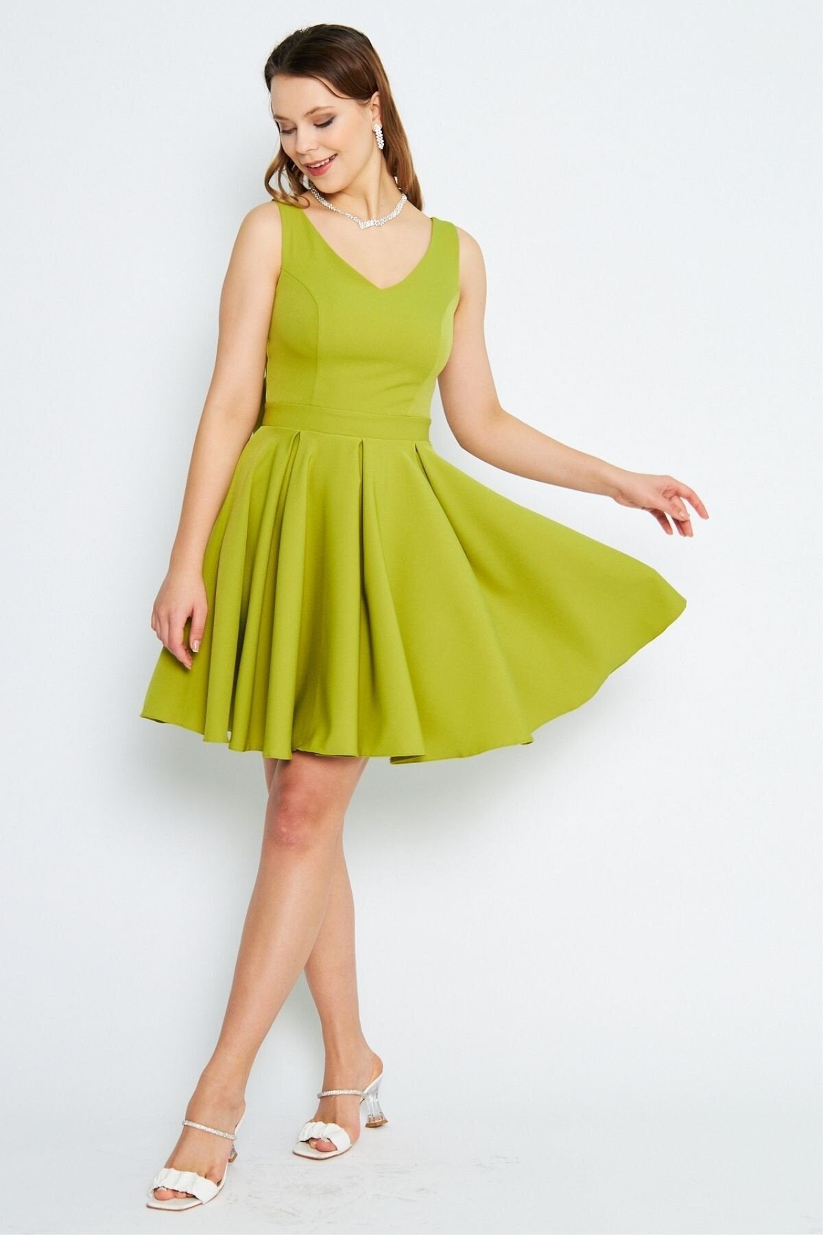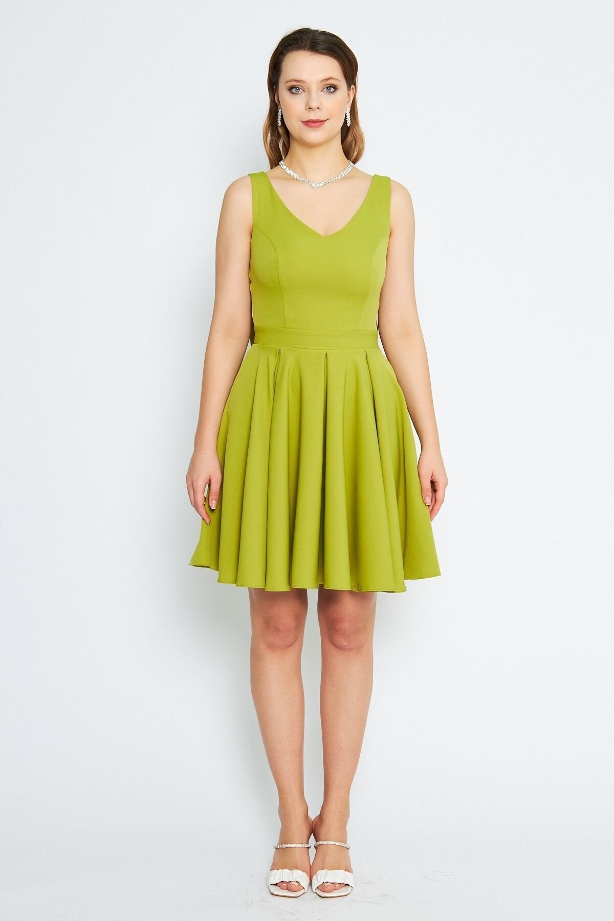 Mini Flared Pleated V-Neck Evening Dress with Back Bow - Pistachio Green