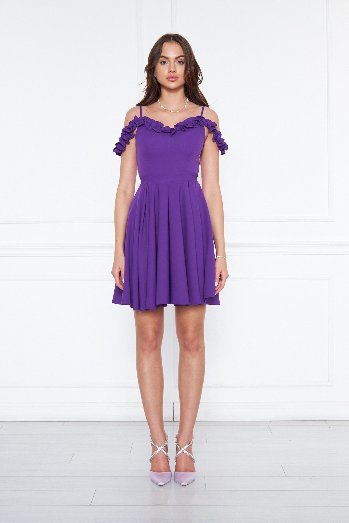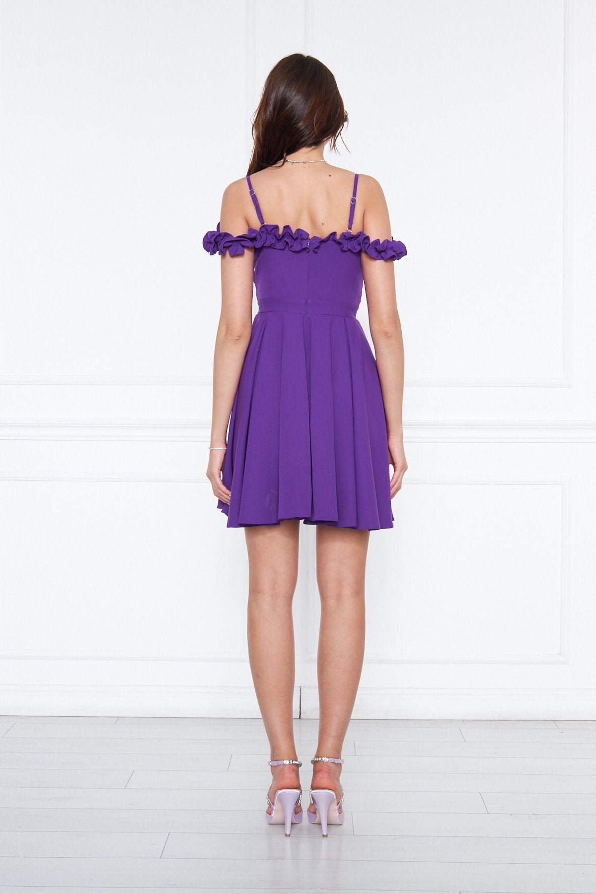 Mini Flared Pleated Woven Adjustable Strappy Ruffle Detail Collar Evening Dress - Purple