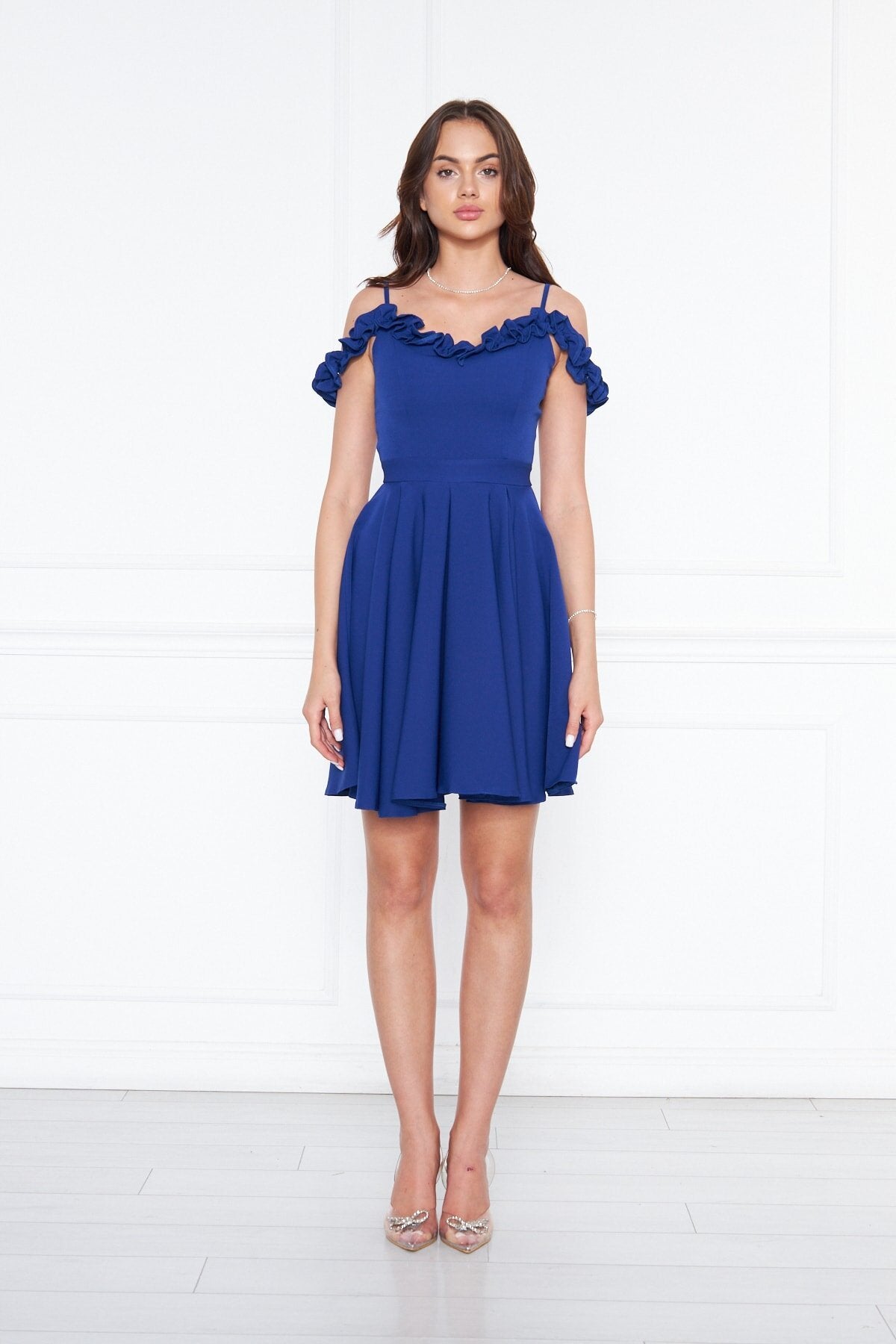 Mini Flared Pleated Woven Evening Dress - Sax Blue