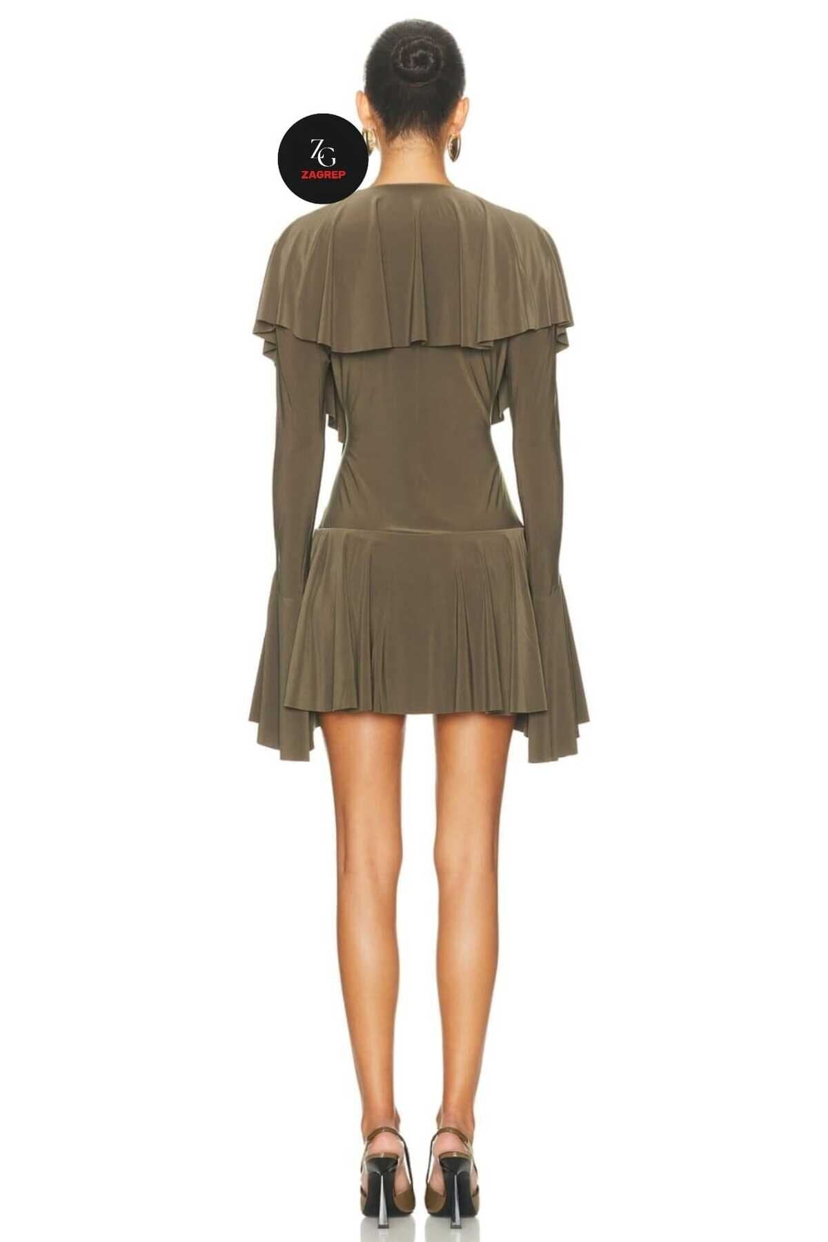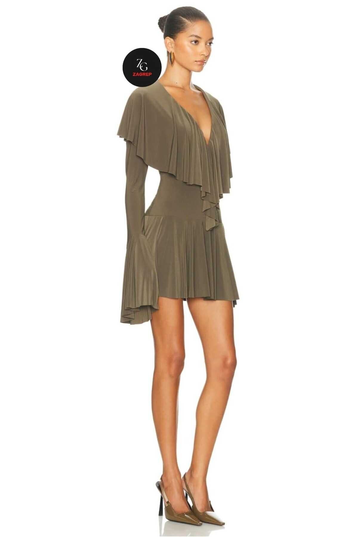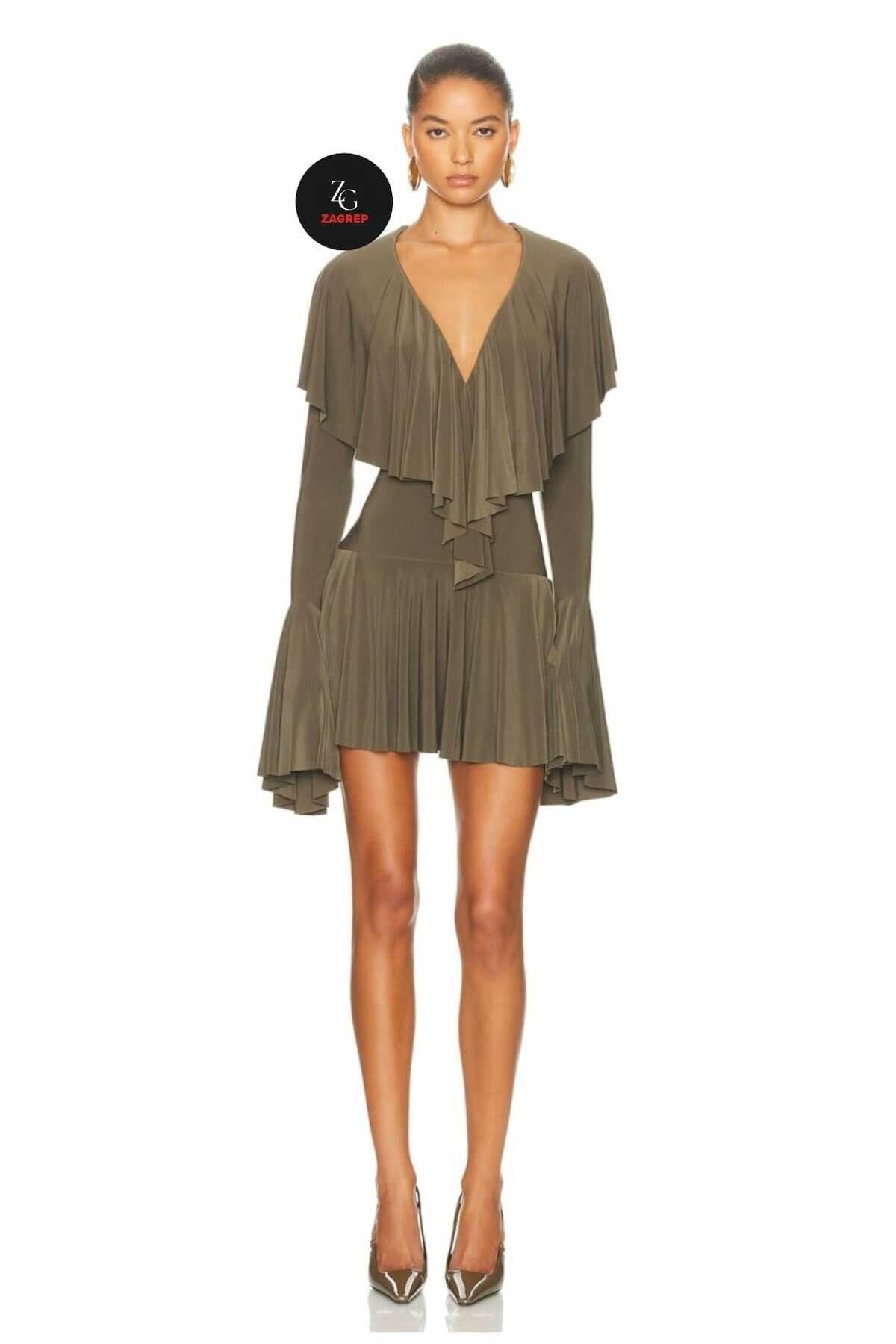 This Mini Flounced Ruffled Evening Dress in a sophisticated khaki hue masterfully combines modern allure with whimsical movement. Its fluid silhouette and architectural details create a captivating look that is both bold and refined, making it an essential piece for the contemporary wardrobe.
