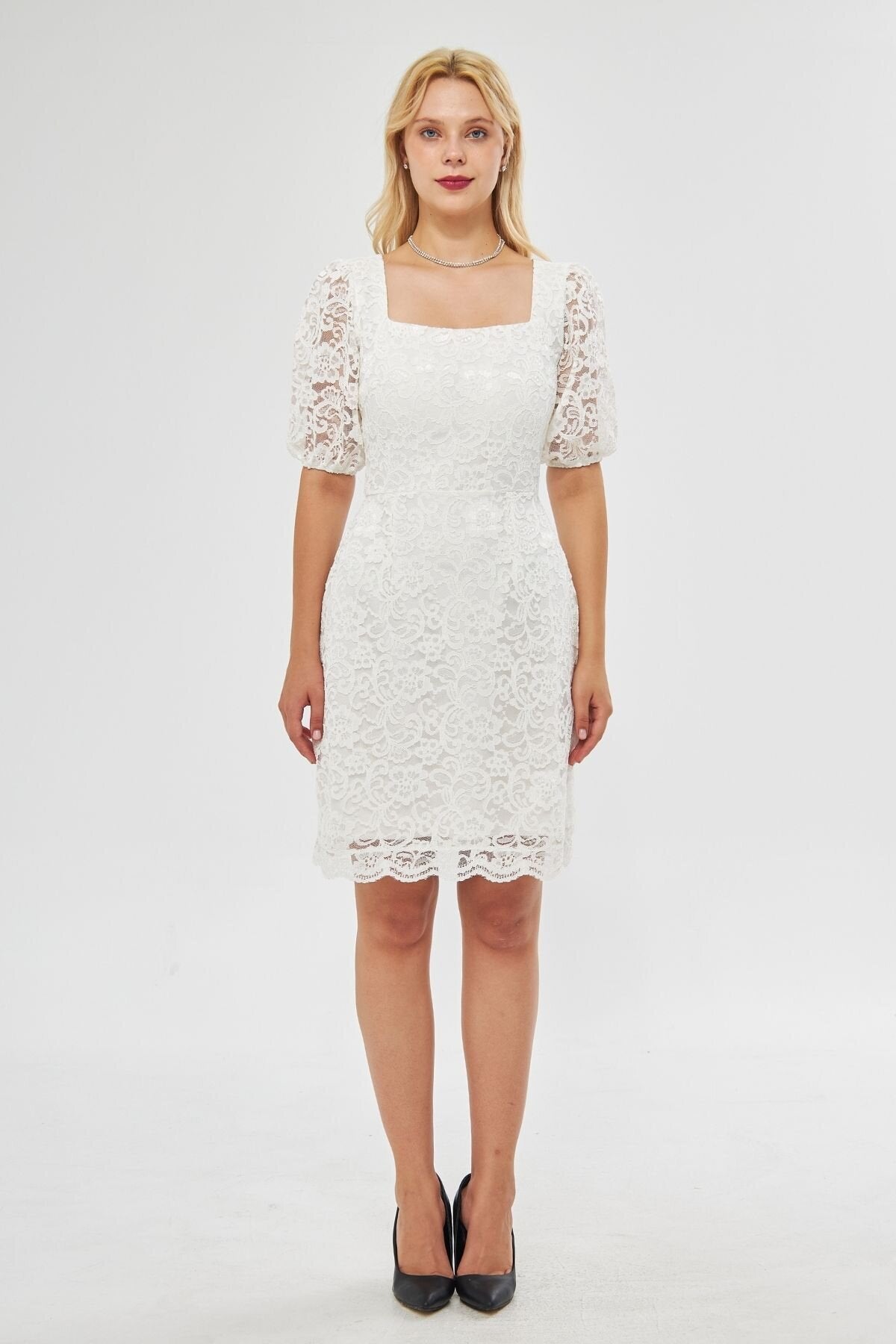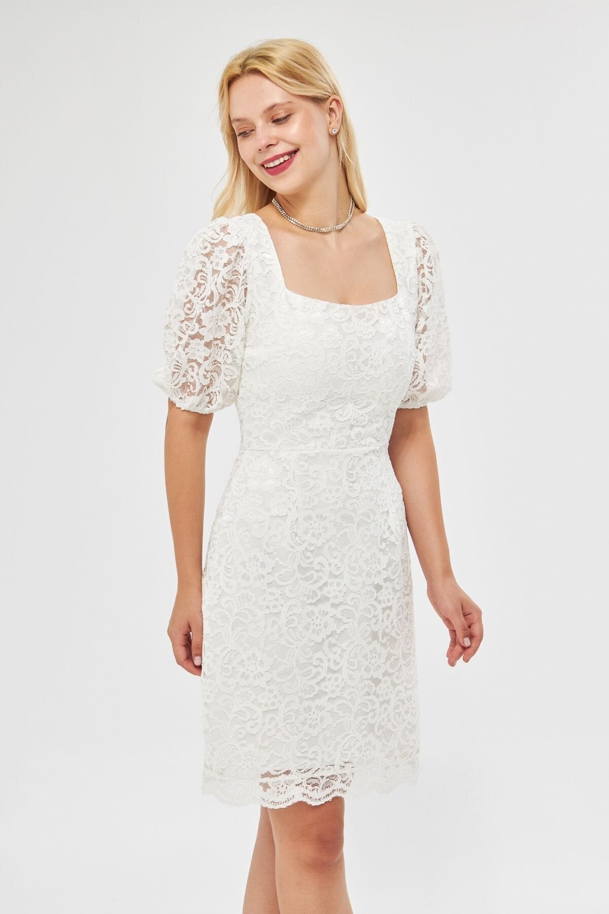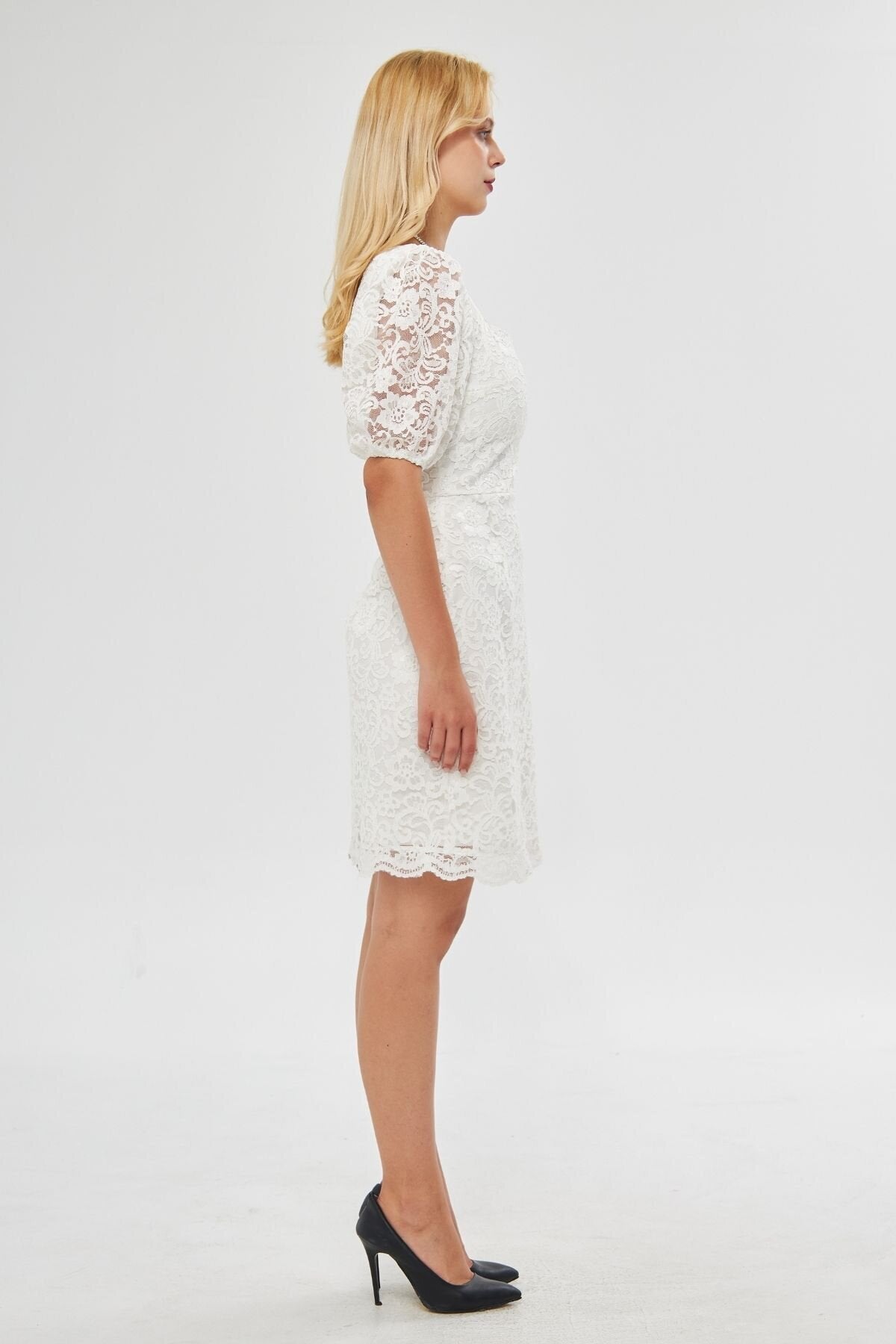 Mini French Lace Balloon Sleeve Evening Dress - White